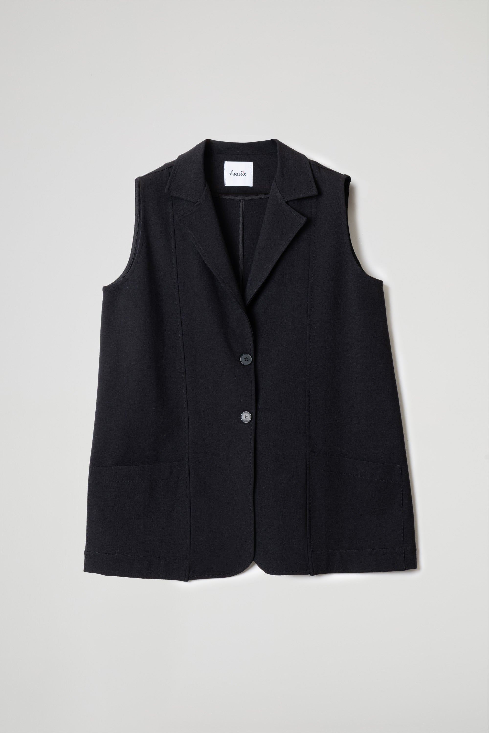 GILET OVER IN TESSUTO PUNTO MILANO DI VISCOSA ELASTICIZZATA, MANICA LUNGA,IMPUNTURA FRONTALE, COLLO REVERS, MAXI TASCHE A TOPPA, SPACCHETTO SUL RETRO, CHIUSURA CON BOTTONE. LINEA A TRAPEZIO.