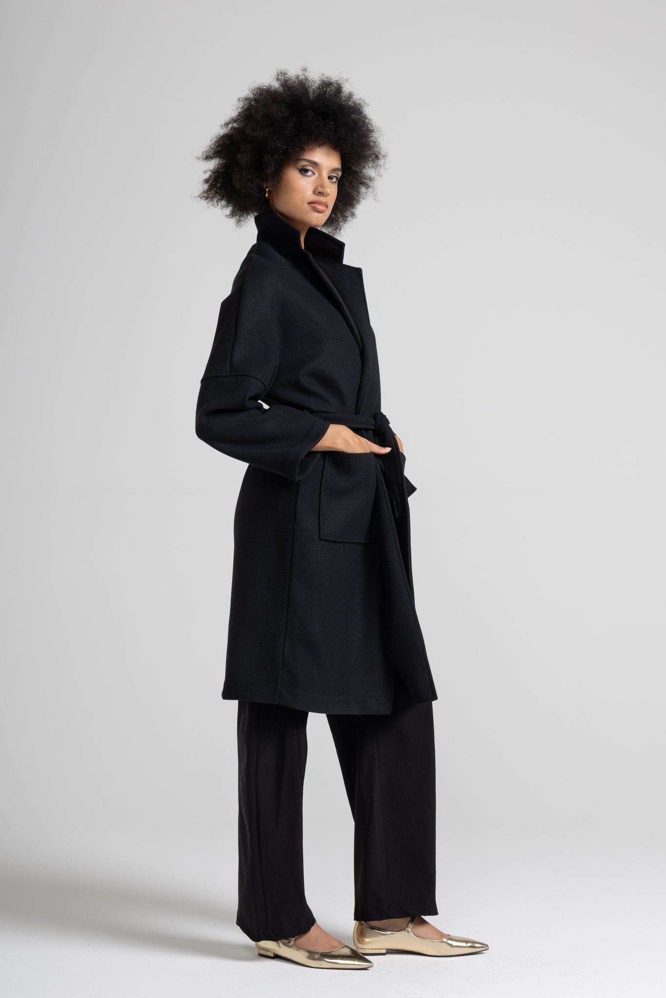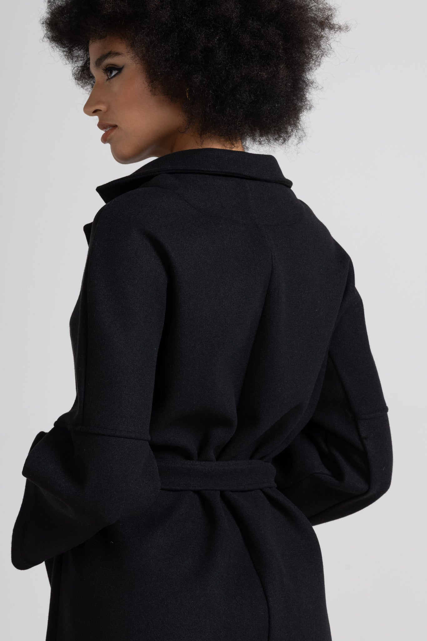 Collo a reverse, manche lunghe con taglio leggermente sceso, chiusura tramite cintura in vita, ampie asole sui fianchi, due tasche applicate frontali, ampie e pratiche, cucitura centrale verticale sul retro. Linea confortevole.