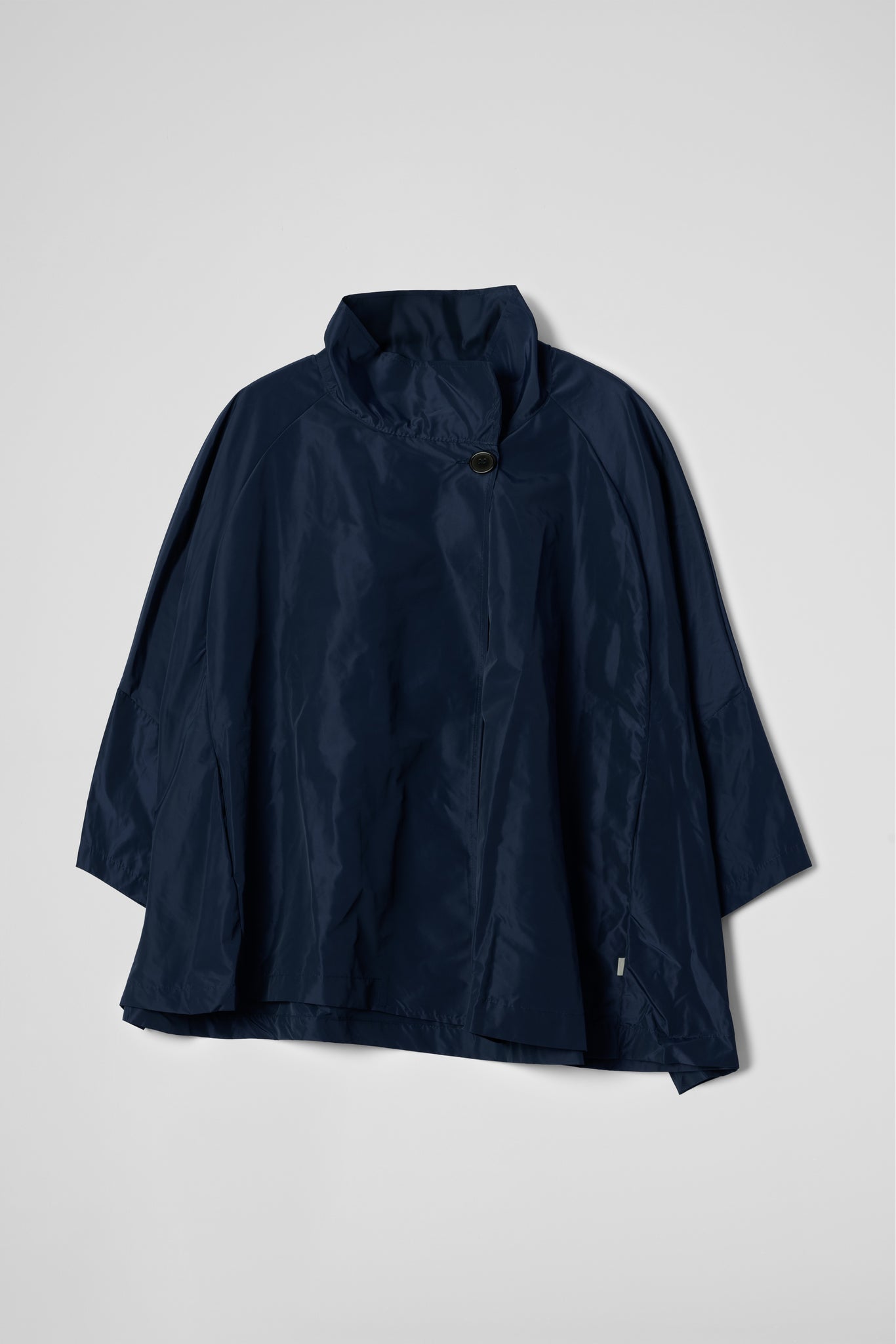 MANTELLA LUNGHEZZA 3/4 IN TESSUTO TAFFETA’ EFFETTO NACRE’, MEZZO COLLO IN PIEDI, CHIUSURA BOTTONE, MANICA LUNGA, POLSO RIBATTUTTO ALTO, MANICA TAGLIO RAGLAN. LINEA OVER.