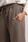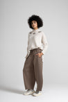 Taglio baggy, vita elastica con coulisse regolabile in tono, due tasche laterali, cucitura centrale frontale, orlo ribattuto sul fondo. Linea ampia.