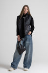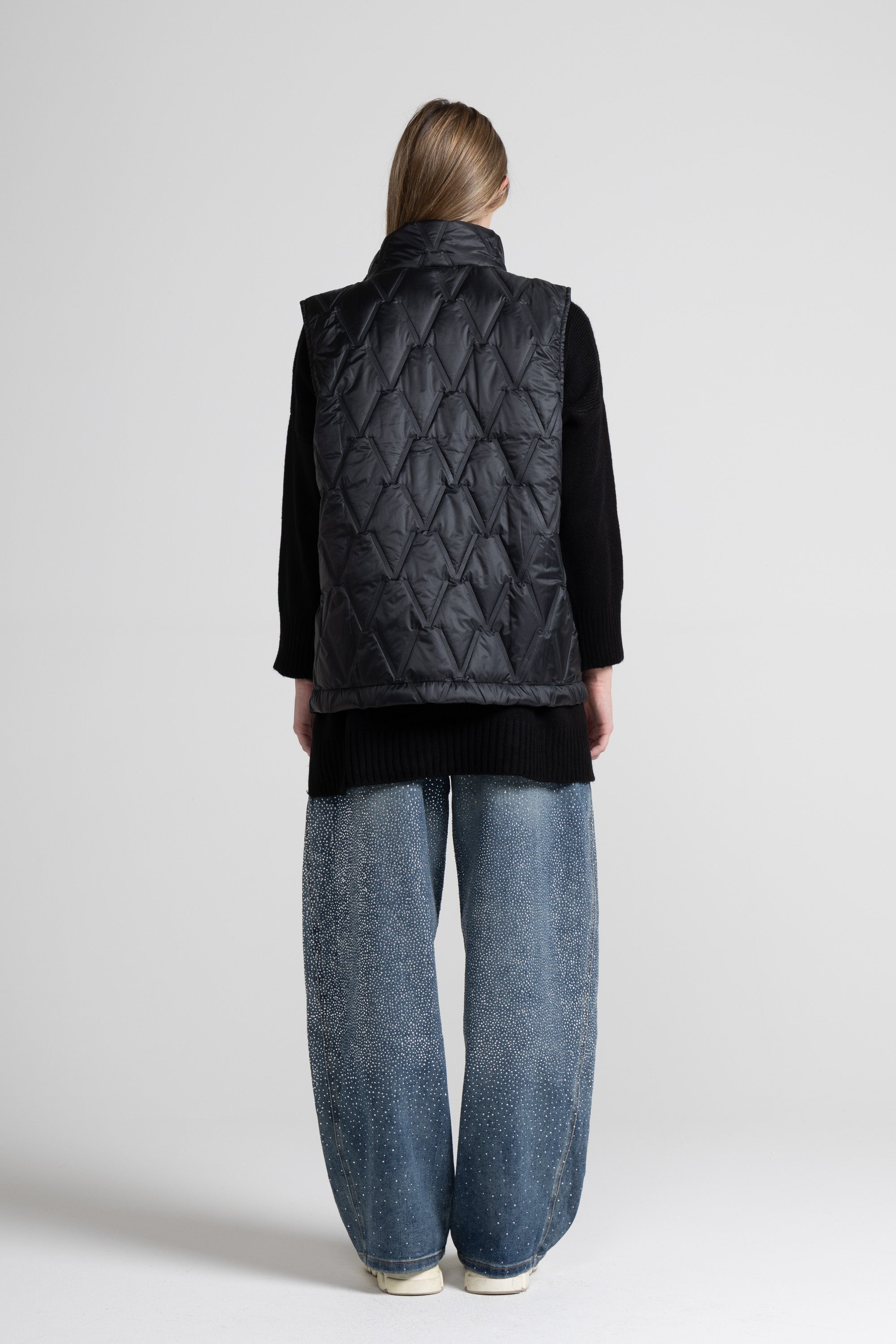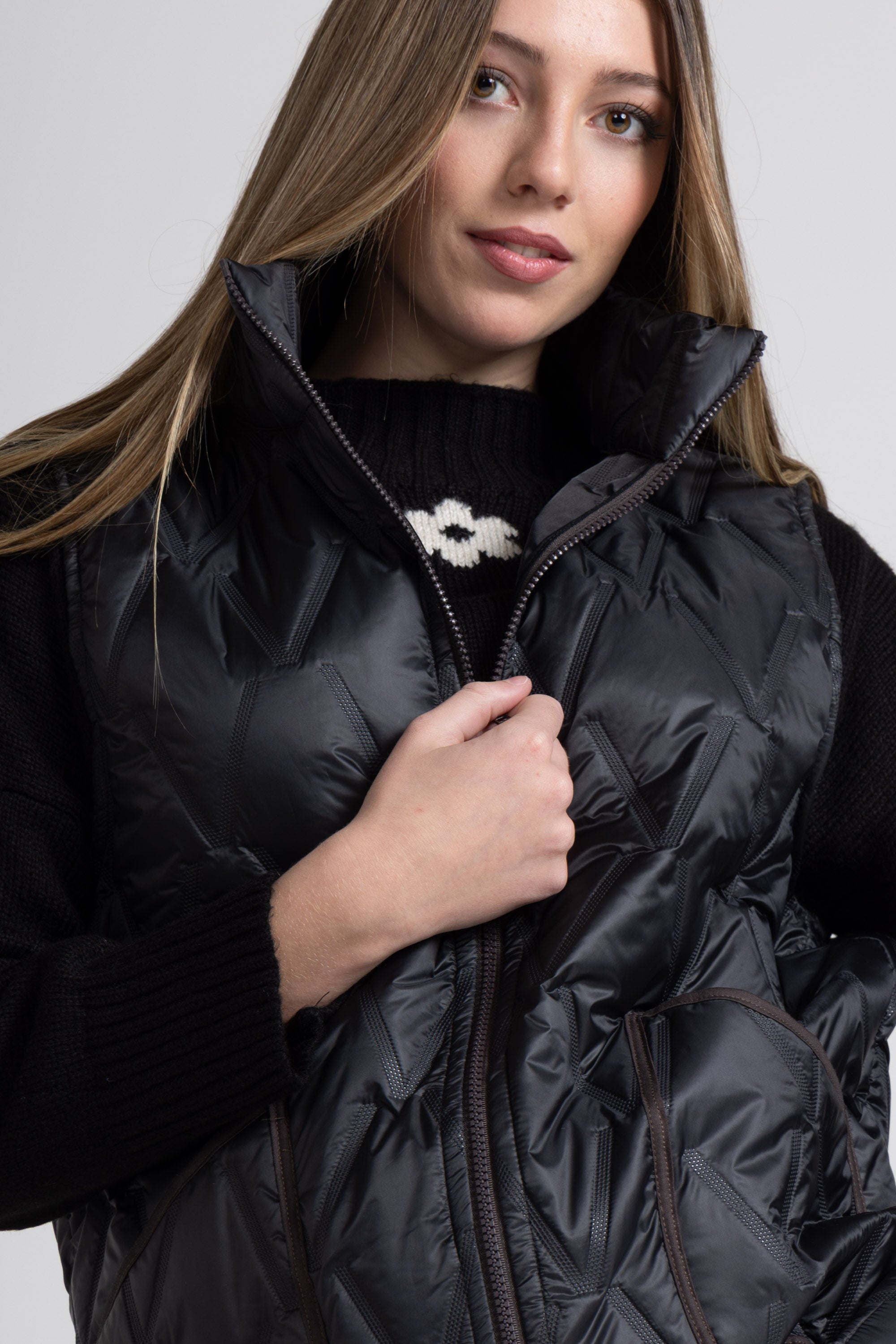 Gilet trapuntato dalla linea dritta e morbida, ideale per un look casual o sportivo, ma con un tocco raffinato grazie alla lucentezza del materiale.