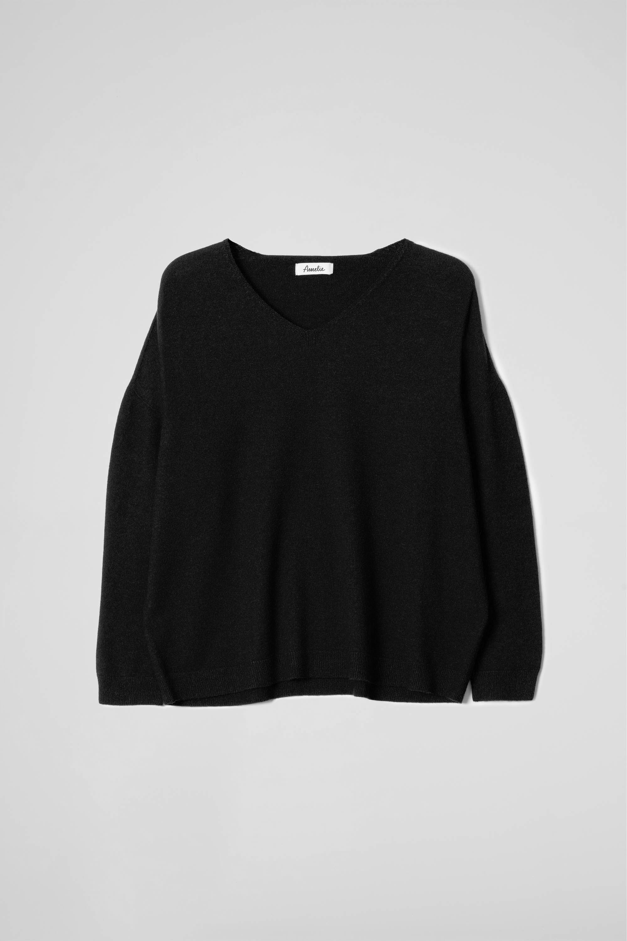 Scollo a V dal bordo pulito a coste sottili, spalla scesa, manica lunga, polsini e fondo con bordatura elasticizzata a coste. Linea ampia