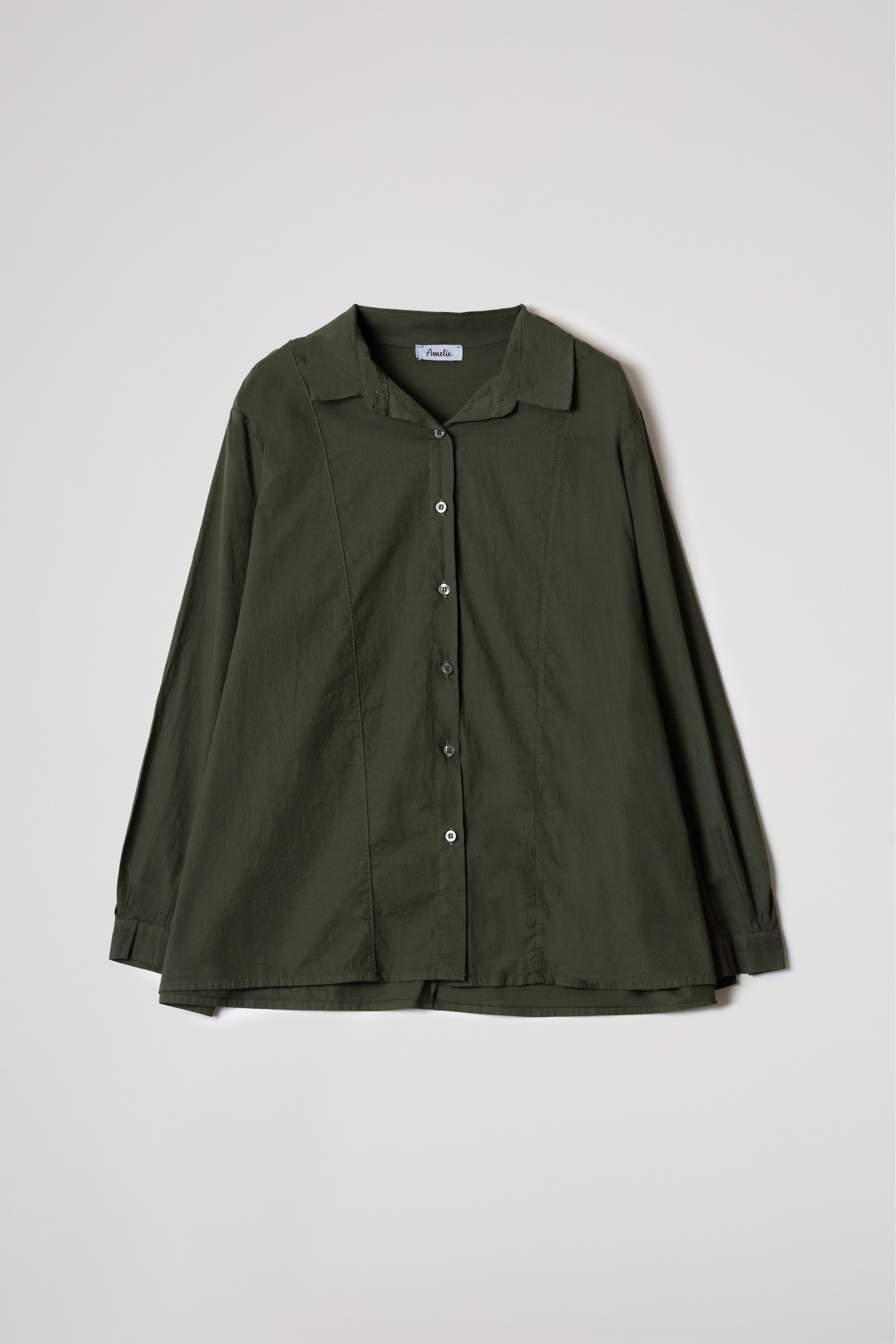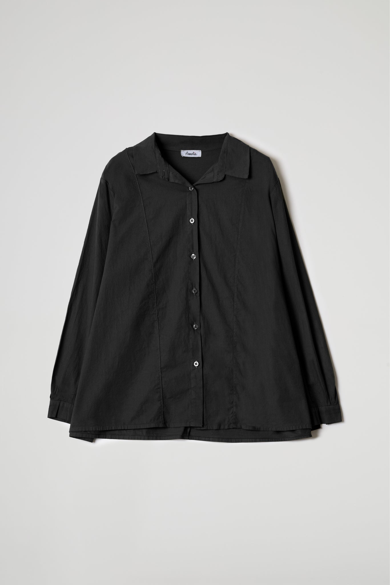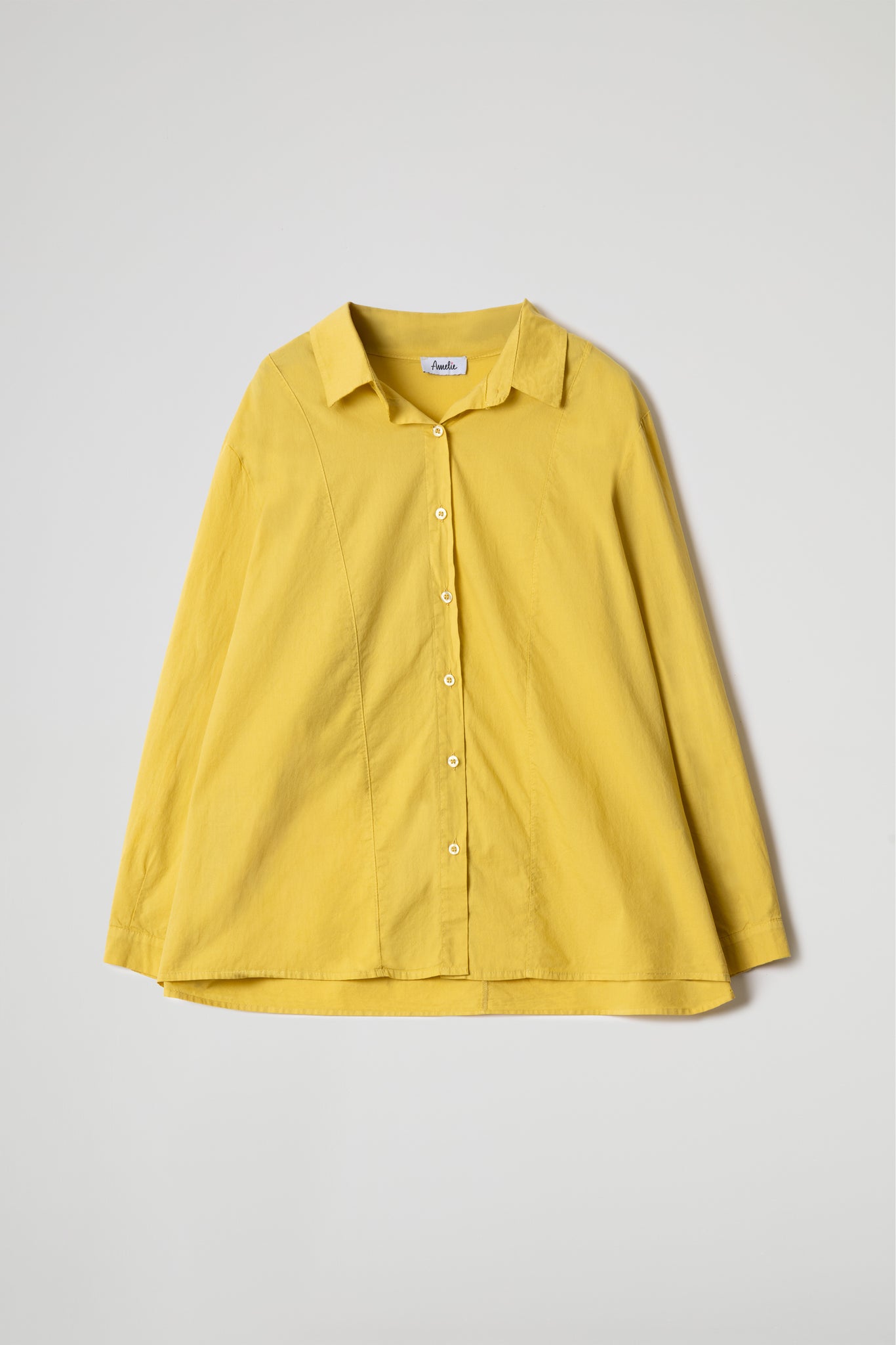 Camicia asimmetrica in popeline di cotone, collo alla francese, manica lunga con impunture sul fondo e bottoncino a chiusura leggermente a sbuffo, taglio a carrè sul retro, chiusura frontale con bottoncini e dettaglio impunture. Linea confortevole