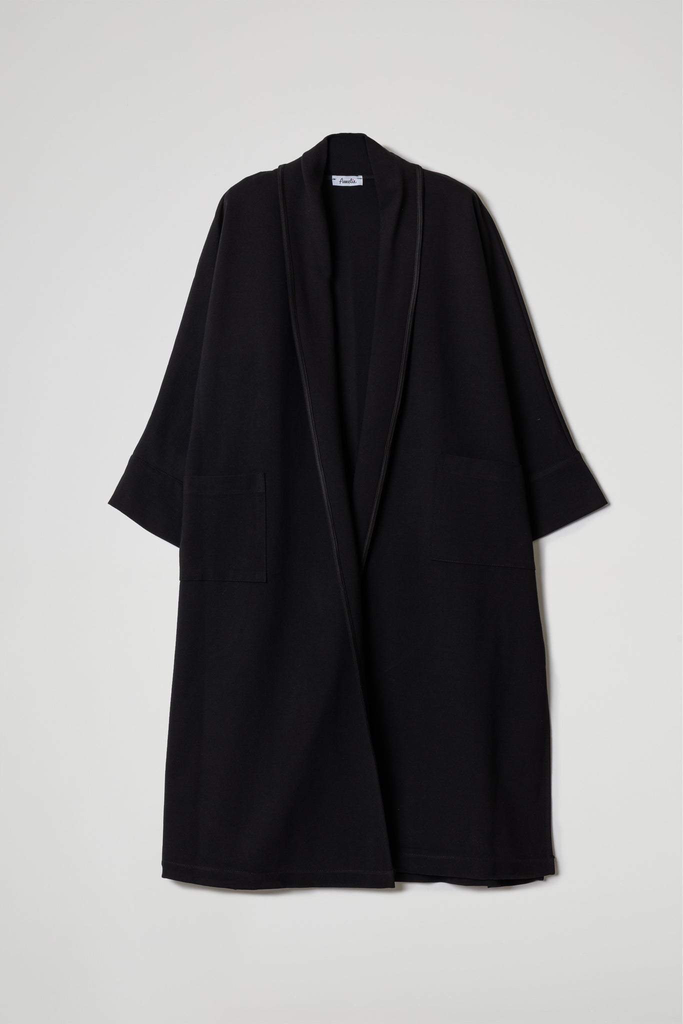 Spolverino lungo aperto sul davanti, collo a revers ampio e cadente con dettaglio bordatura che conferisce un effetto elegante ma casual, maniche ampie e lunghe con fondo ribattuto alto, tasche grandi applicate, spacchi sul fondo. Linea ampia e confortevole