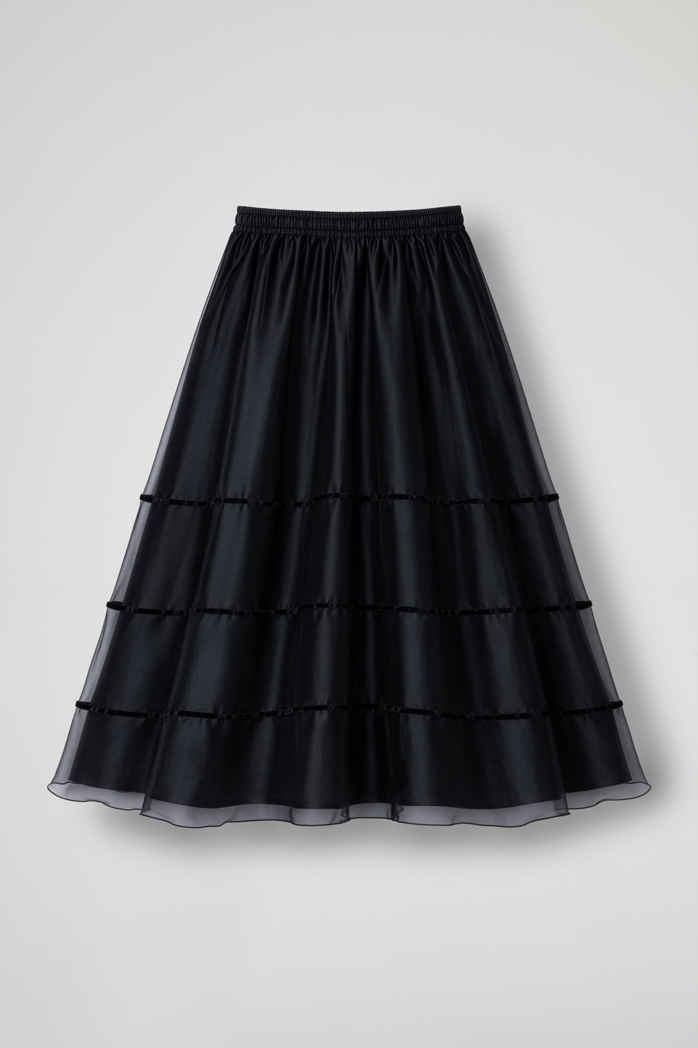 Gonna elegante, dal tessuto leggero e semi-trasparente che crea un raffinato gioco di volumi e movimento; le fasce orizzontali donano struttura e carattere al design. La vita elasticizzata garantisce comfort e vestibilità impeccabile, adattandosi con naturalezza alla silhouette.