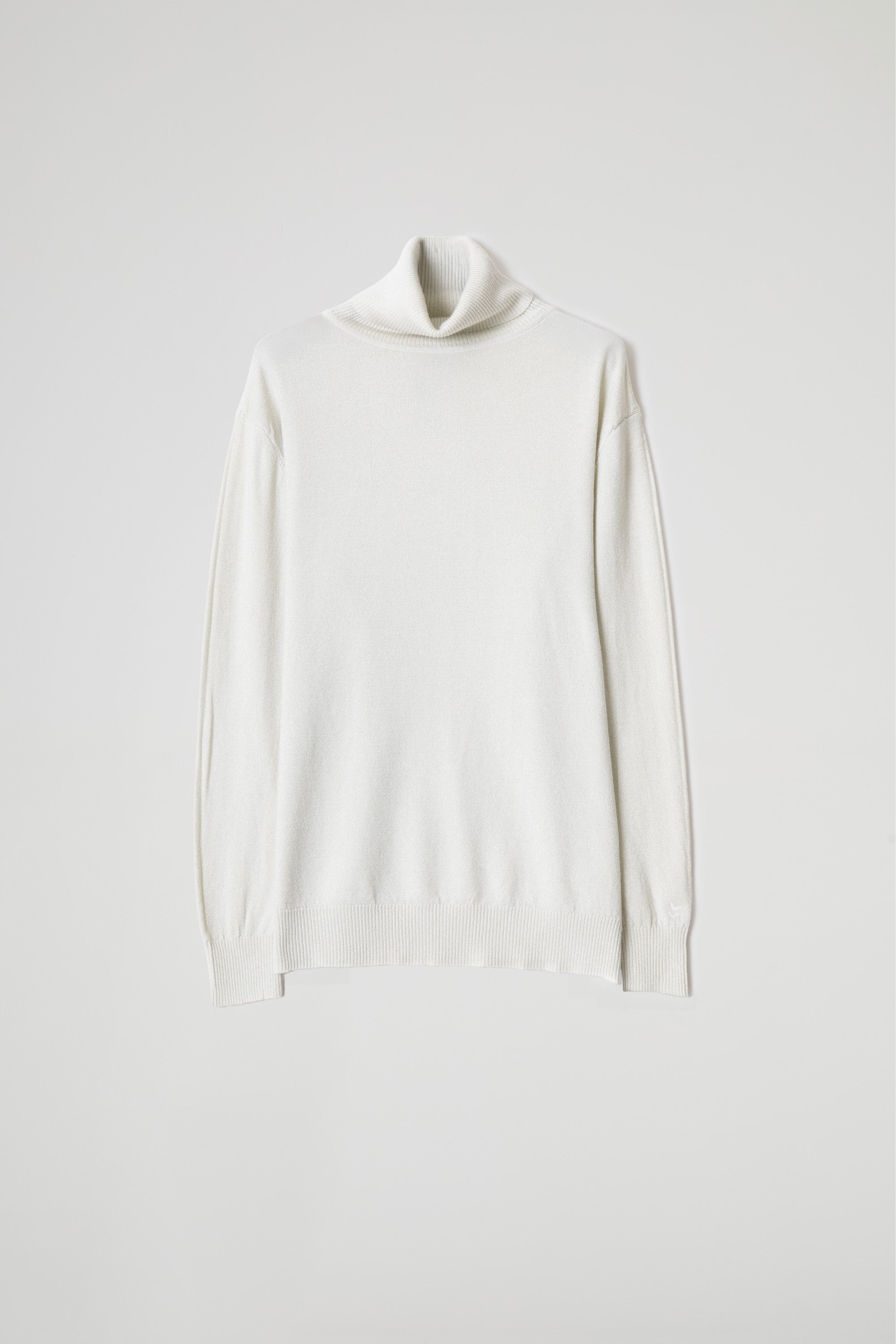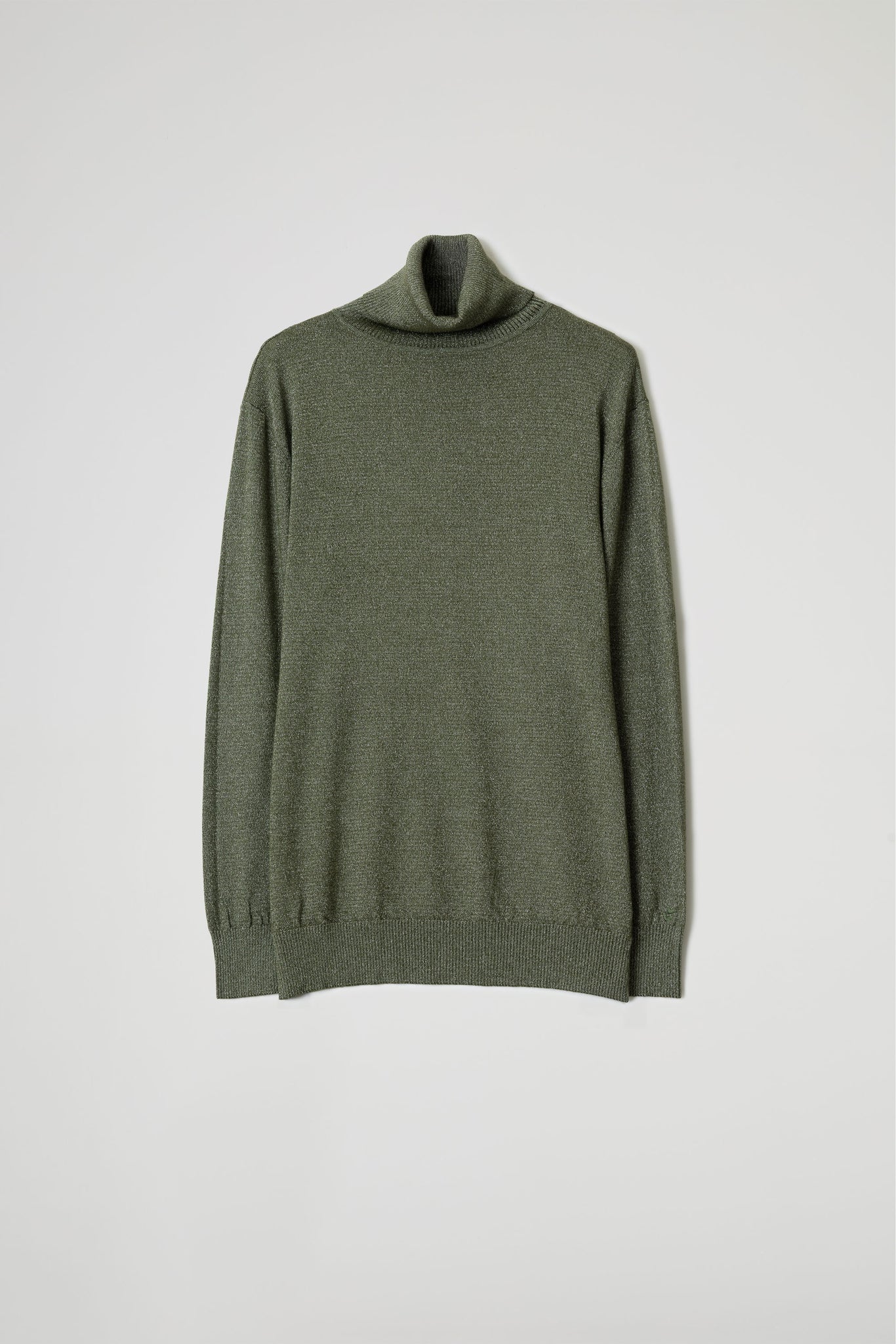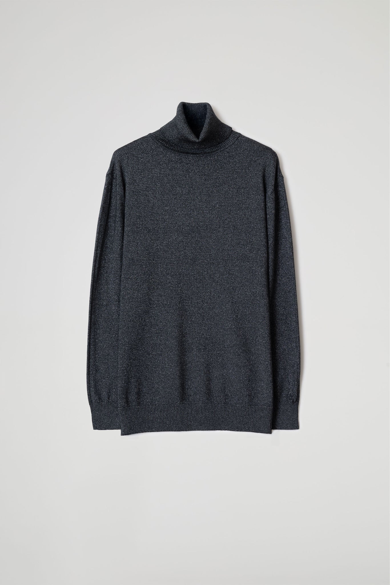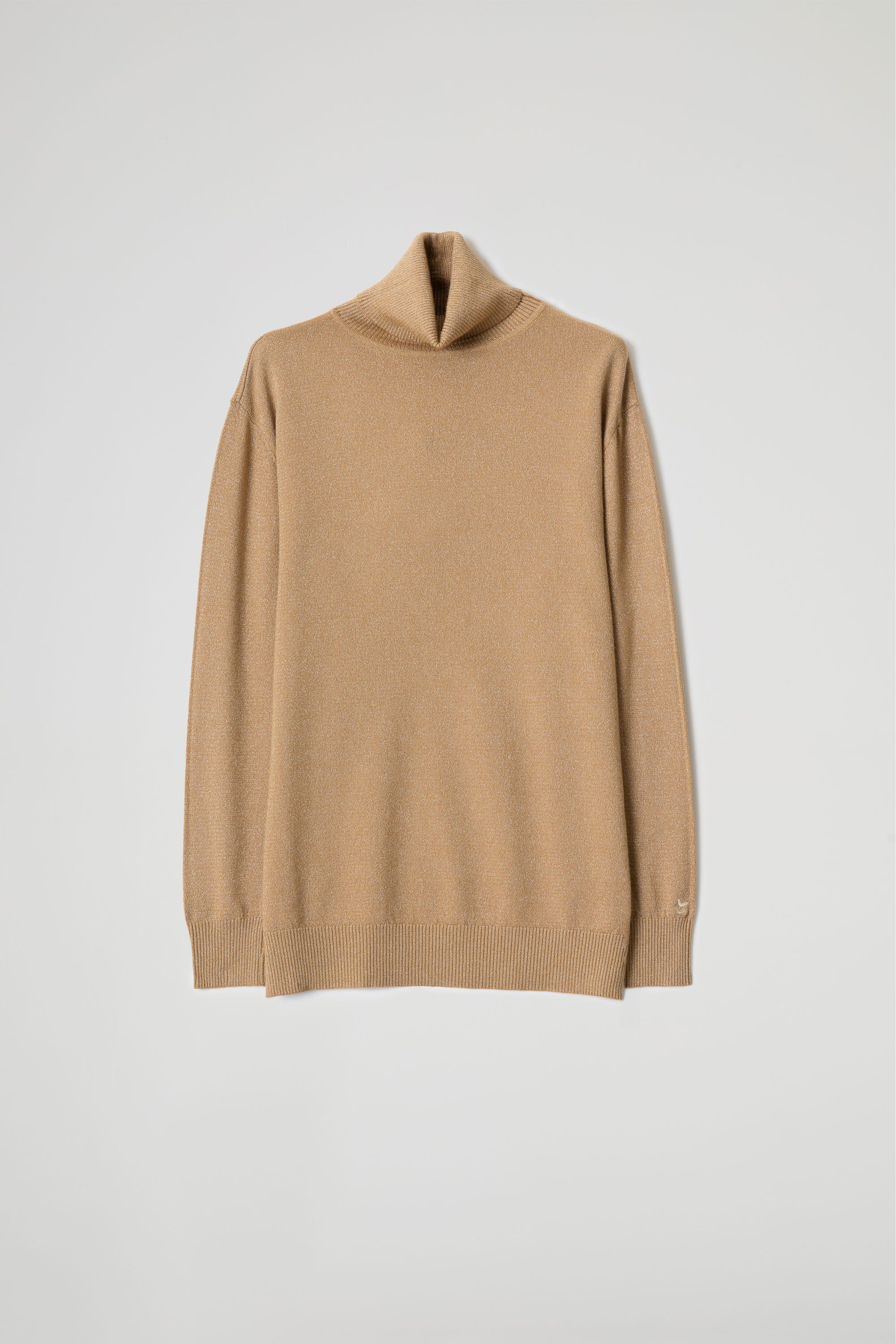 Maglione dolce vita dalla texture leggermente brillante che valorizza ogni outfit, dal più casual al più sofisticato; la sua leggerezza lo rende comodo da indossare, mentre i riflessi metallici aggiungono un dettaglio distintivo senza eccessi.