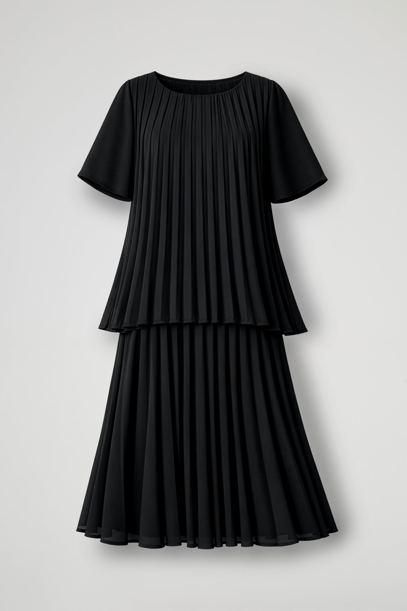 Abito midi in crepe plissè soleil con balza, scollo rotondo, manica corta. Linea svasata.