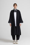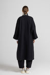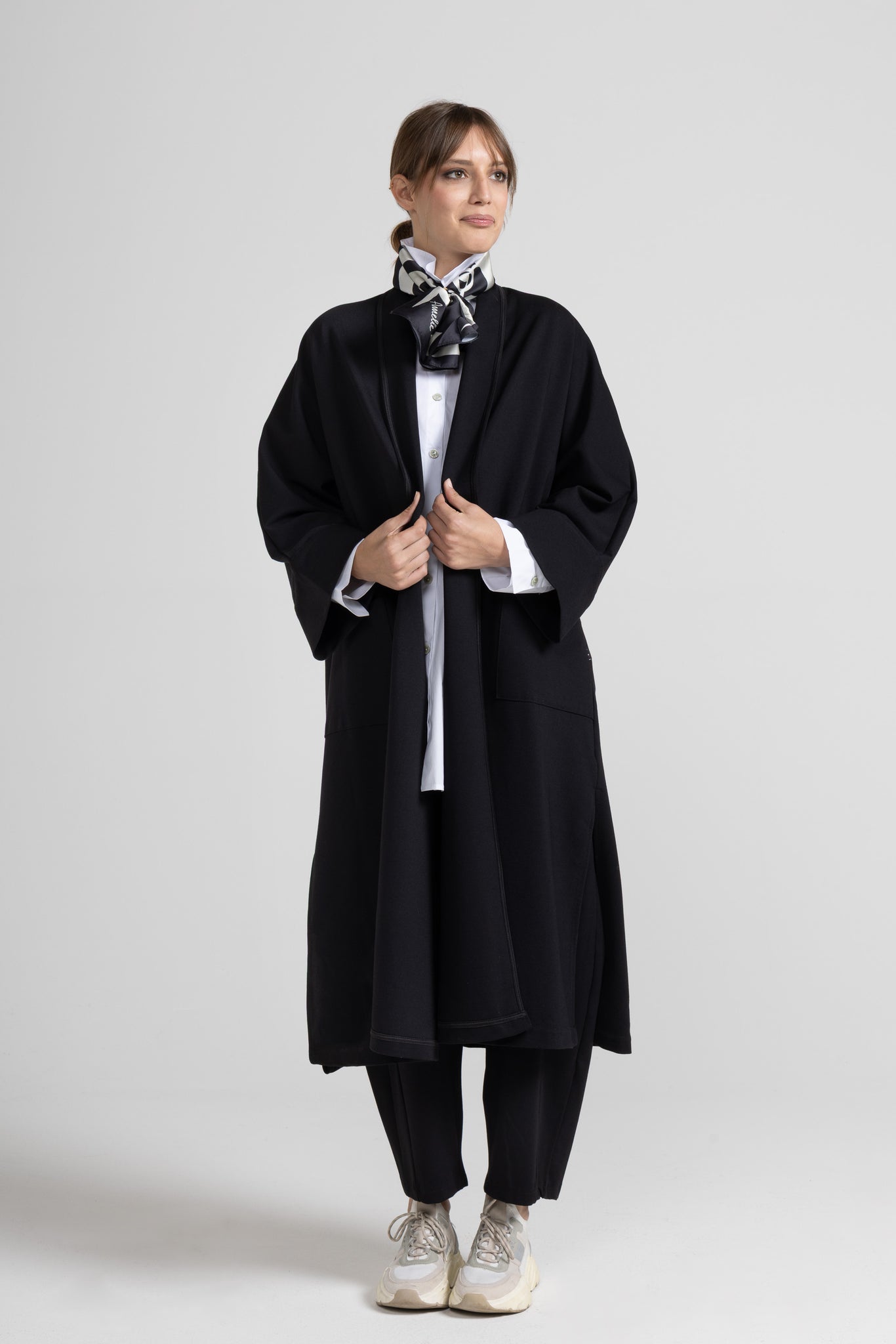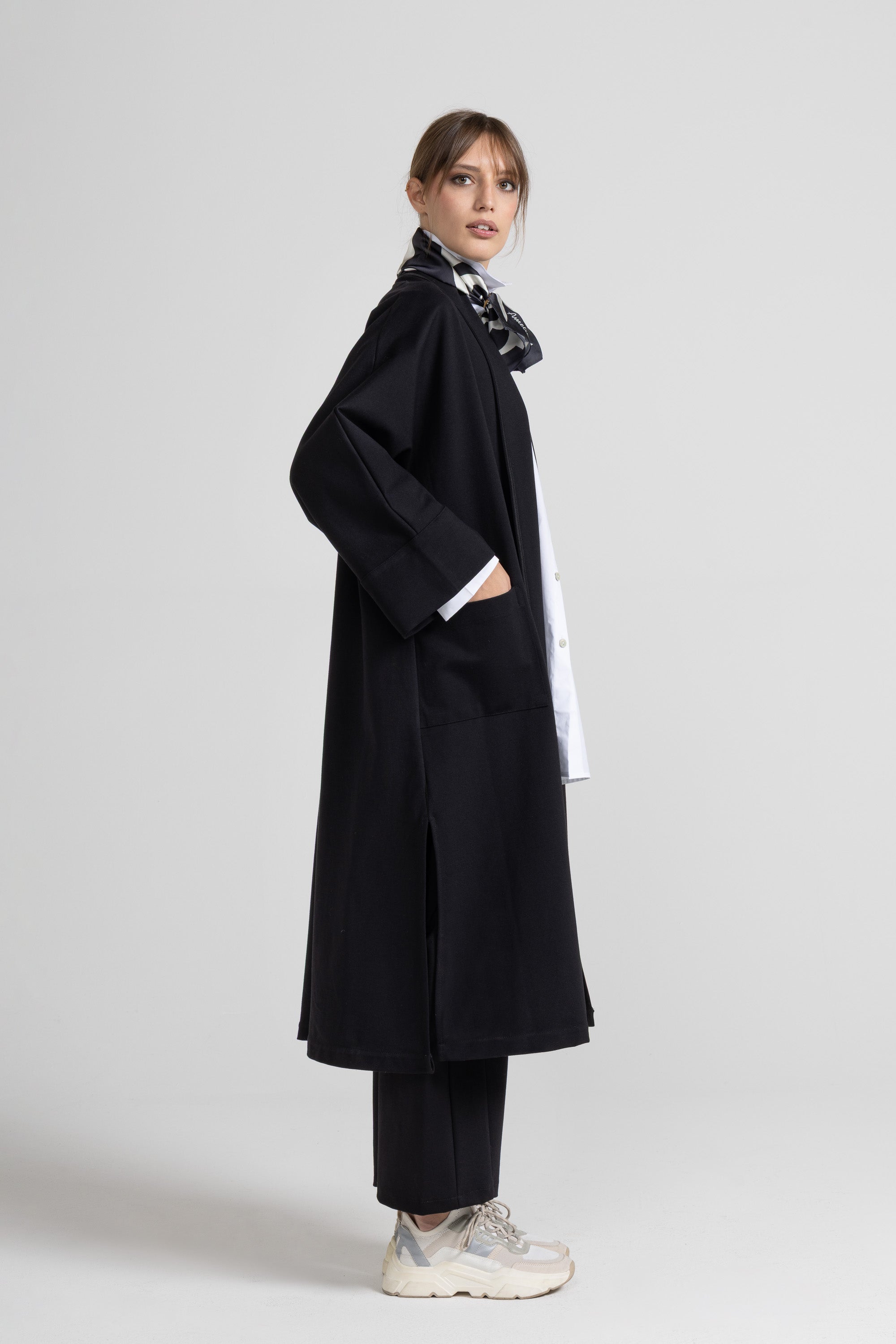 Spolverino lungo aperto sul davanti, collo a revers ampio e cadente con dettaglio bordatura che conferisce un effetto elegante ma casual, maniche ampie e lunghe con fondo ribattuto alto, tasche grandi applicate, spacchi sul fondo. Linea ampia e confortevole