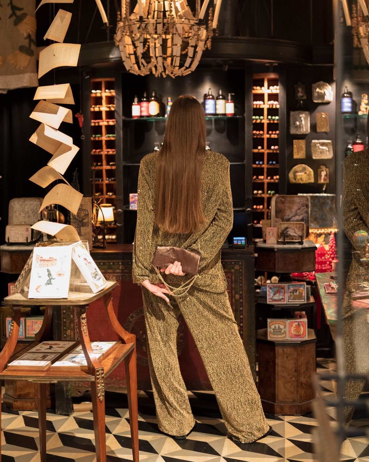 Pantalone a palazzo in lurex, un capo femminile e contemporaneo, ideale da indossare con il suo top coordinato per un outfit total glam o con un capo basico per un contrasto luminoso e di carattere.