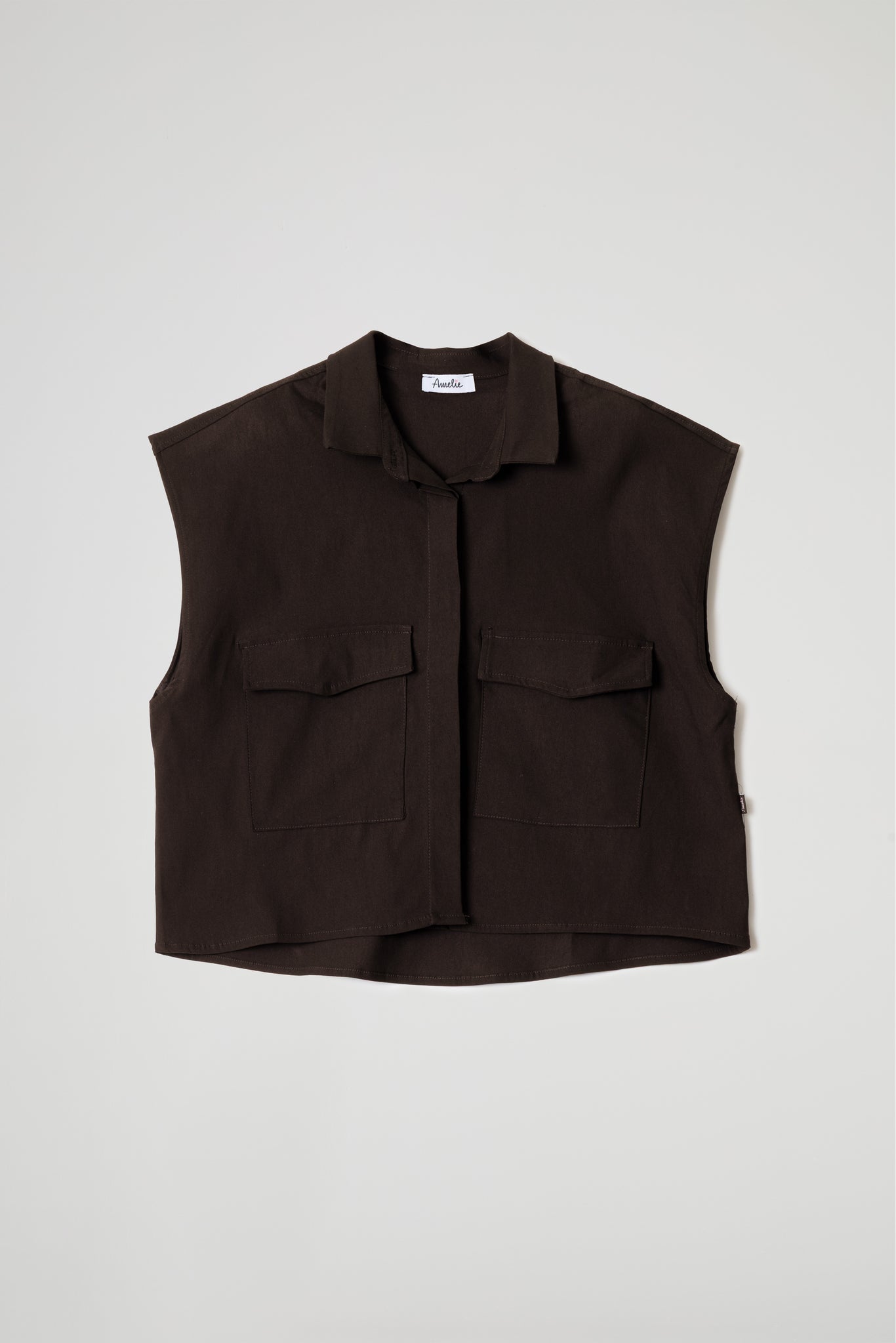 Gilet camicia leggermente strutturato, avvolge la figura con linee pulite e una vestibilità moderna, perfetta per creare look contemporanei e raffinati.
