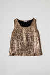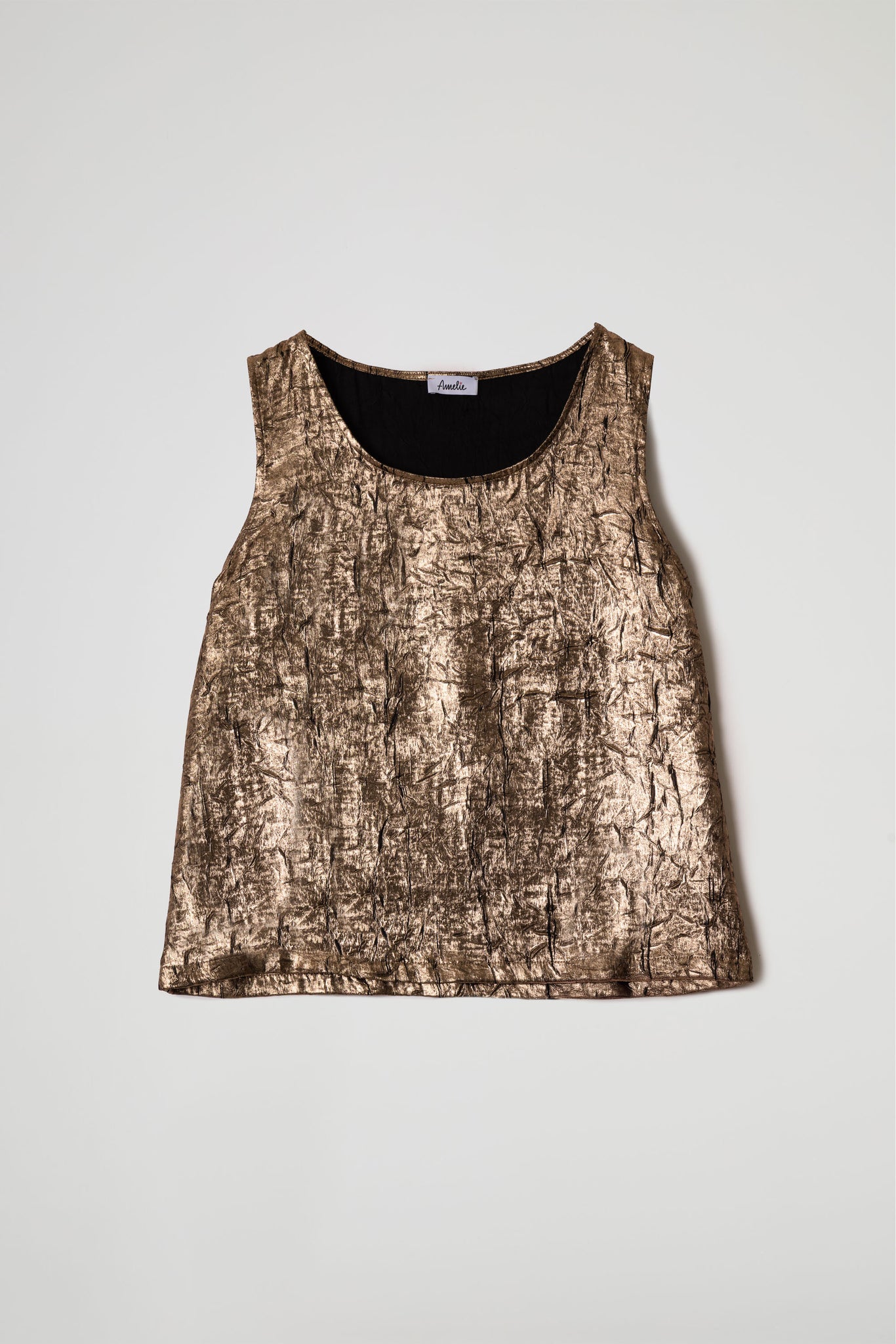 Canotta realizzata in un tessuto spalmato leggero con finitura leggermente lucida. La superficie presenta un elegante effetto stropicciato che aggiunge movimento e carattere al capo, la vestibilità è comoda e svasata, ideale da sovrapporre oppure indossare da sola per un effetto minimal e sofisticato.