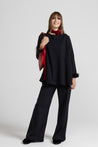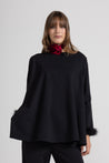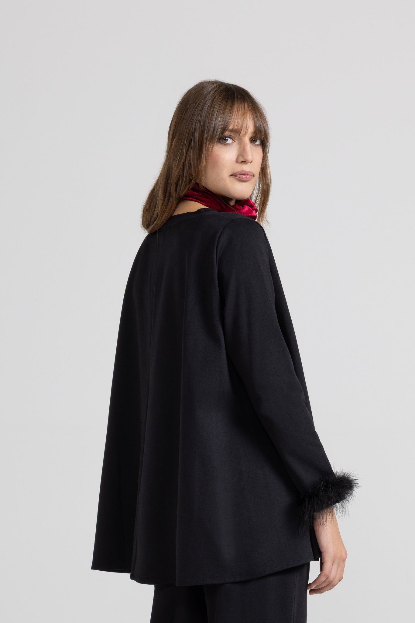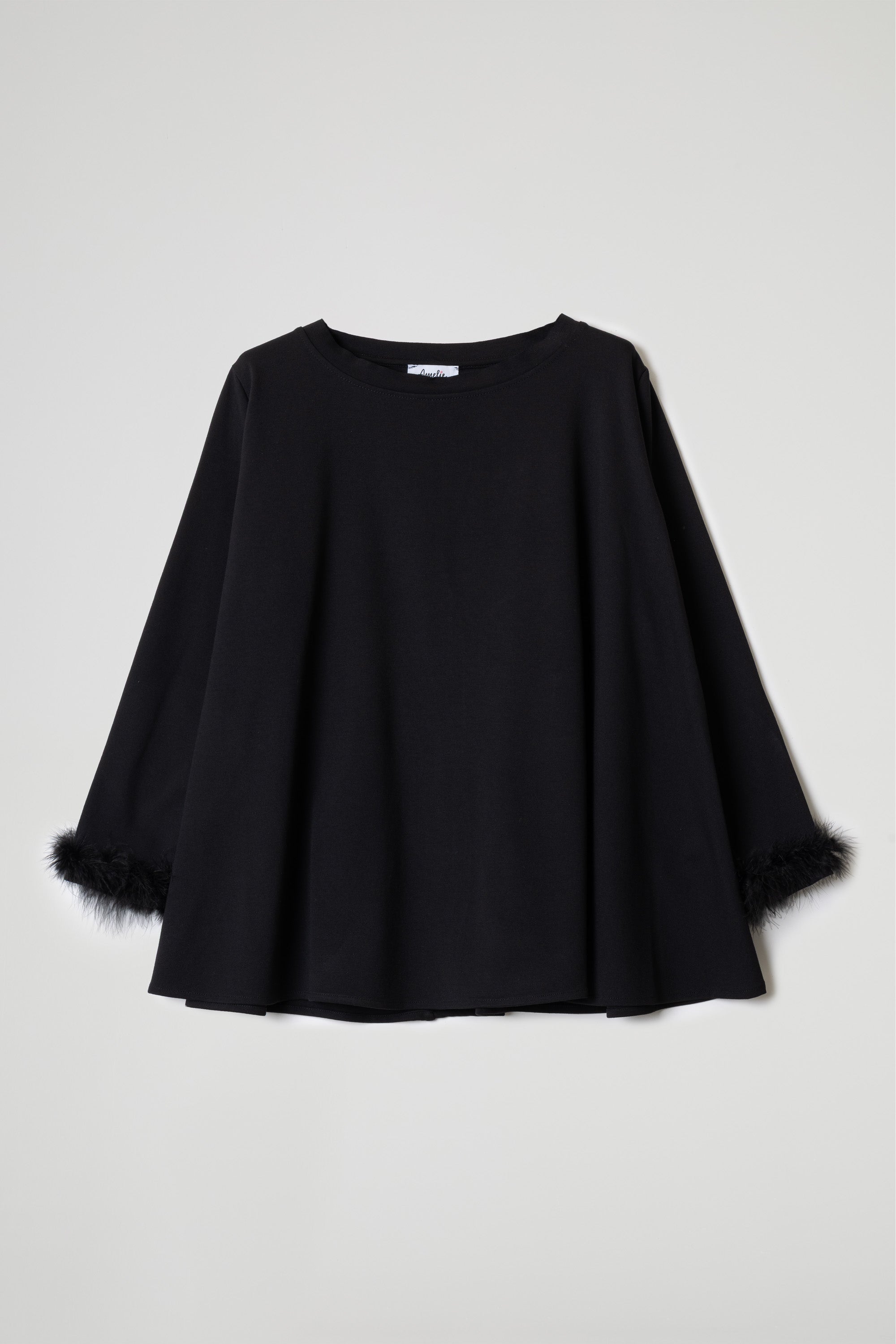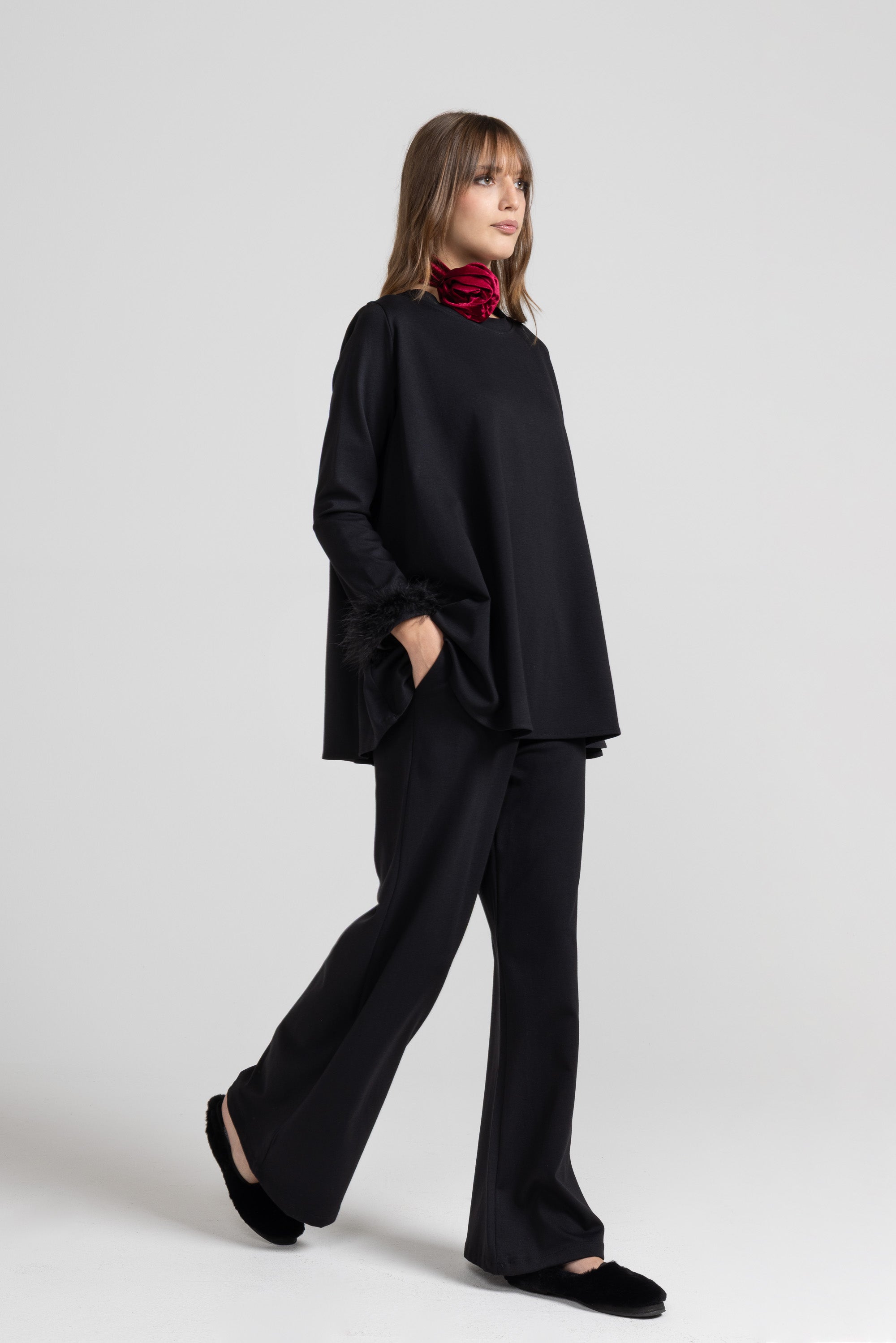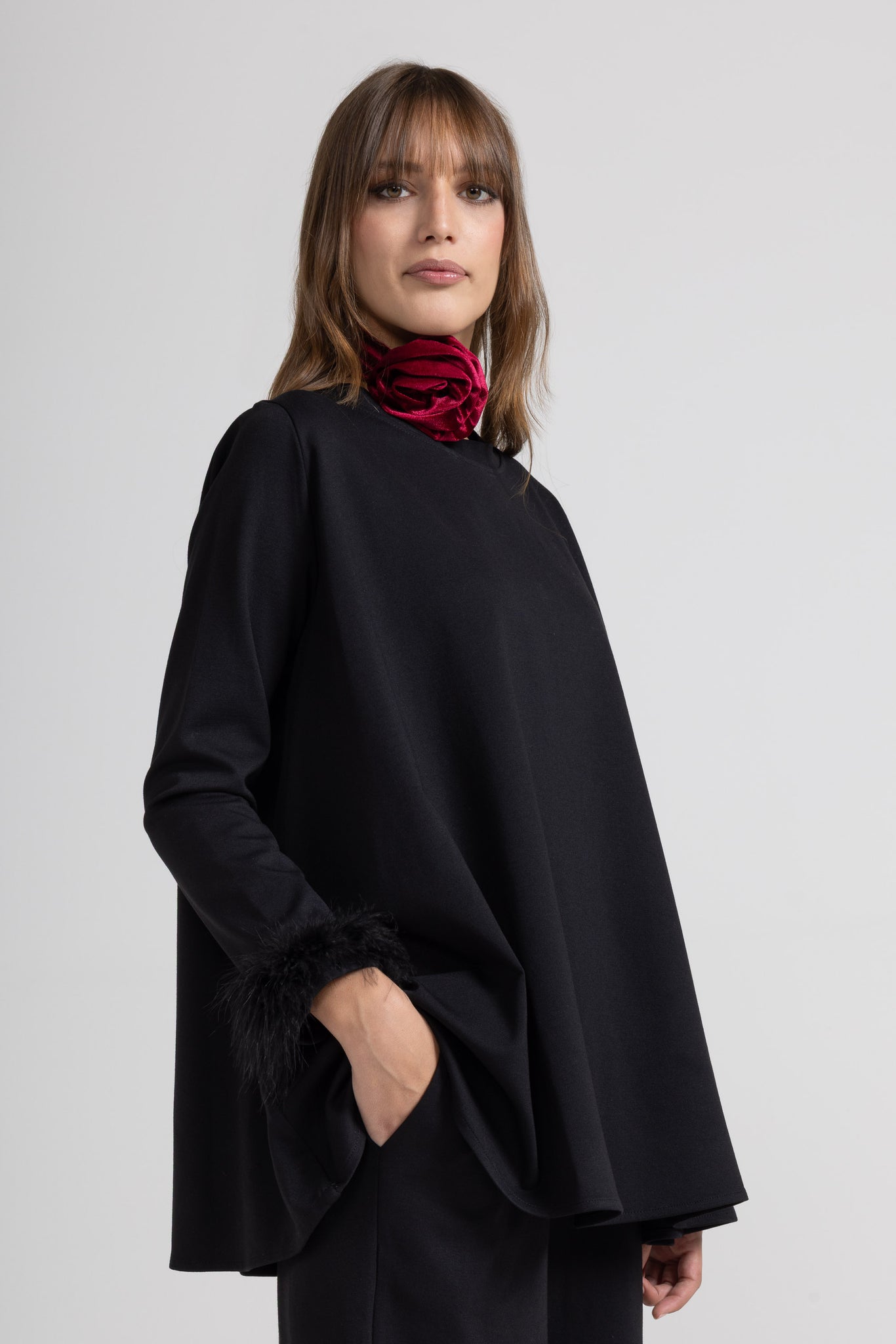 Top in Milano stitch viscose fabric, wide round neck, slightly asymmetrical trapeze line, long sleeves enriched by a feather detail at the bottom.