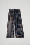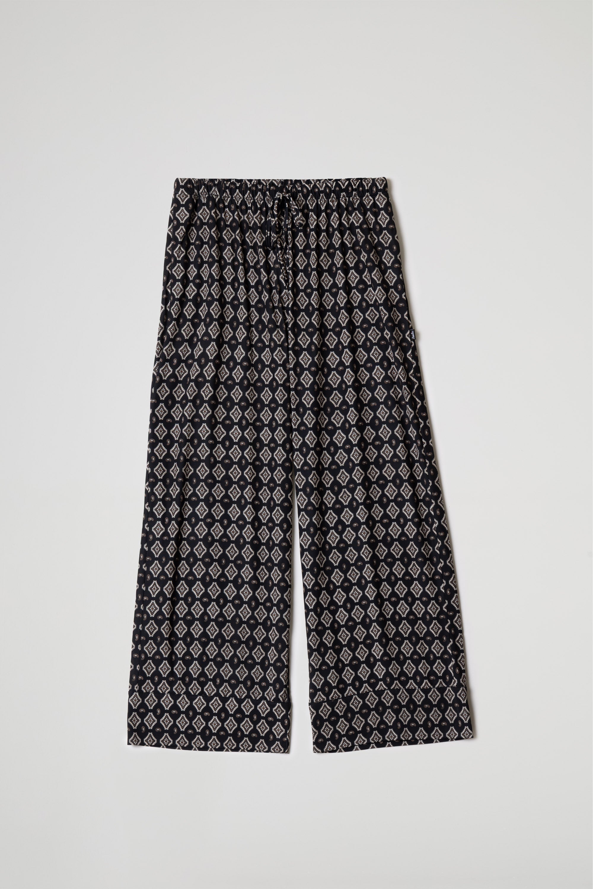 Palazzo trousers in technical fabric, elastic waist with adjustable drawstring, welt pockets, high folded hem at the bottom, geometric pattern all over the garment, soft Lina