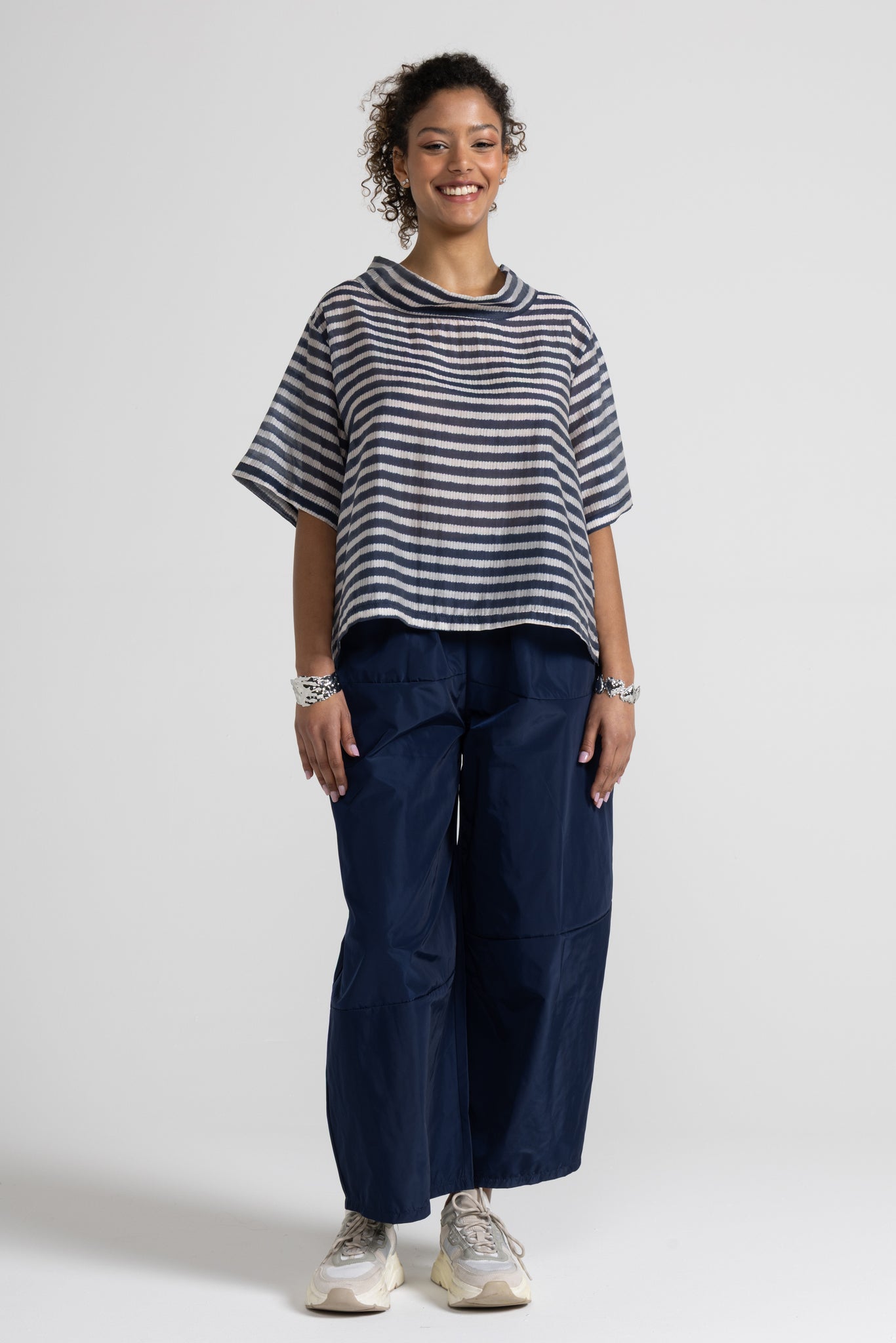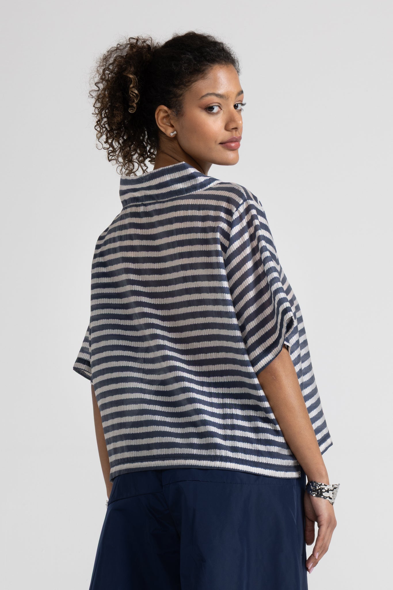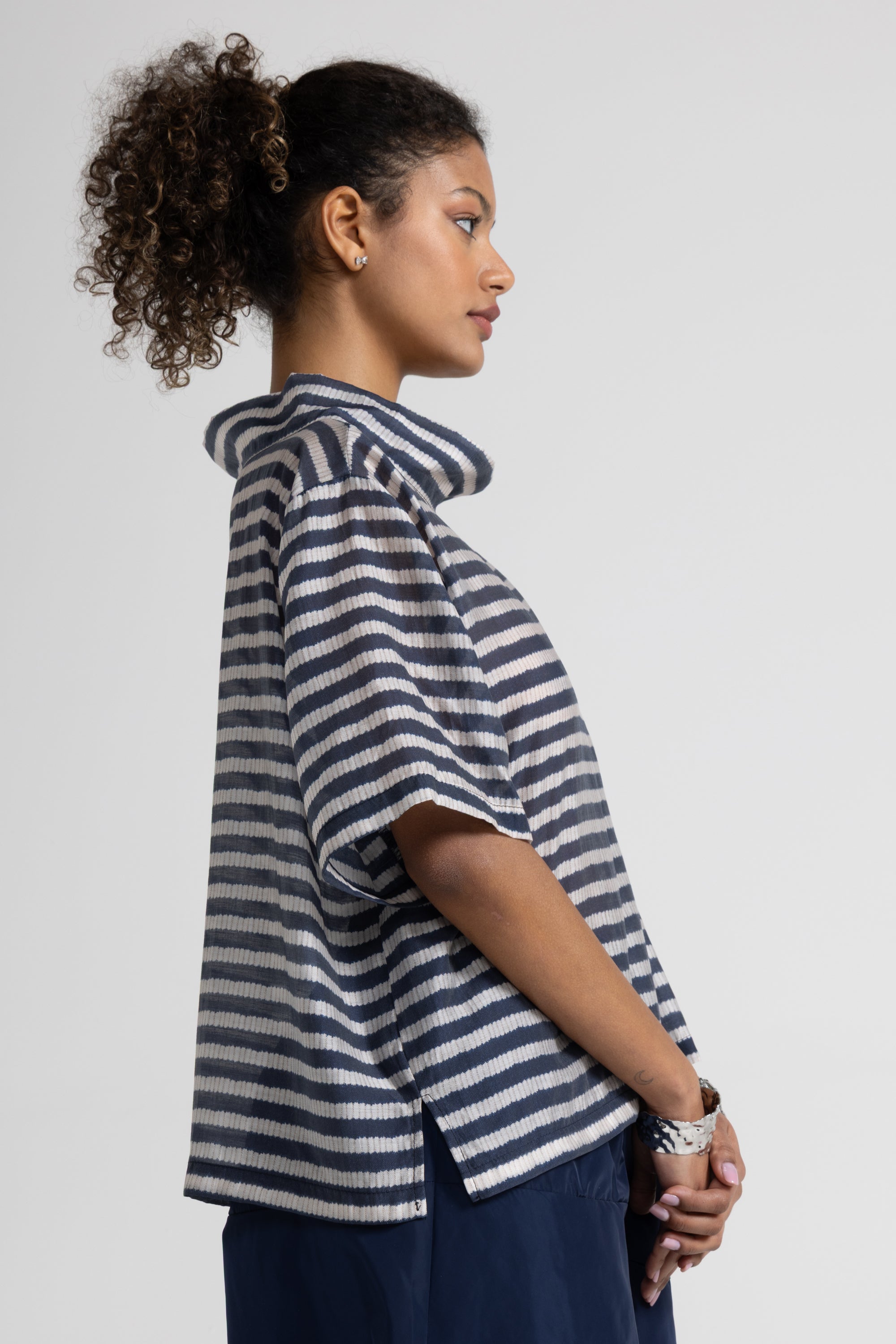 Striped top with a fresh and contemporary feel. Made from soft and comfortable fabric, it features short sleeves and a distinctive, slightly wide, soft collar that adds movement and character. The fit is comfortable and slightly boxy, with small side slits at the hem for greater freedom of movement. A casual and versatile piece, perfect for completing everyday looks with a touch of style.