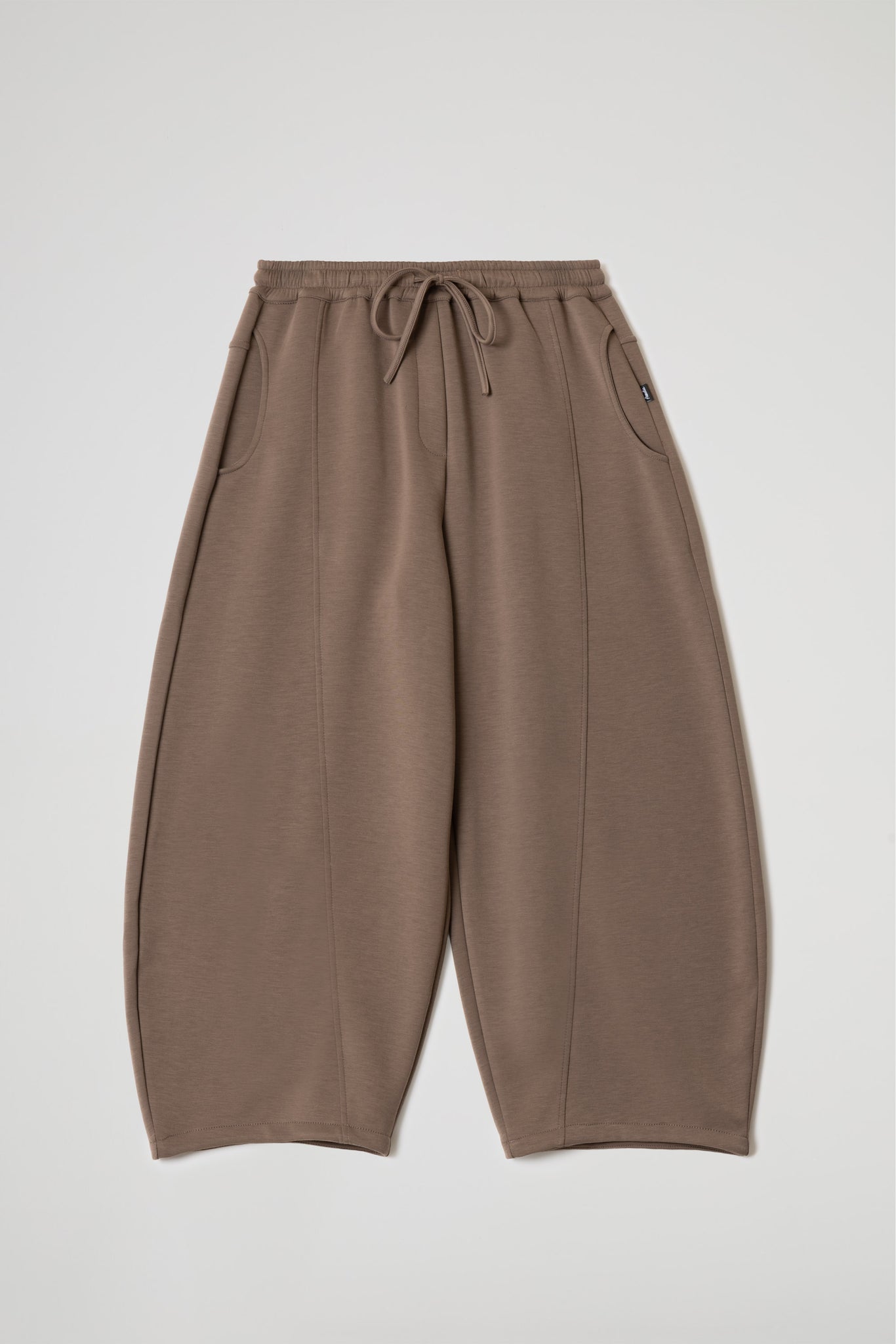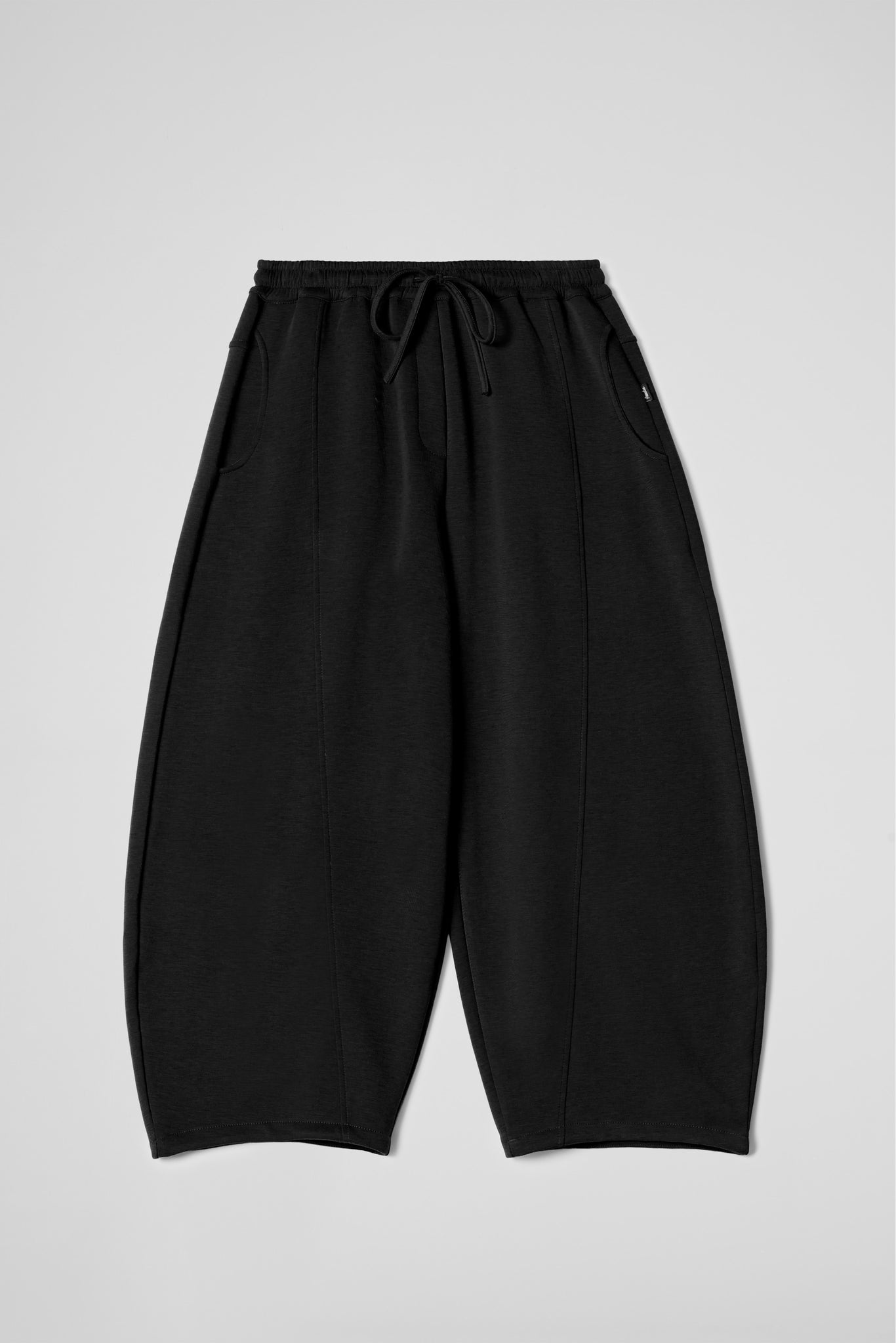 Baggy fit, elastic waist with adjustable drawstring, two side pockets, center front seam, and folded hem. Wide fit.