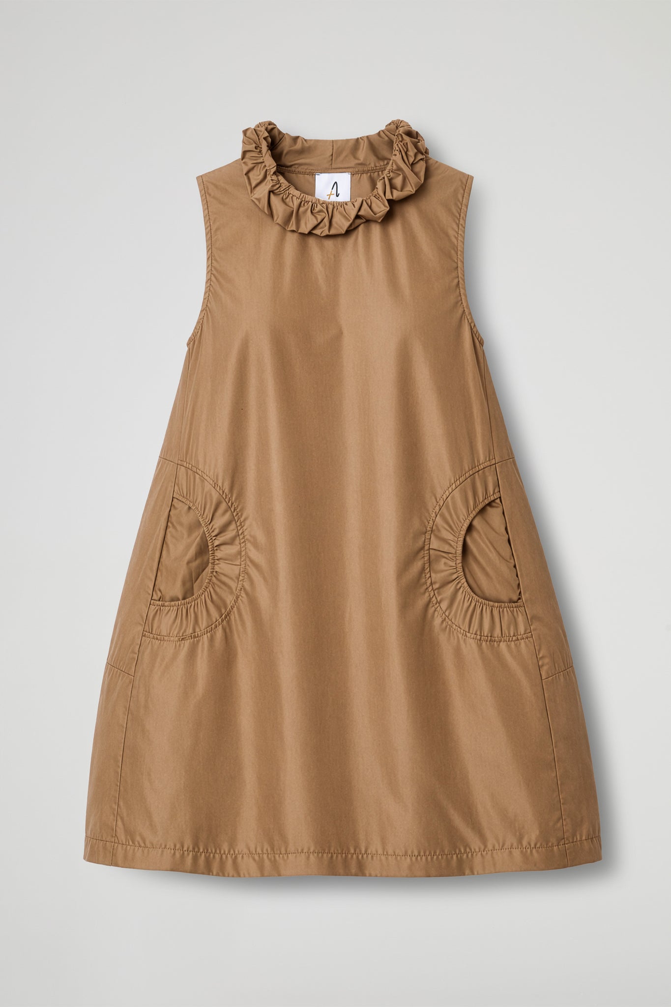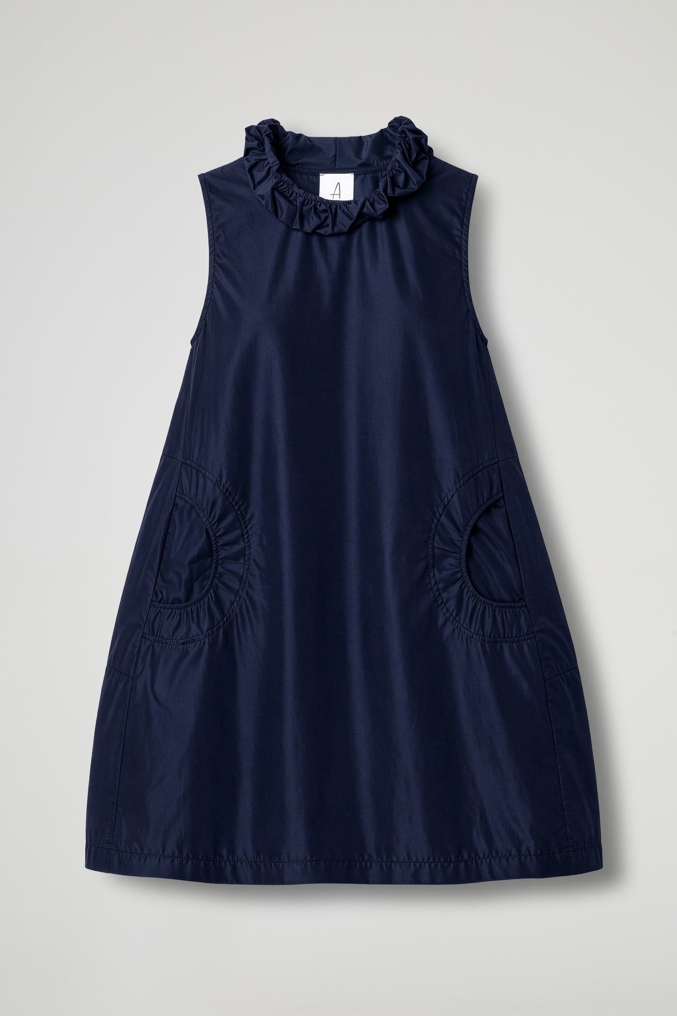 SHORT SLEEVELESS DRESS IN NACRE-EFFECT TAFFETA FABRIC, HIGH NECK WITH RUFFLES, WELT POCKETS, PORTHOLE DETAIL ON THE HIPS, VISCOSE KNITTED DETAIL ON THE ARMHOLES TO ALLOW FOR A MORE COMFORTABLE FIT. WIDE AND COMFORTABLE LINE
