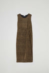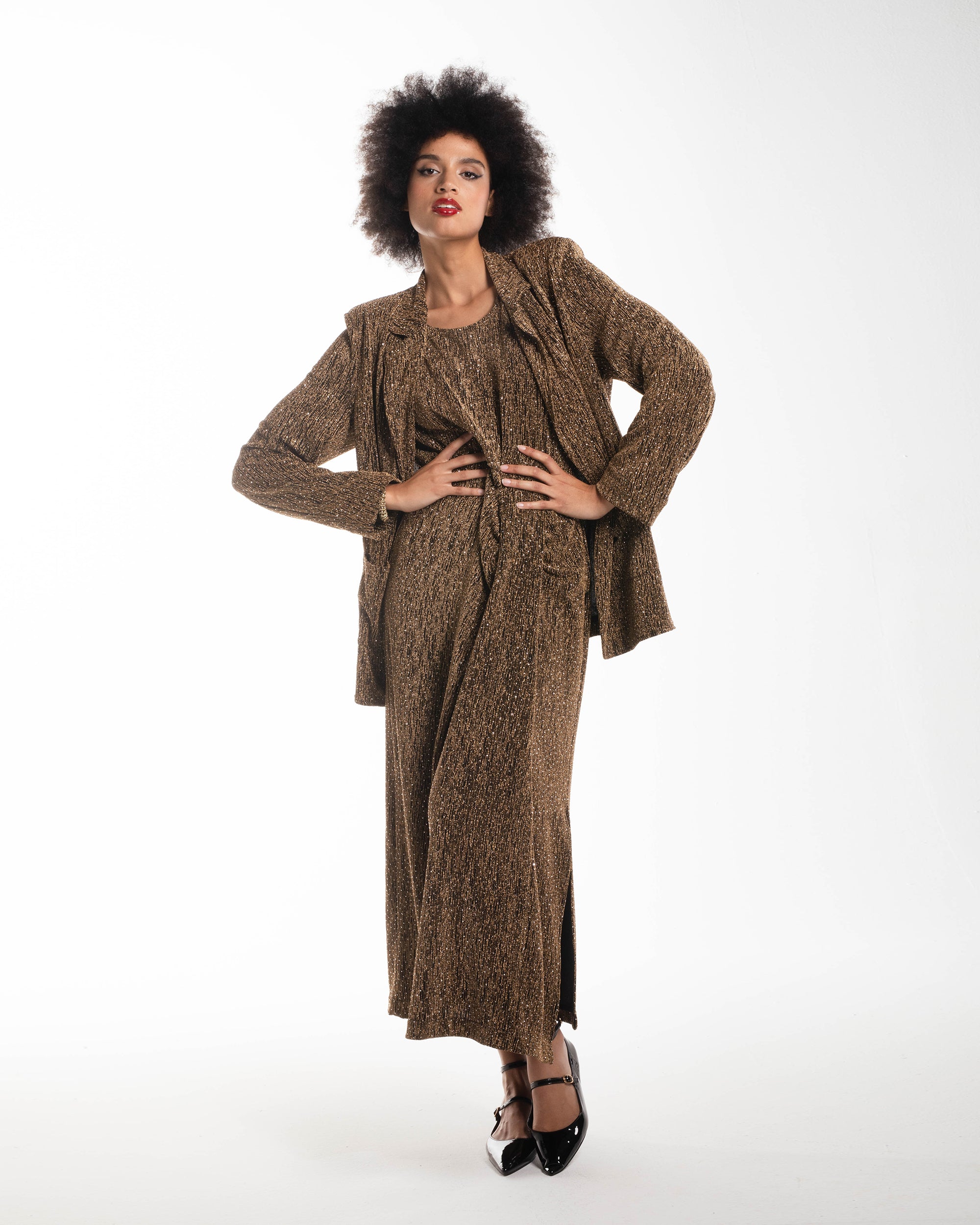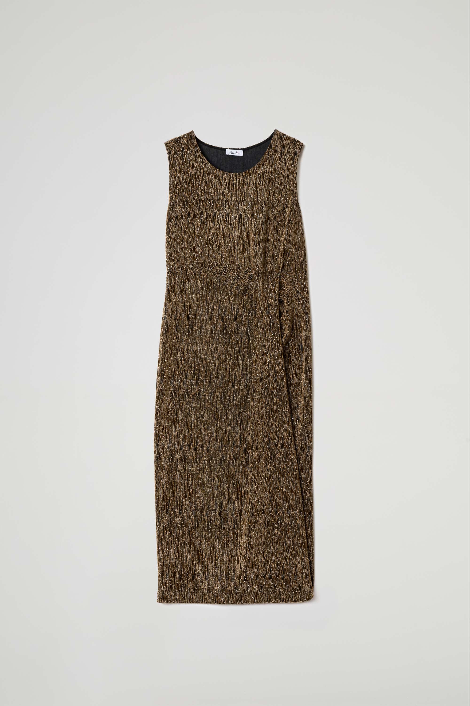 Abito lungo smanicato, dettaglio drappeggio sul punto vita, spacco laterale, micro-righe verticali in lurex su tutto il capo. Linea leggera e confortevole.