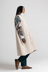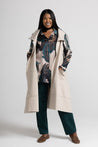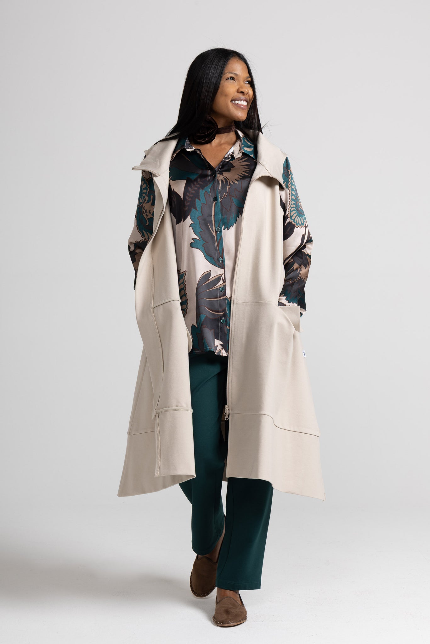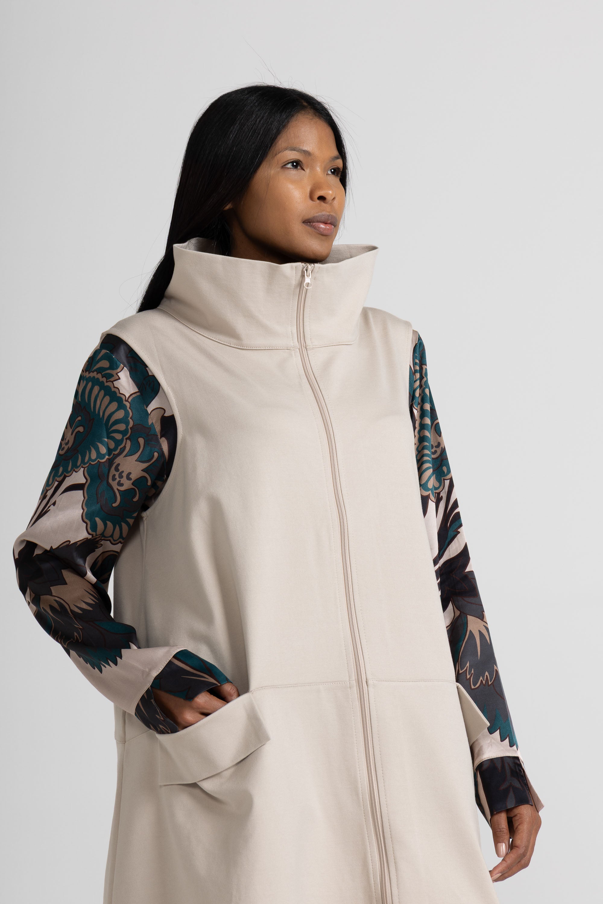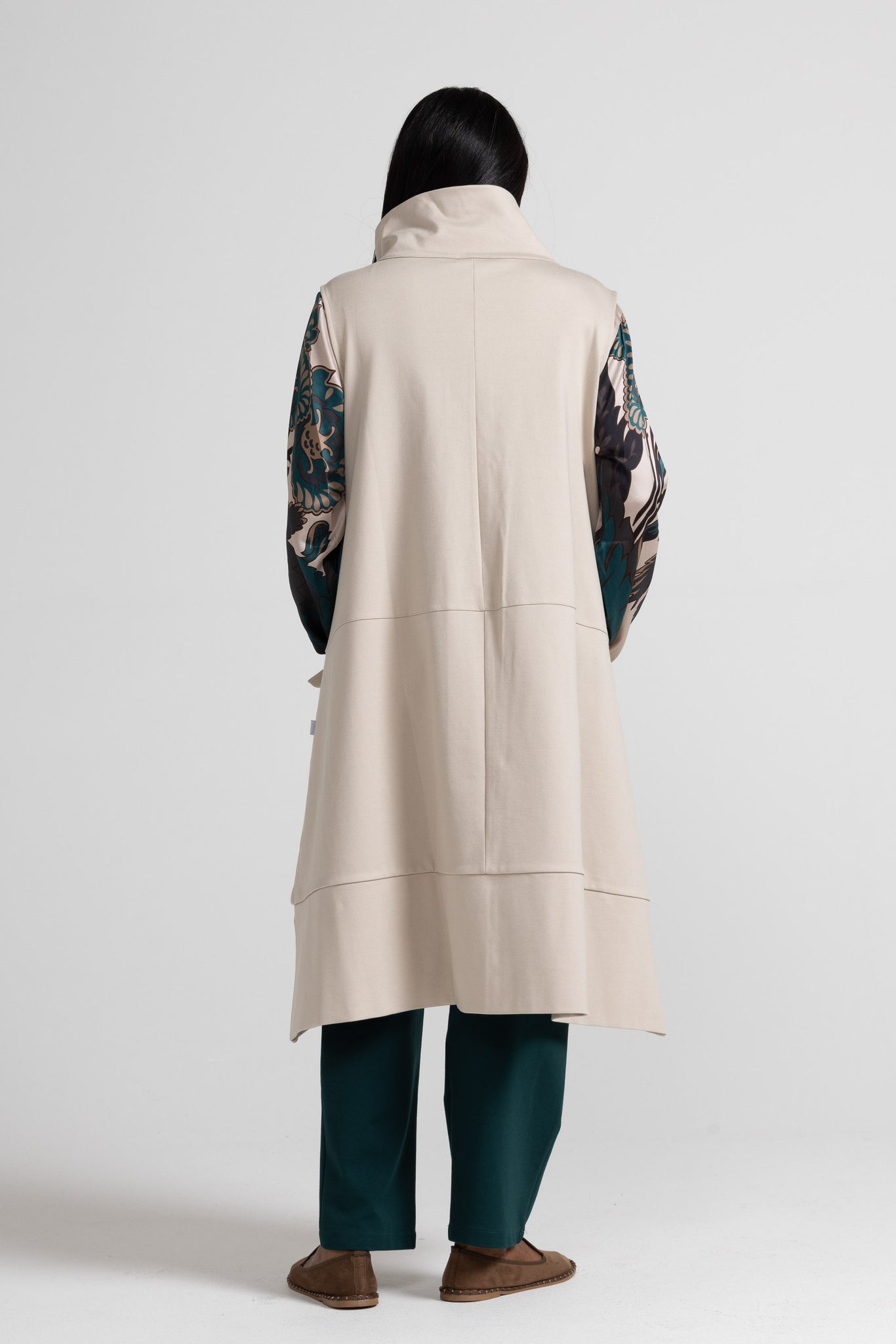 LONG SLEEVELESS DUSTER COAT IN MILAN STITCH VISCOSE FABRIC, WIDE COWL NECK, TONE-ON-TONE ZIP, SLIT POCKETS WITH REVERSE FLAP, HIGH FOLDED HEM. TRAPEZE SHAPE