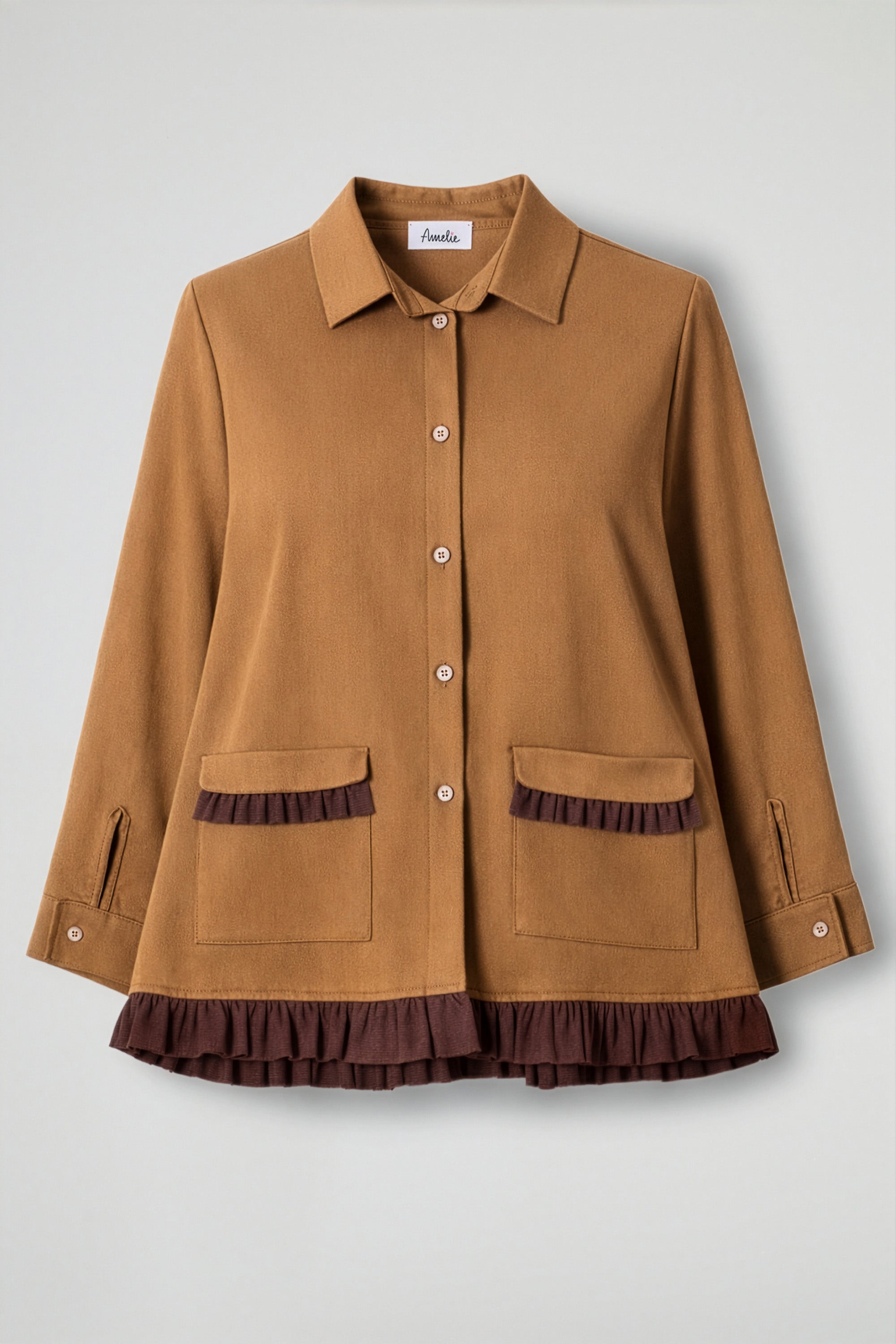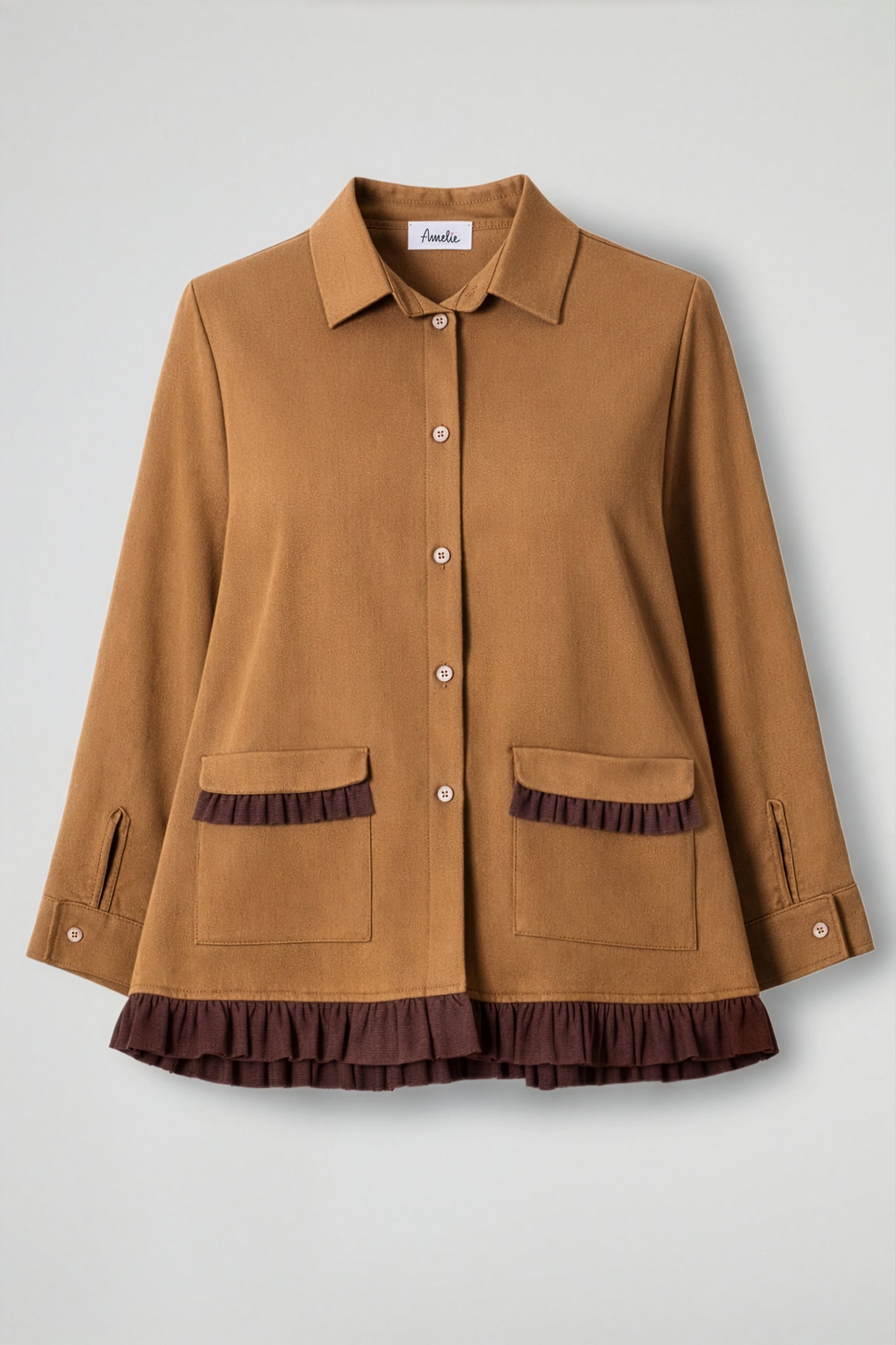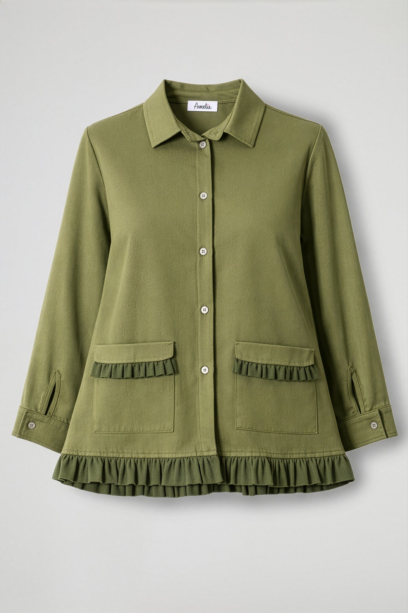 Lightweight jacket with a refined design; a relaxed fit with a front button closure and classic collar, perfect for a refined yet versatile look; the patch pockets are embellished with delicate ruffle details, also repeated at the bottom hem, adding movement and a romantic touch to the garment. Long sleeves with adjustable cuffs for a practical and adaptable fit.