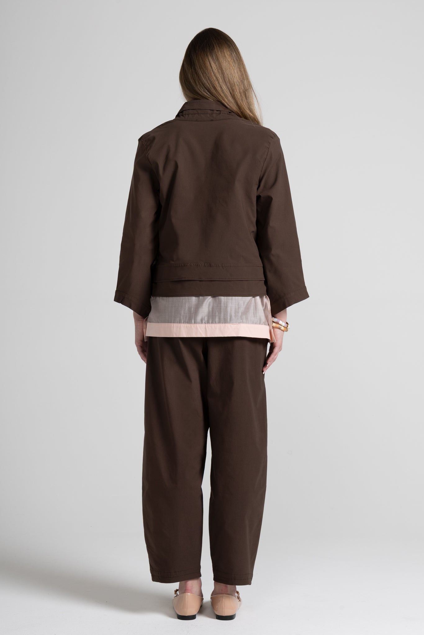 Giacca corta in tessuto di viscosa, scollo a V con rever e dettaglio impunture, chiusura frontale con coulisse tono su tono, manica lunga con orlo ribattuto alto, fondo con orlo ribattuto alto. Linea ampia