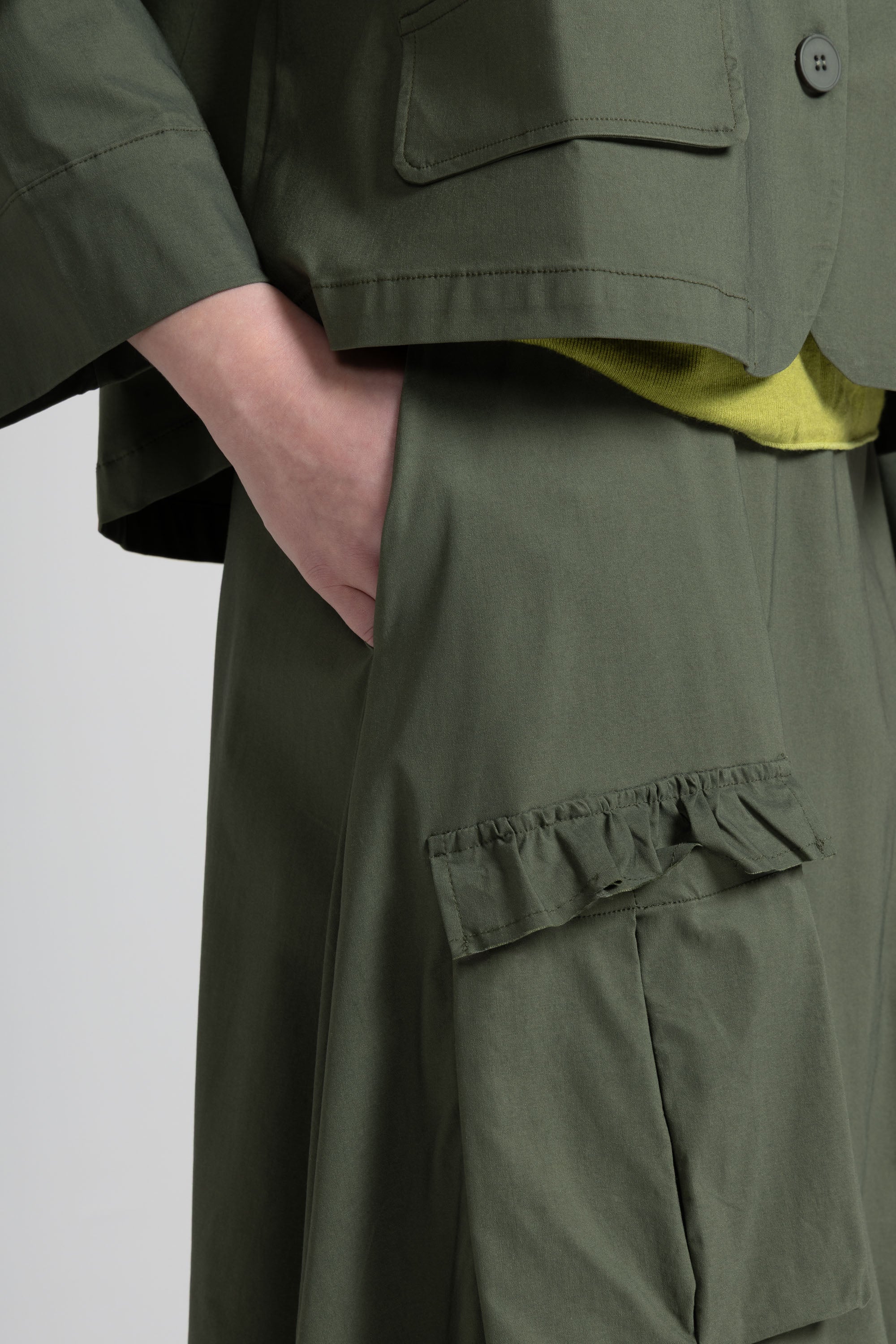 Short, boxy, slightly asymmetrical jacket in viscose fabric, shirt collar, long sleeves, front button closure, two patch pockets with flaps. Comfortable fit.