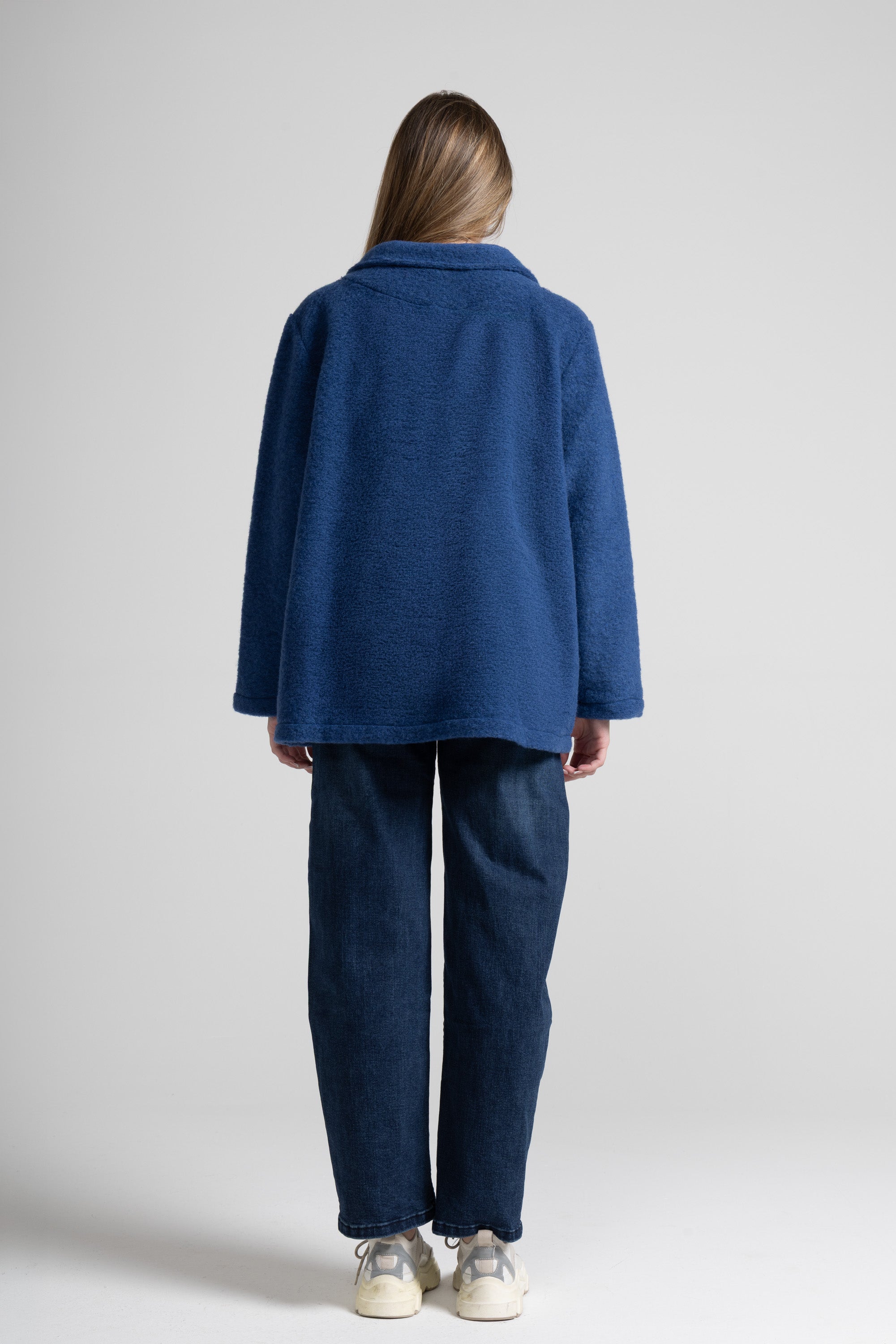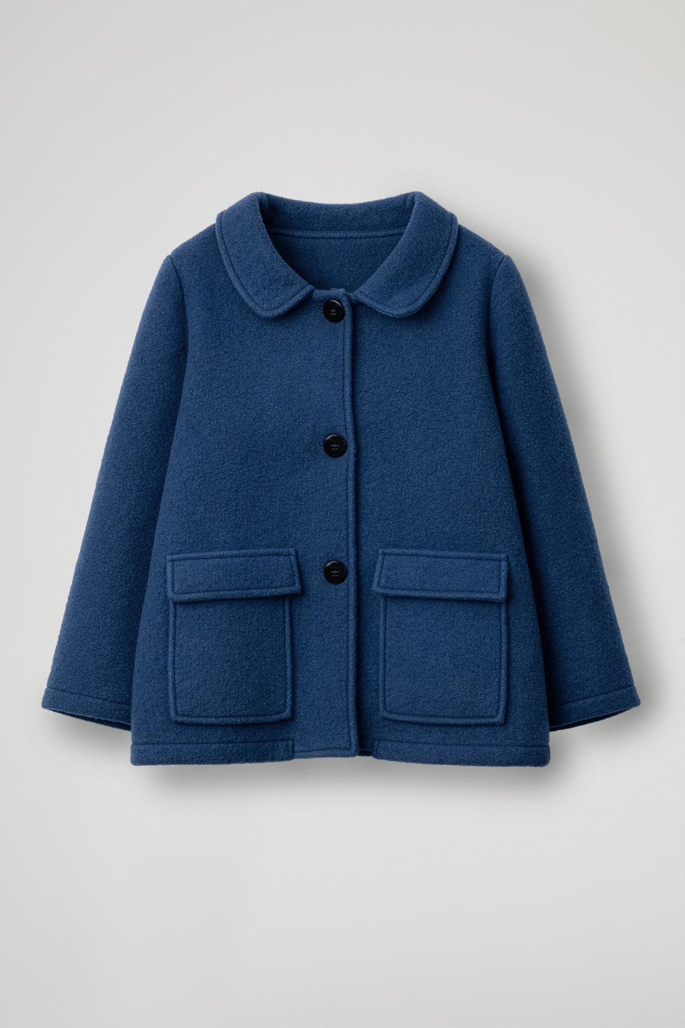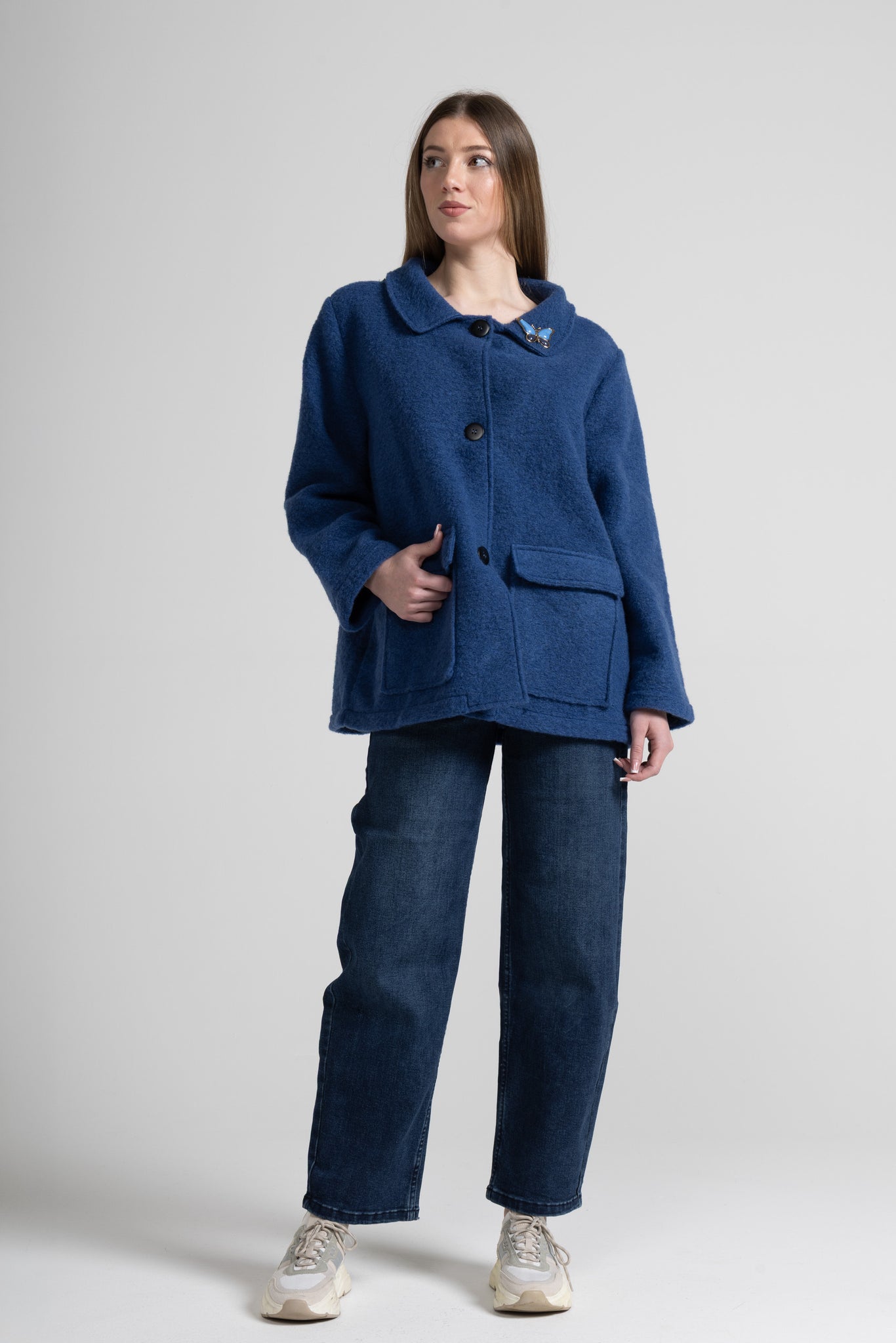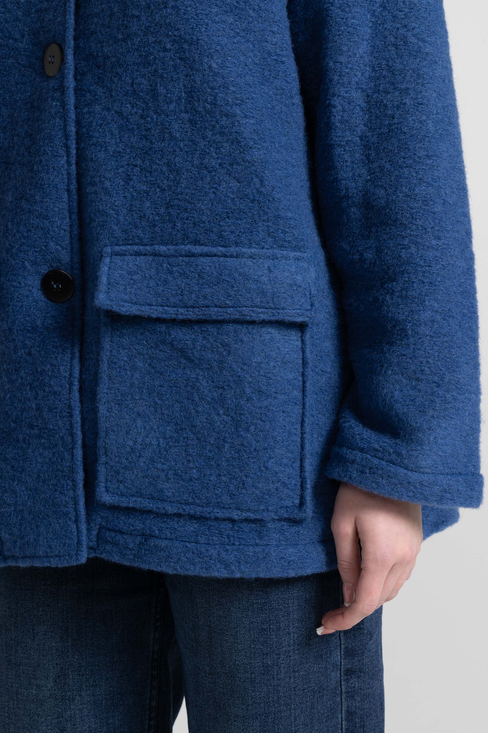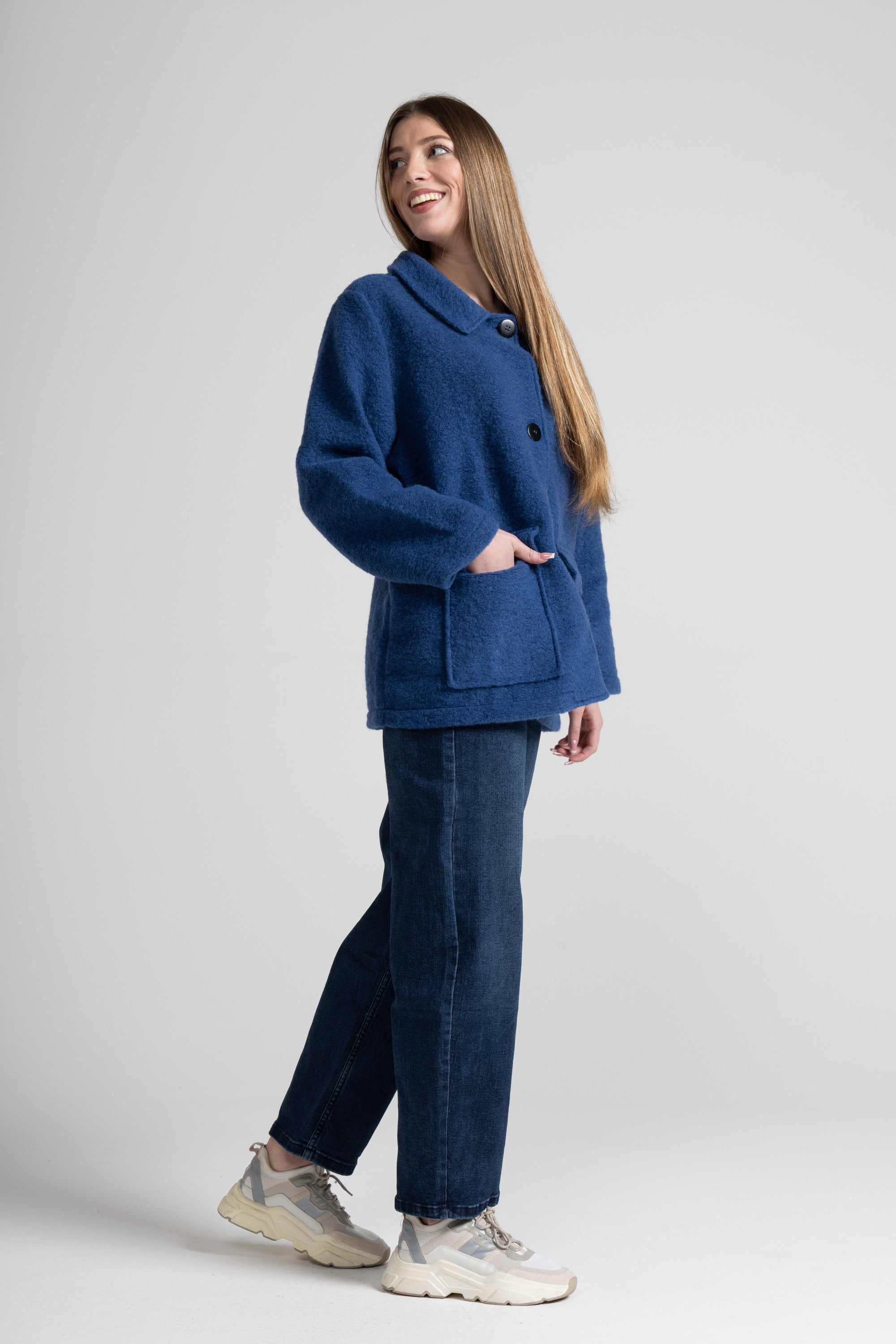 Short jacket, classic rounded collar, slightly dropped shoulders, long sleeves, front closure with three contrasting buttons, large patch pockets with flaps on the front. Relaxed fit.