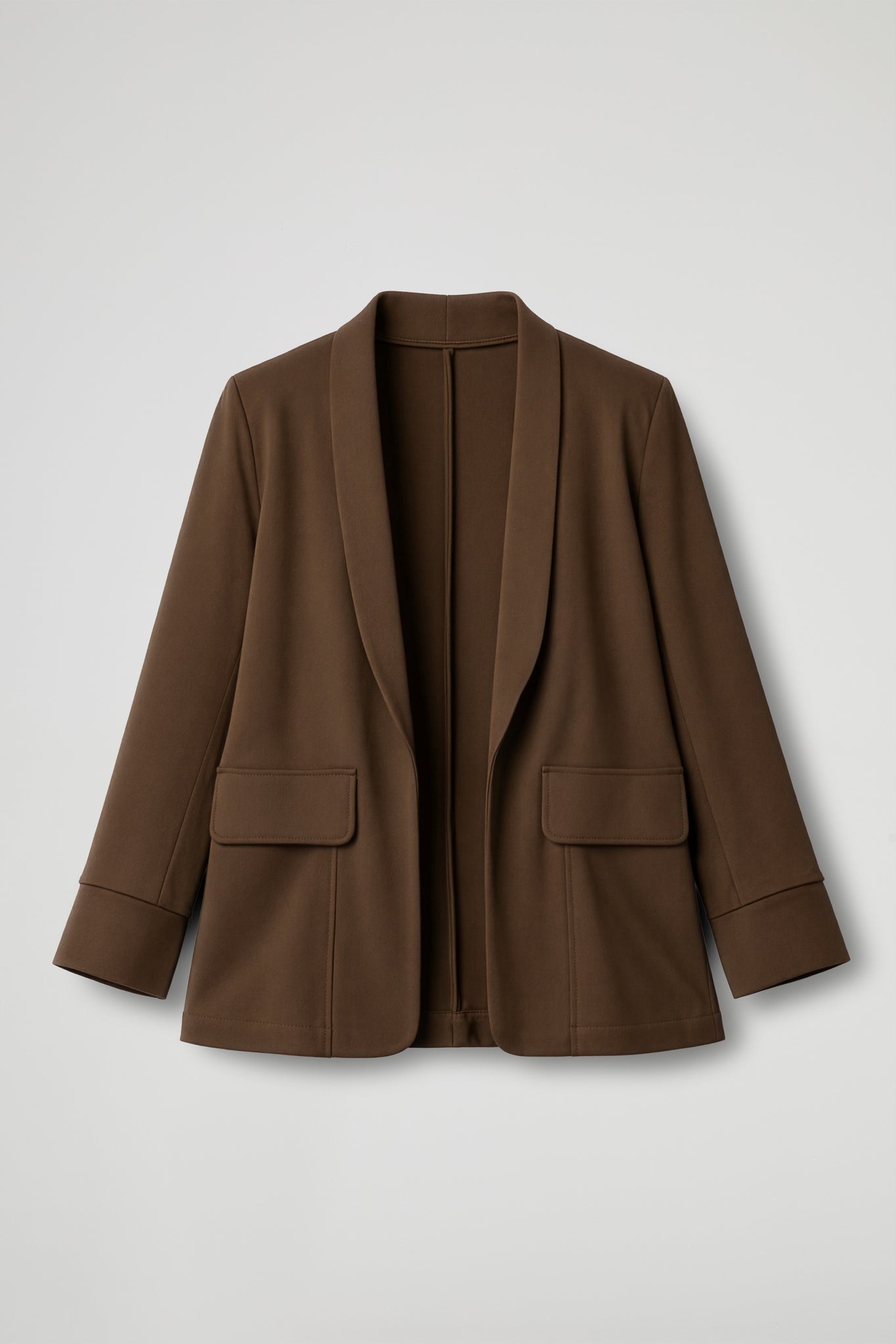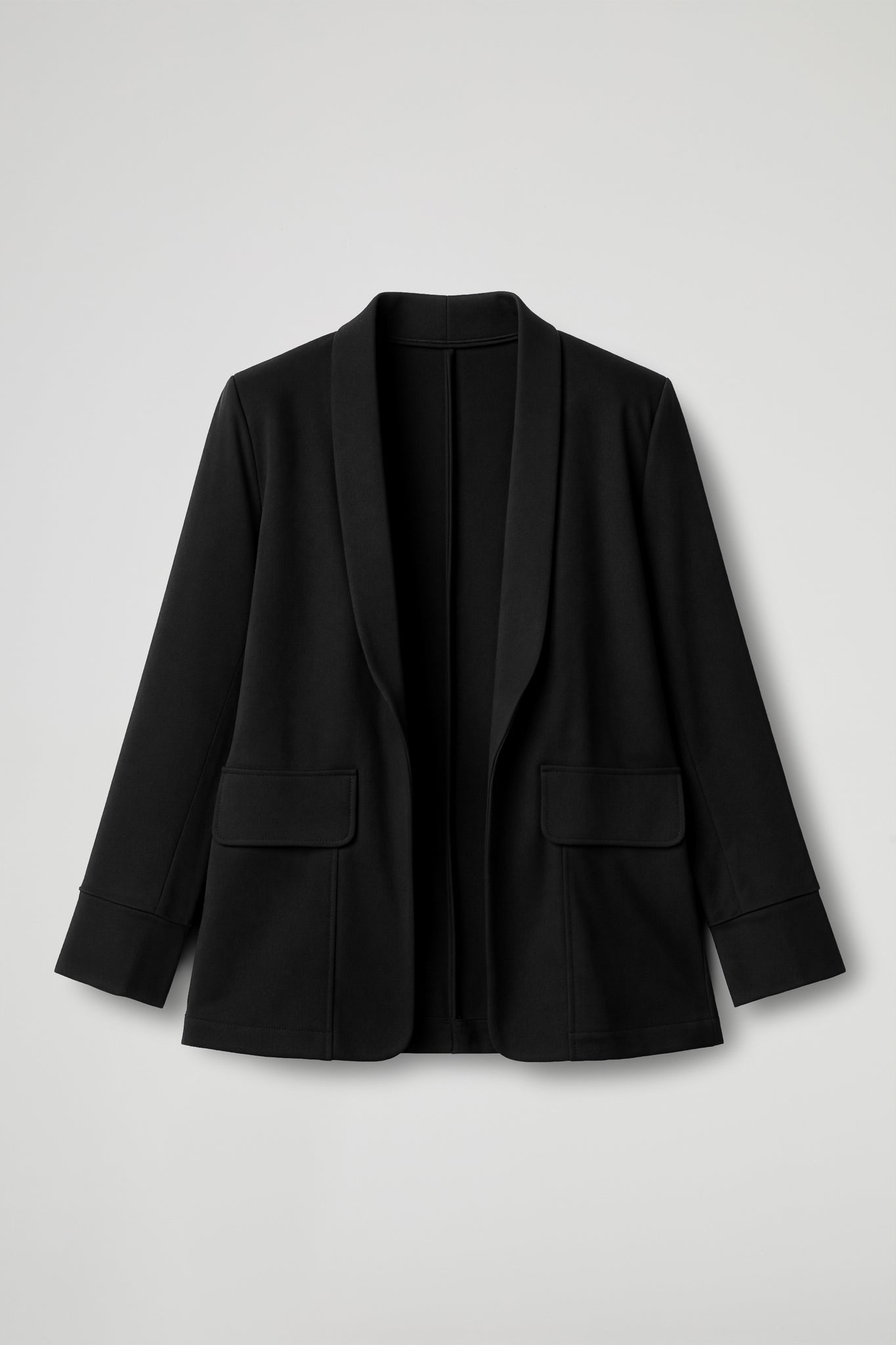 A blazer with a contemporary design and a comfortable fit. The buttonless style is open at the front , with a wide shawl collar that frames the décolleté and creates a clean, elegant line. The construction is designed to flow fluidly, with soft shoulders and long sleeves finished with high cuffs for structure. The front features two patch pockets with flaps , positioned at the waist for a practical yet refined effect. The edges, hem, and trim are crafted with visible stitching and regular topstitching that define the profile of the garment, maintaining a simple yet refined look.