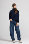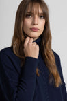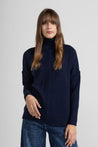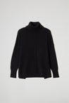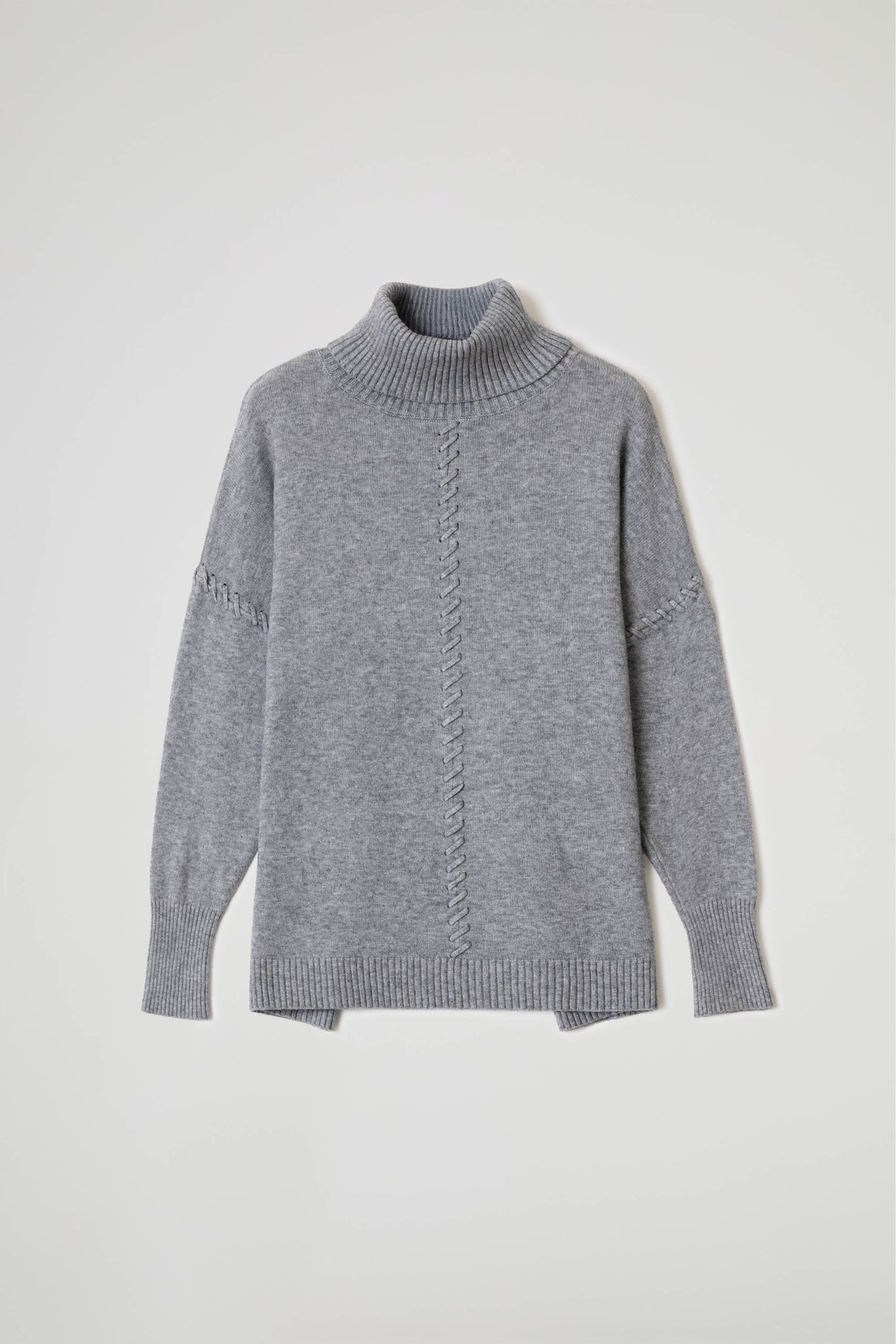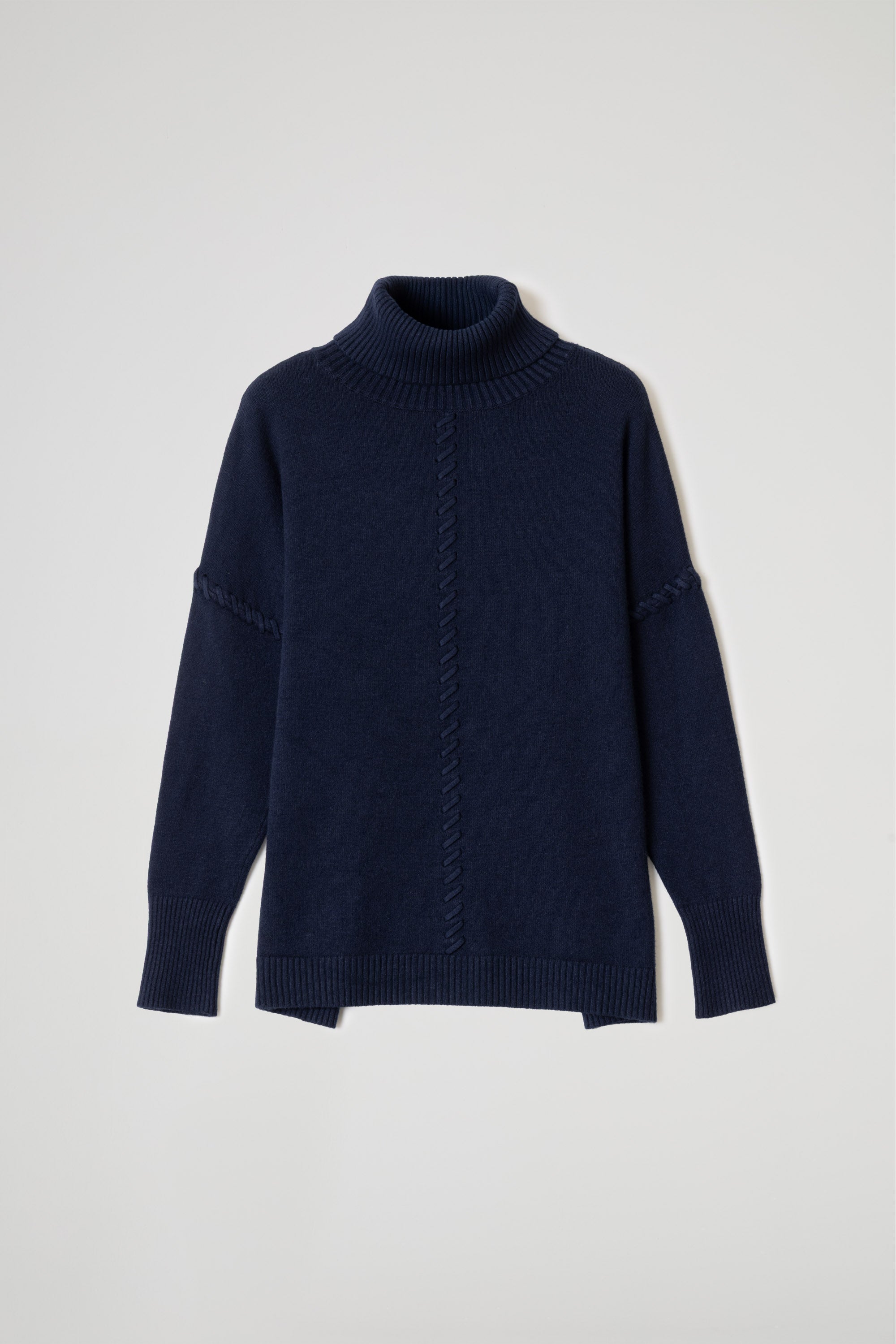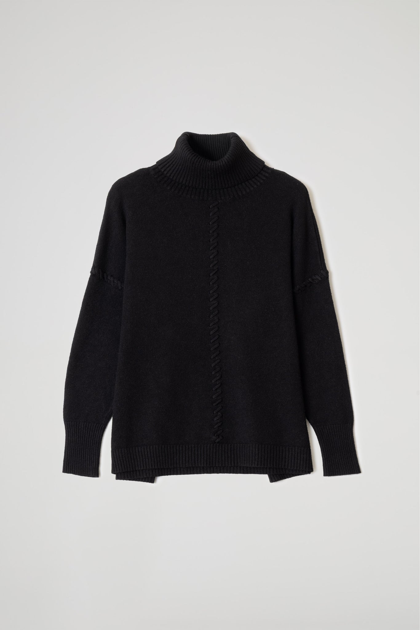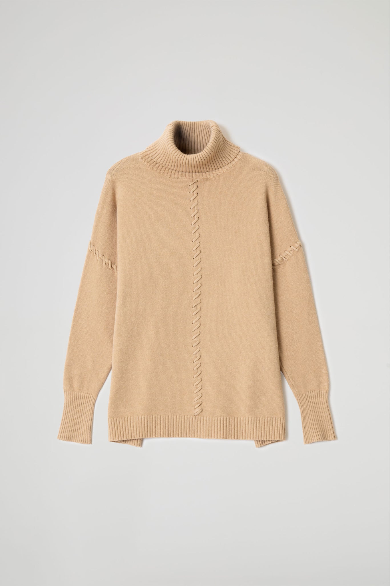 Oversized sweater in soft viscose jersey, high and roll-up collar made of ribbed knit, slightly dropped shoulders, long sleeves enriched by horizontal braided stitching and high cuffs with elasticated ribbing, braided stitching on the front, ribbed hem. Soft fit.