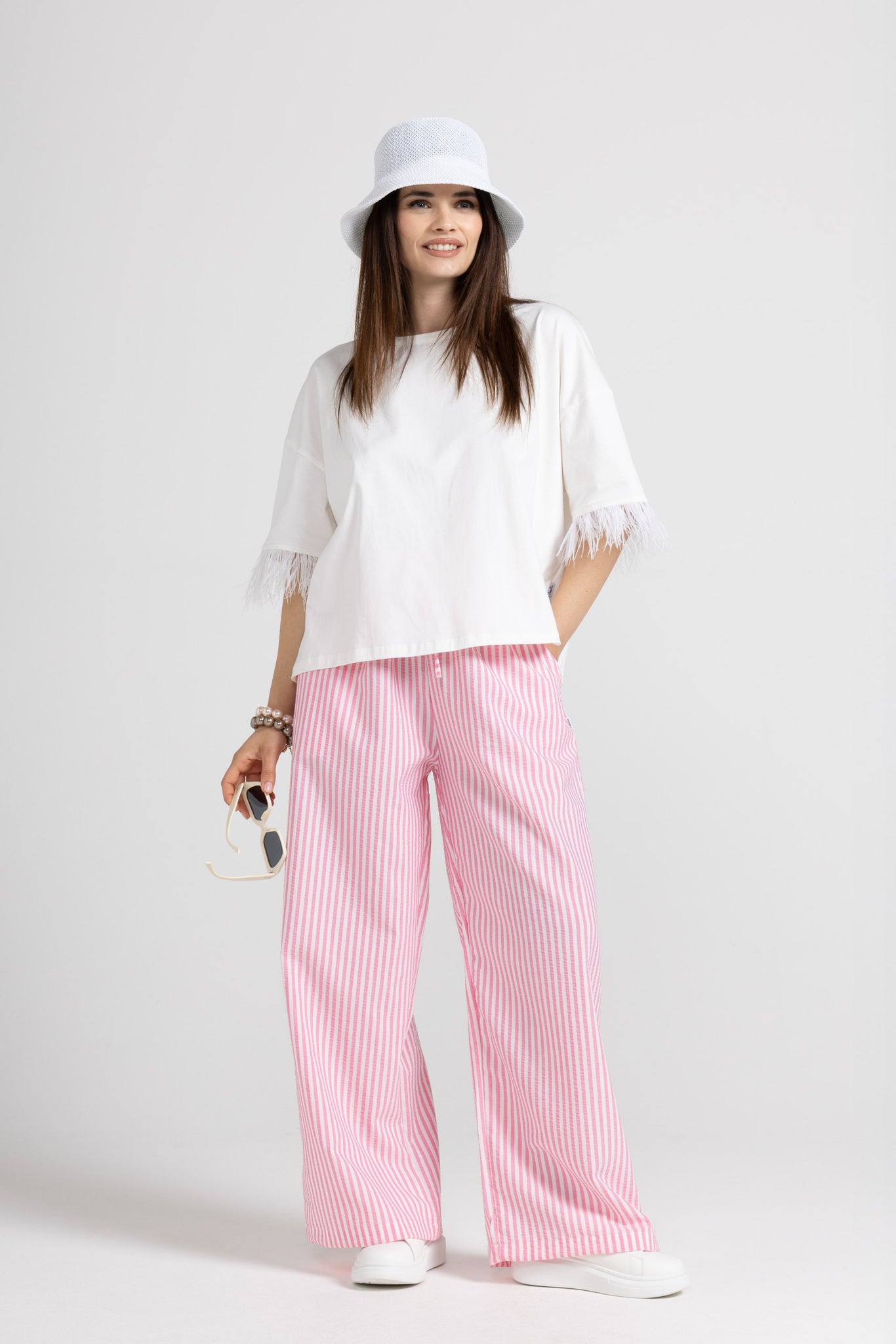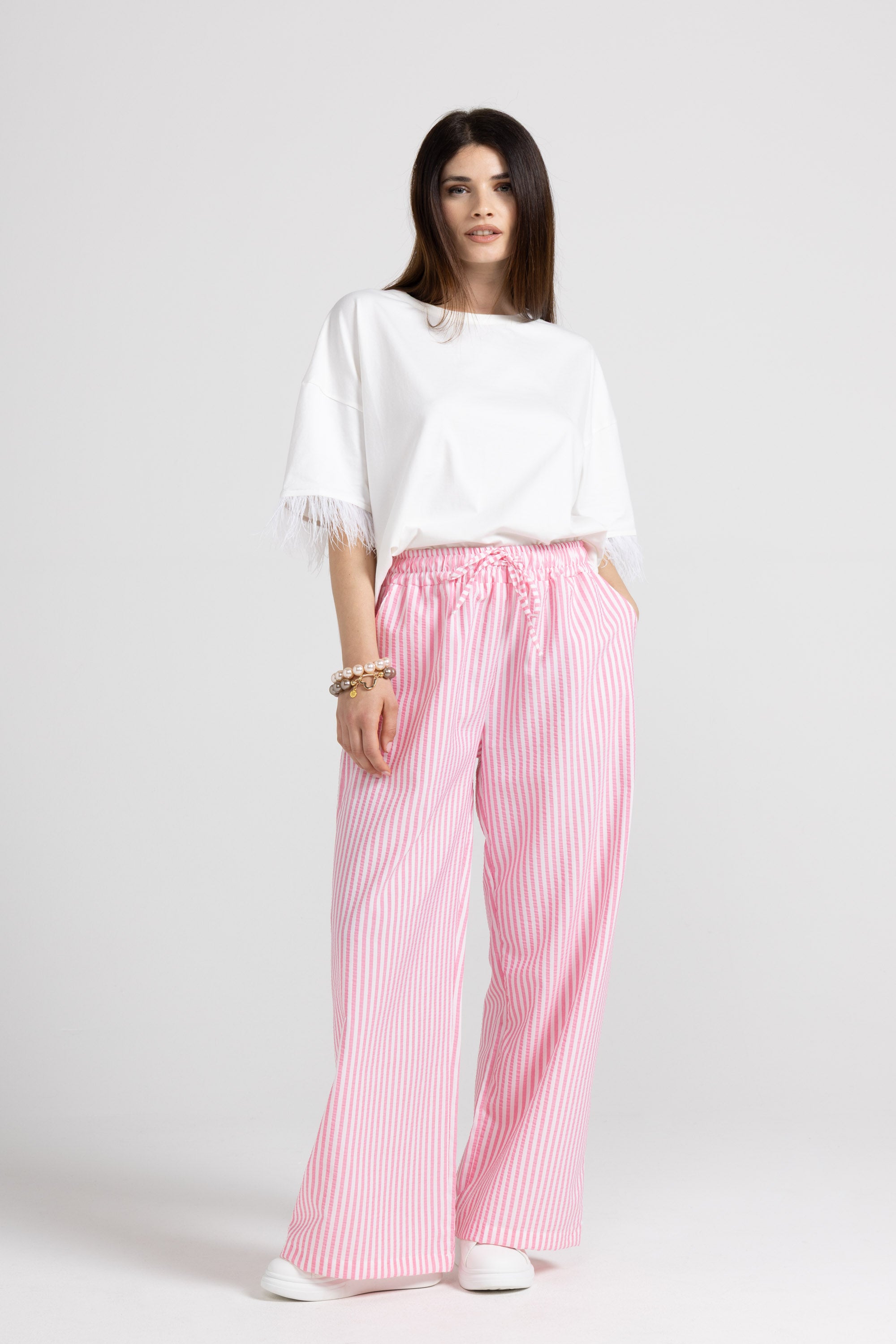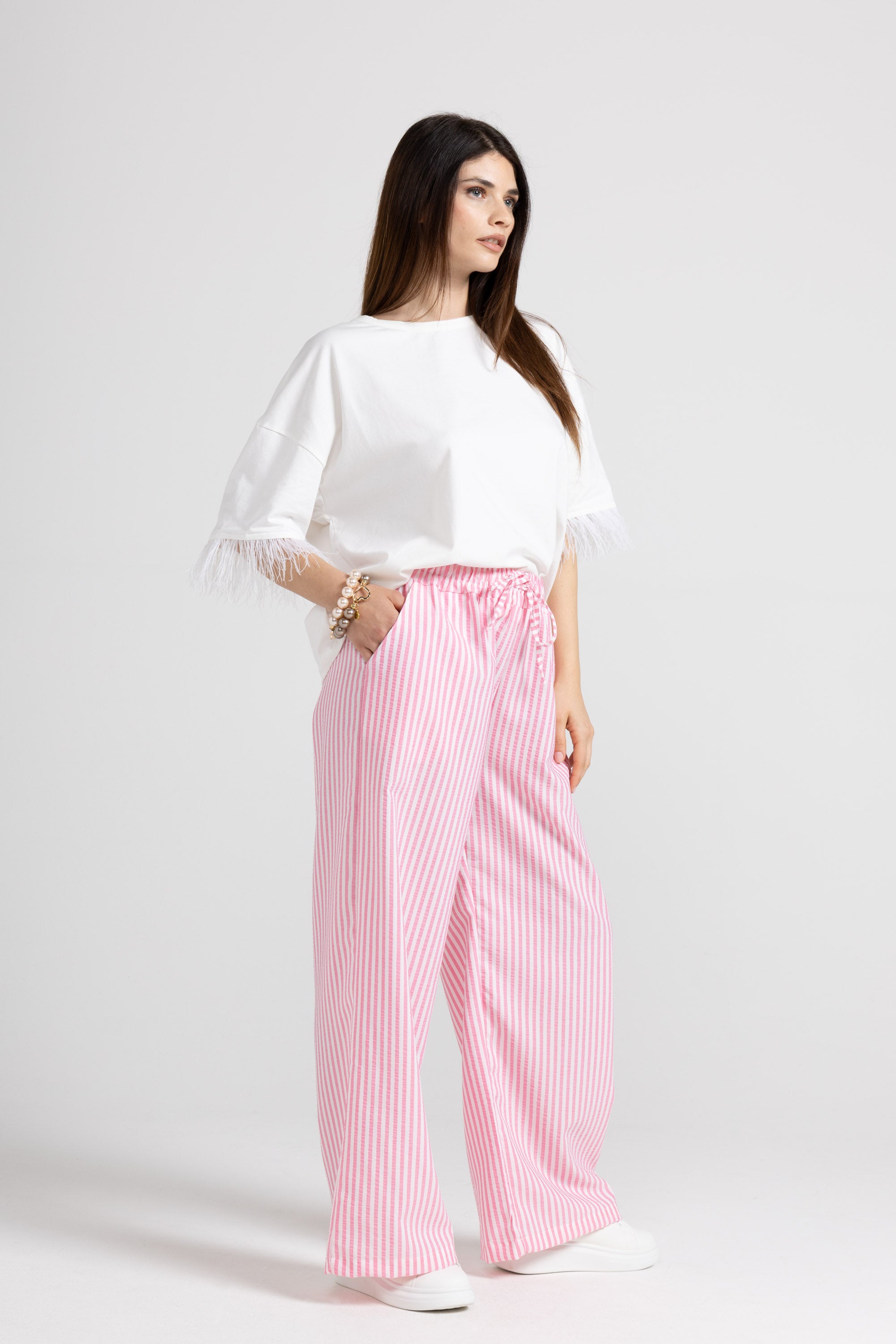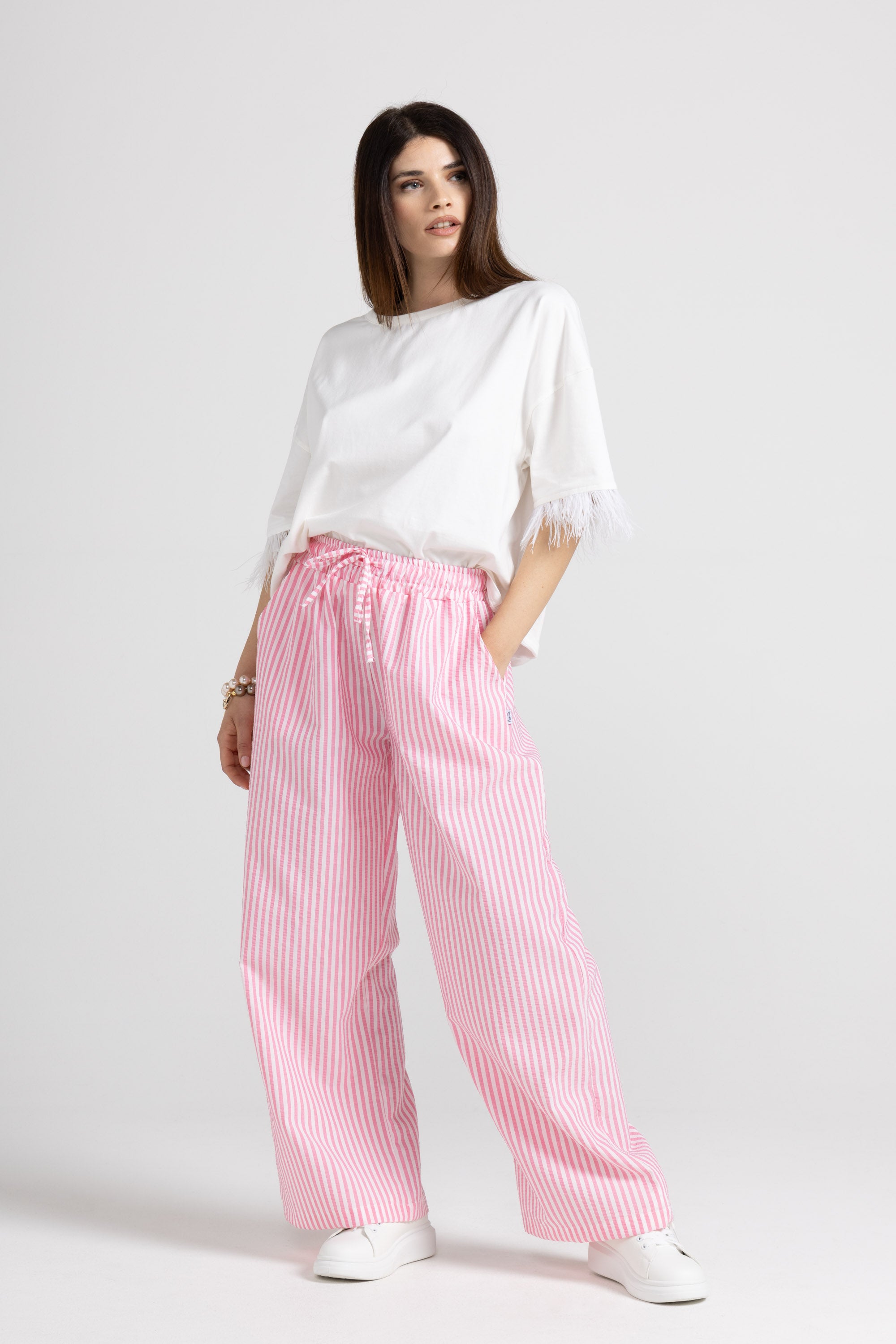 PALAZZO TROUSERS IN STRIPED VISCOSE FABRIC WITH ELASTIC AND ADJUSTABLE DRAWSTRING AT THE WAIST, FRENCH POCKETS.