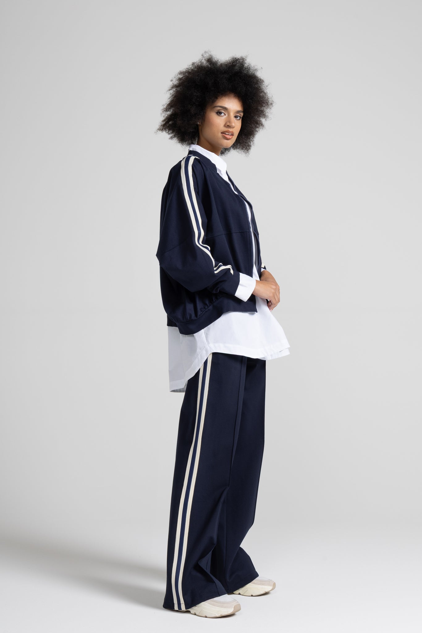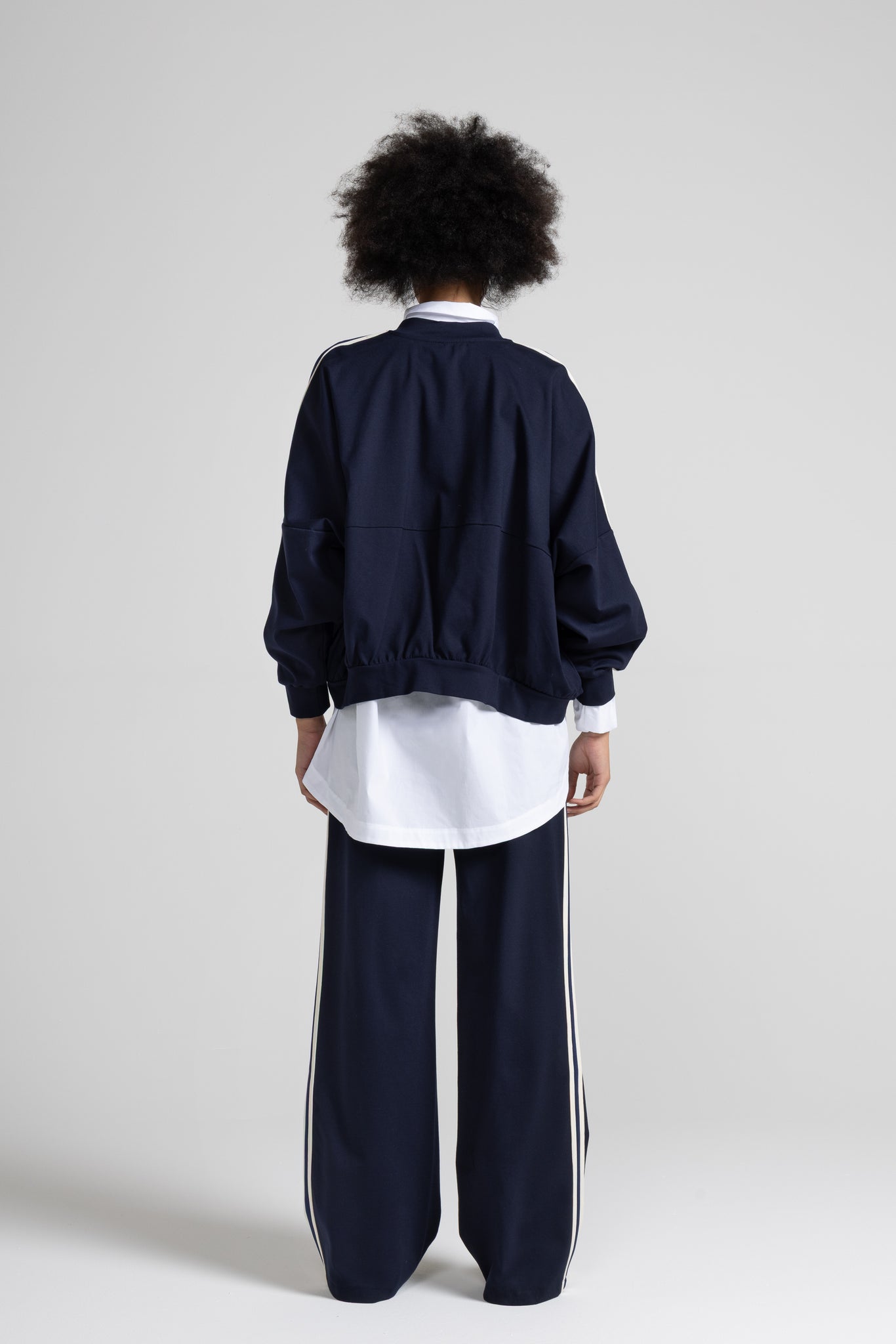 PALAZZO TROUSERS IN MILAN STITCH VISCOSE, ELASTIC AND ADJUSTABLE DRAWSTRING AT THE WAIST, PASSEMANE DETAIL ALONG THE LENGTH OF THE LEG.