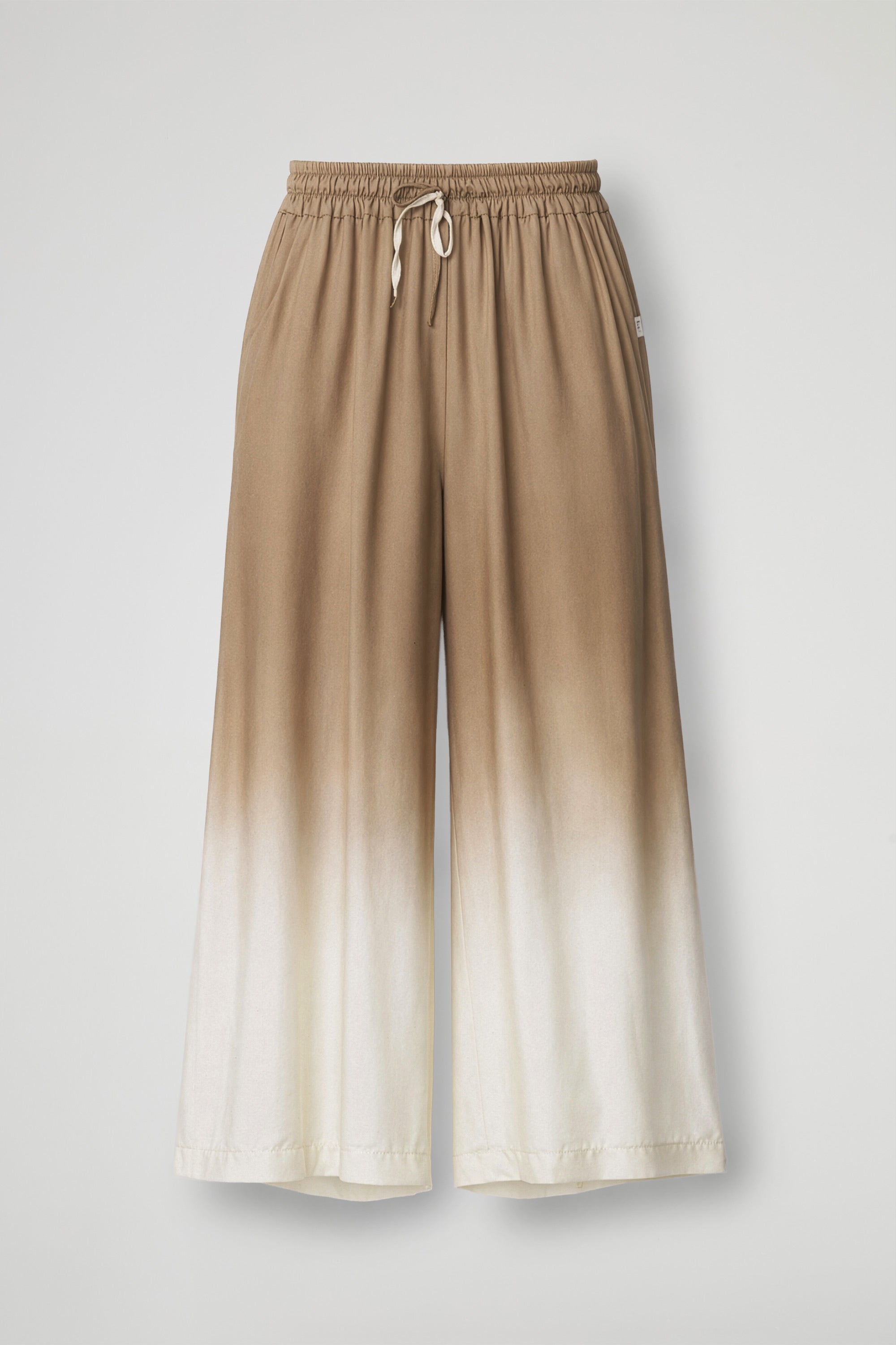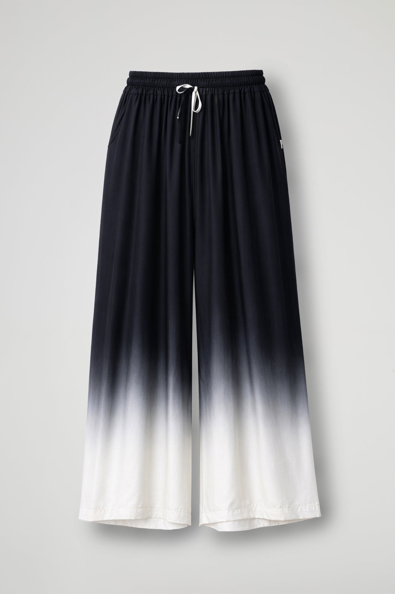 Palazzo pants, designed for a relaxed yet refined look. The elasticized gathered waistband adjusts easily, while the drawstring allows for adjustable fit. The extra-wide leg enhances the silhouette and accompanies movement, while the gradient color adds a unique and luminous touch.