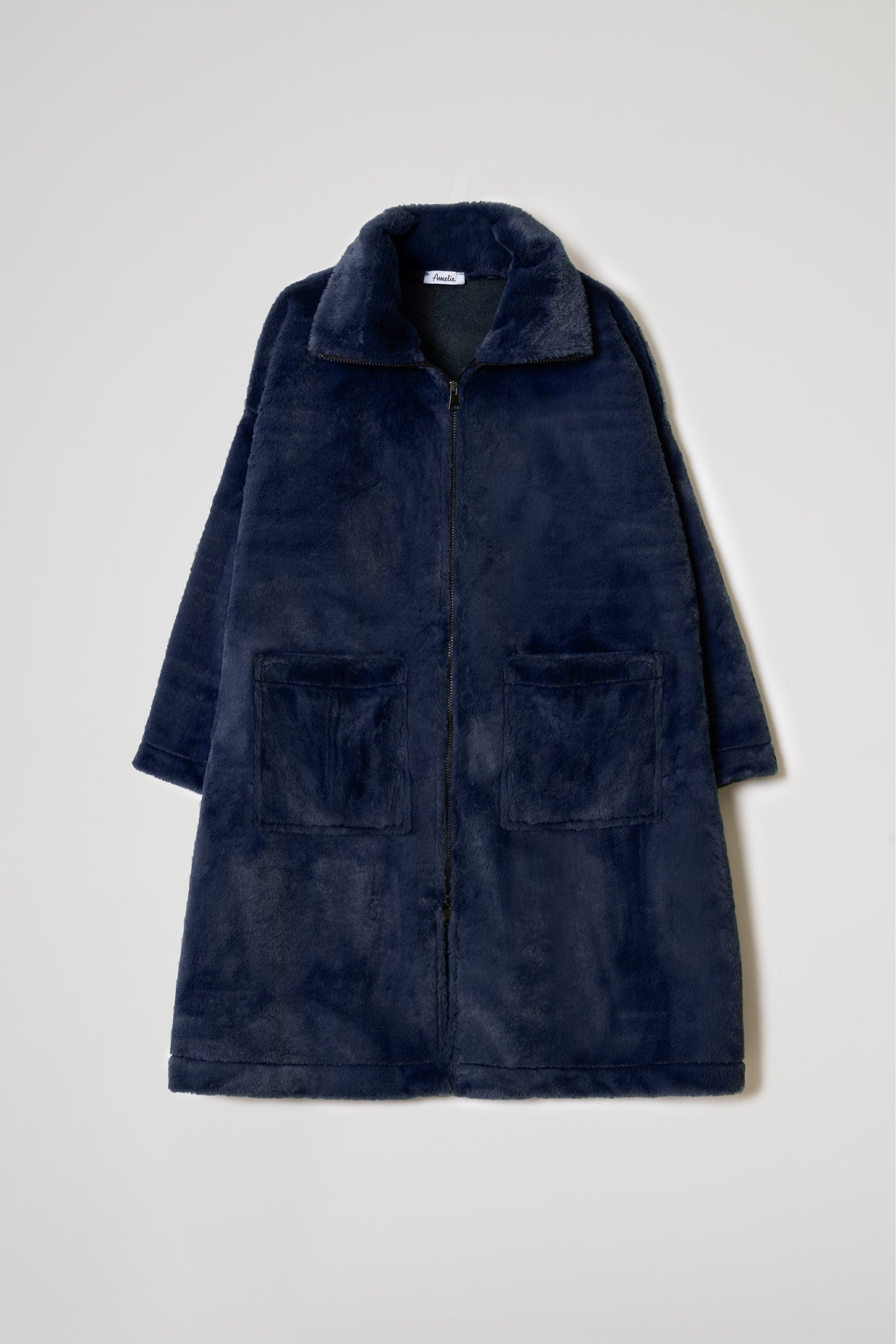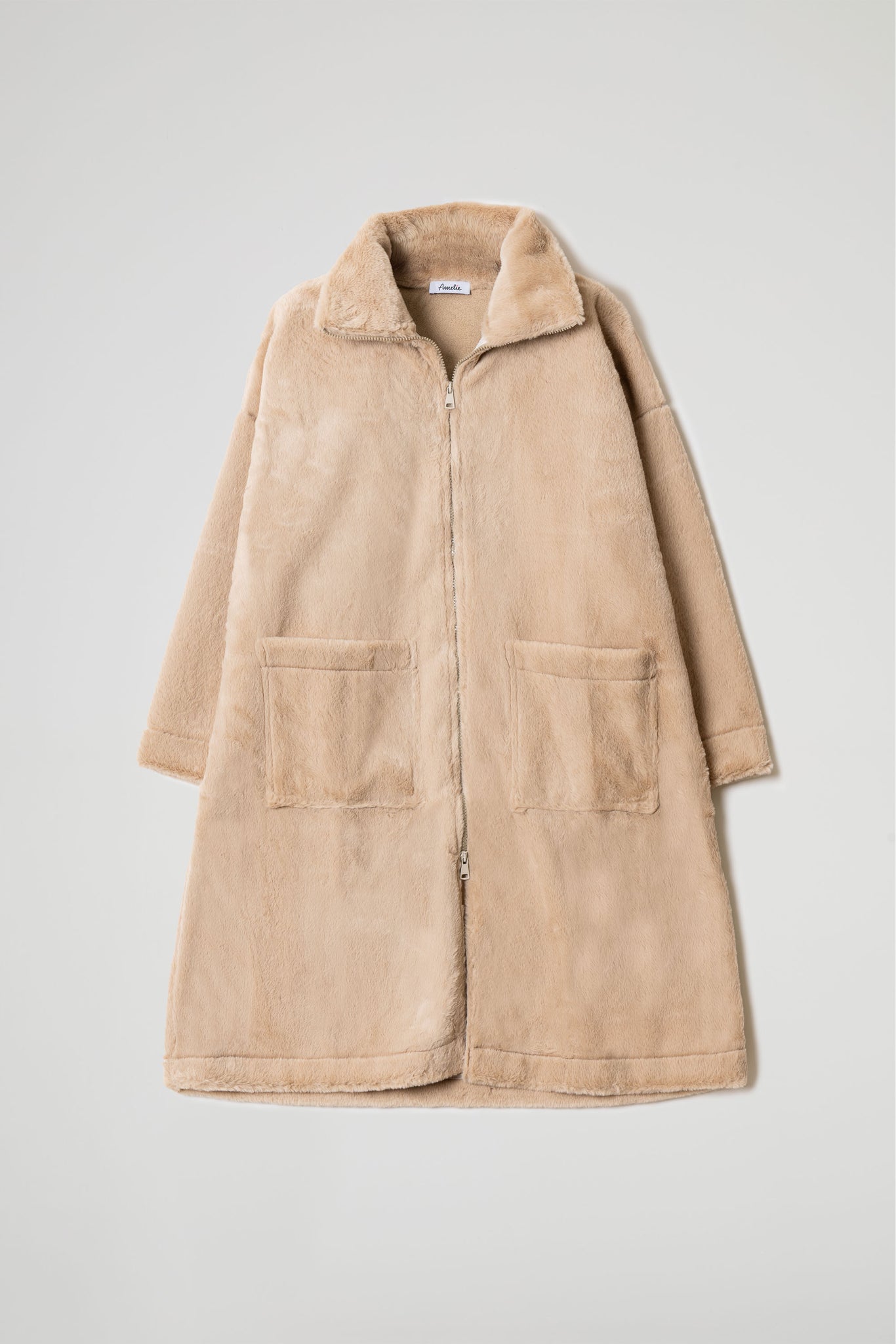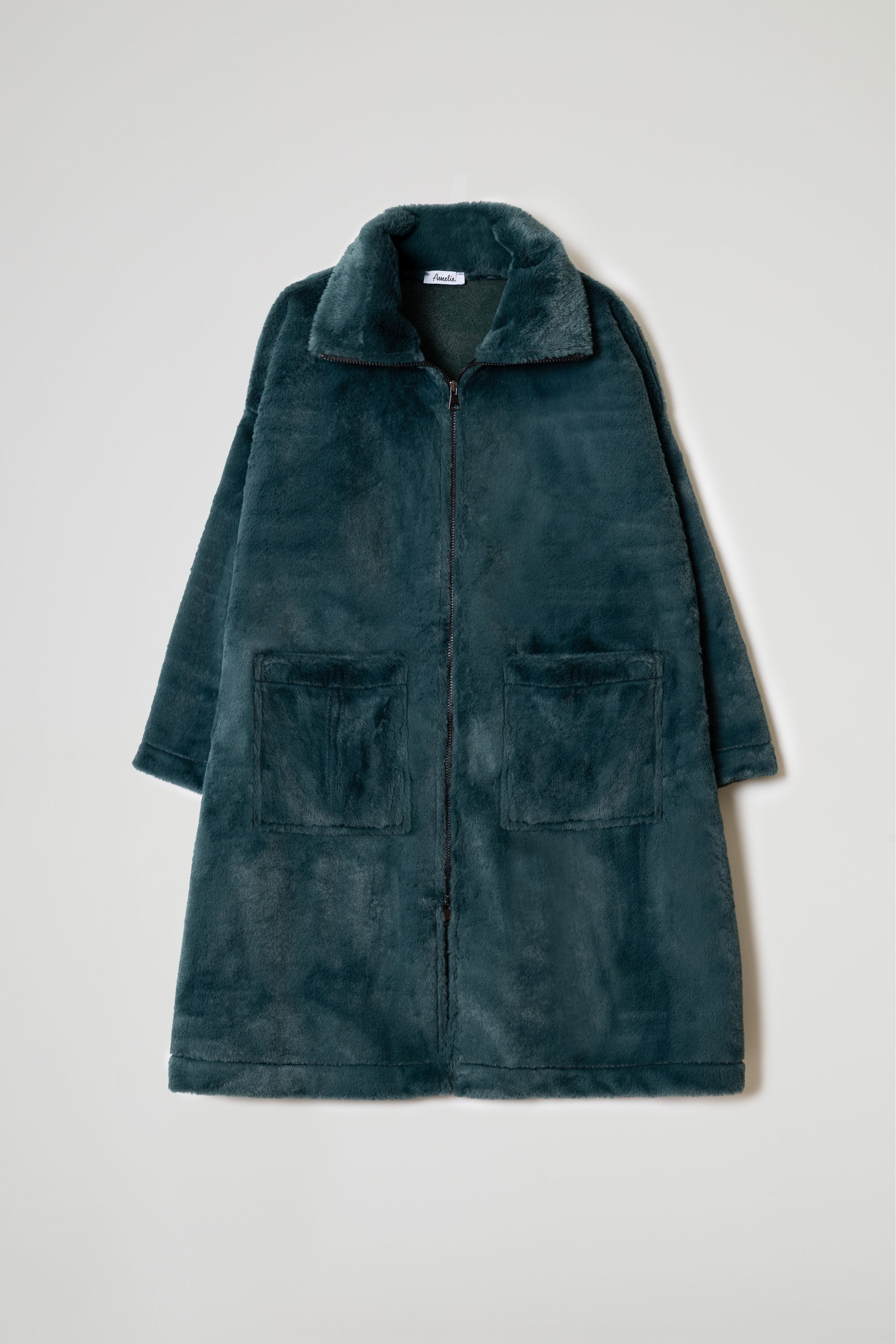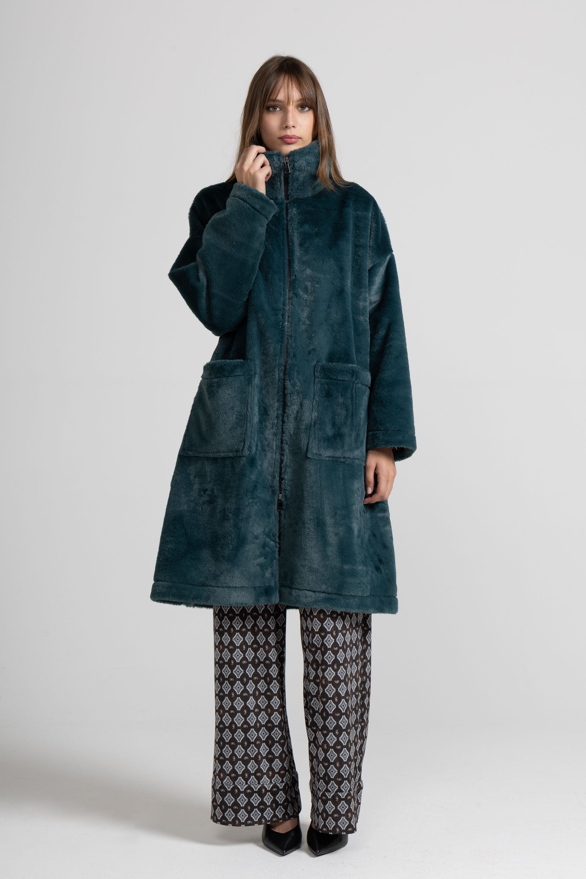 Cappotto lungo in morbida pelliccia sintetica effetto velluto che regala una sensazione di calore e morbidezza al tatto.