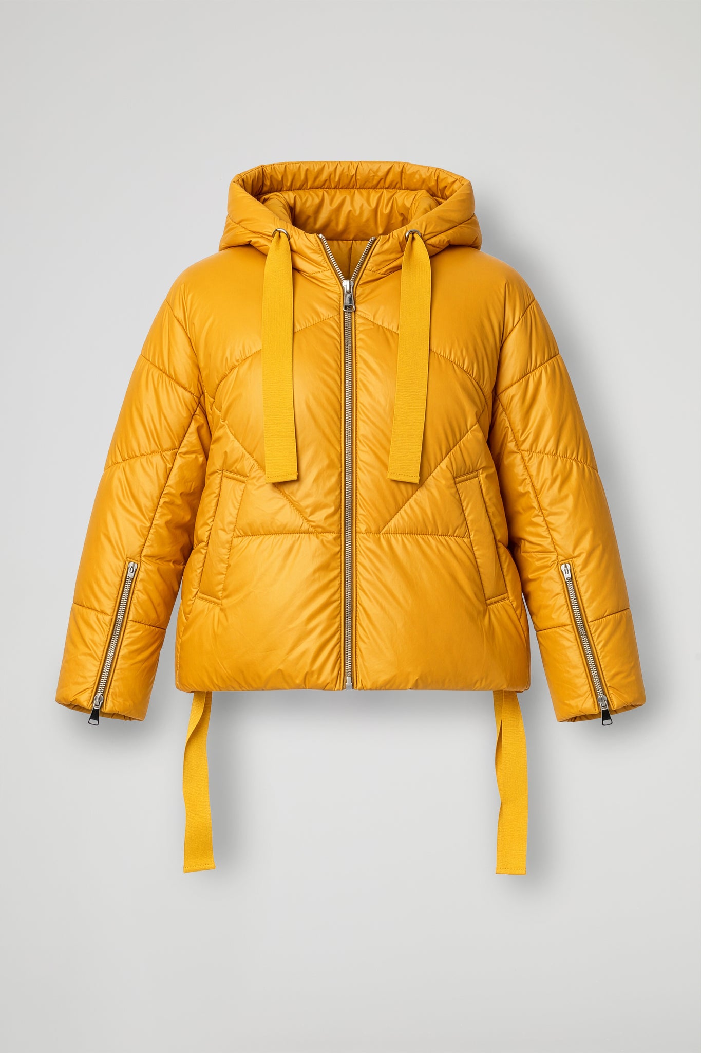Piumino corto trapuntato, cappuccio regolabile con nastro tono su tono , manica lunga con apertura zip sul fondo, chiusura frontale con zip, tasche laterali con patta inclinata, coulisse a nastri regolabile sul fondo. Linea ampia