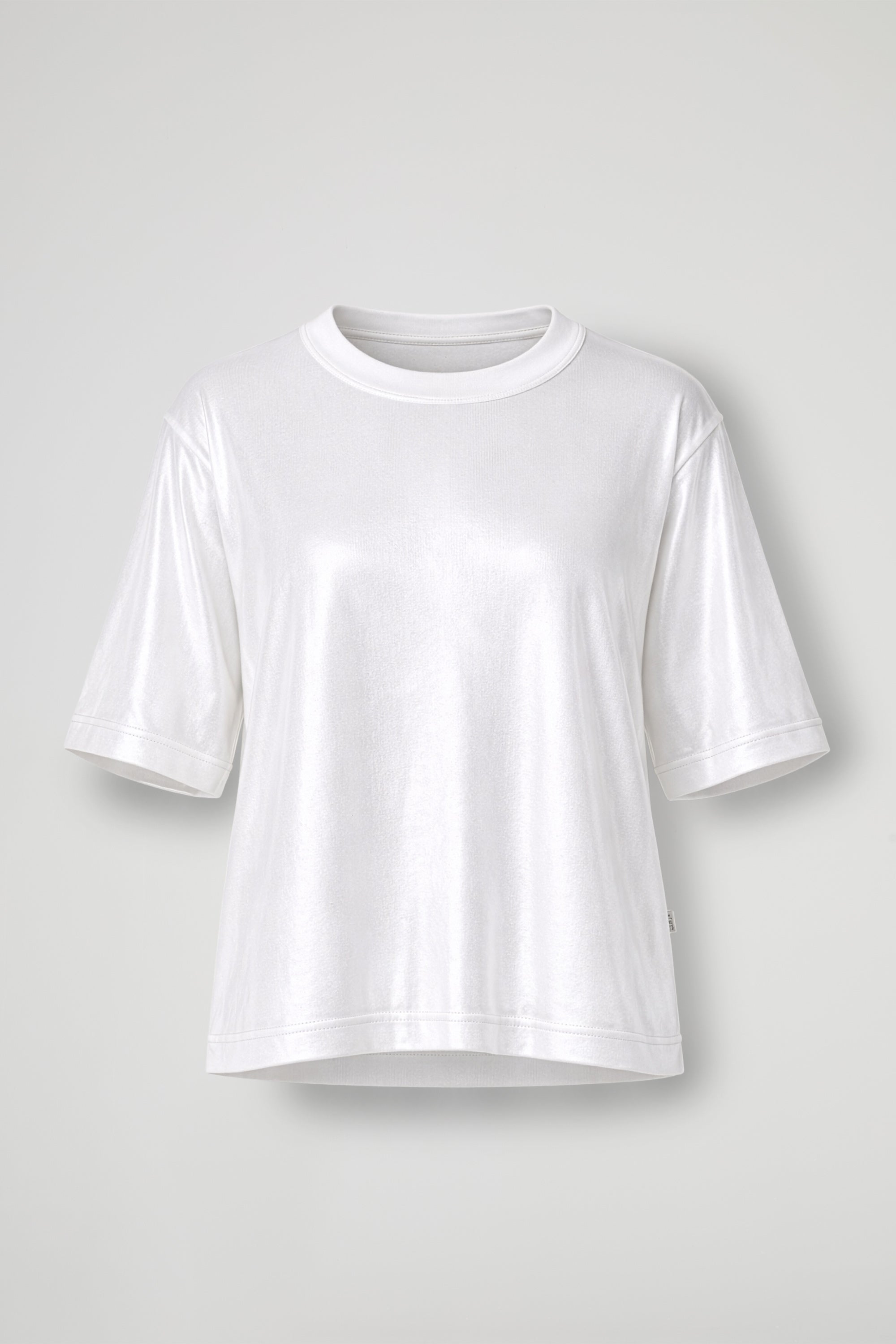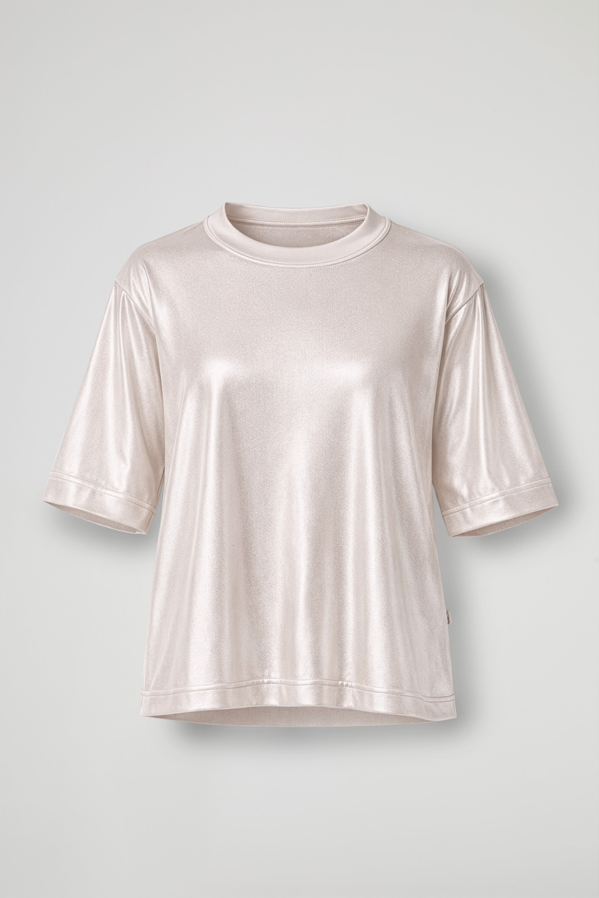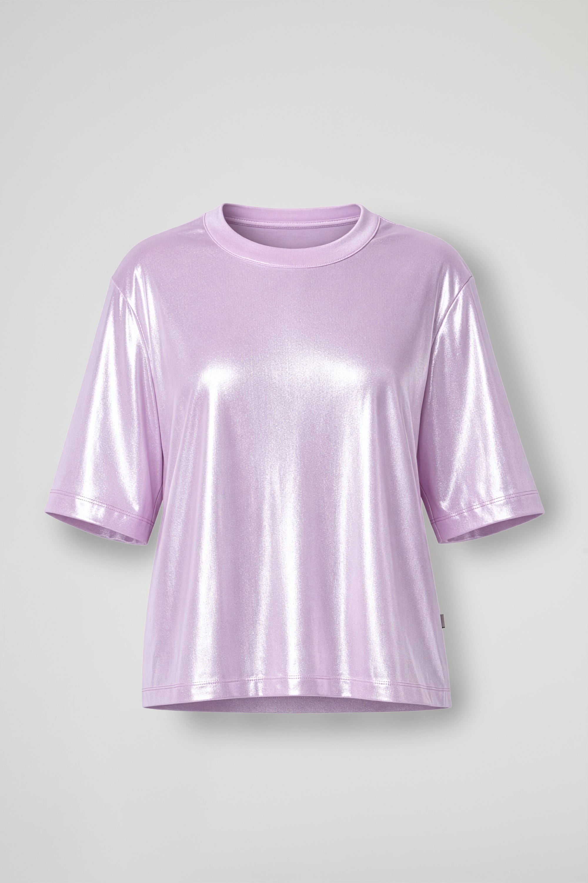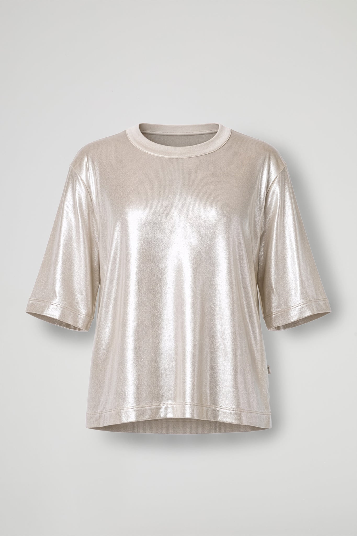 Laminated effect T -Shirt, a touch of glow that immediately lights up the look, soft, comfortable and spectacular: oversized line, wide sleeves and crew neck for an easy fit, while the shiny finish gives character to even the simplest outfit.