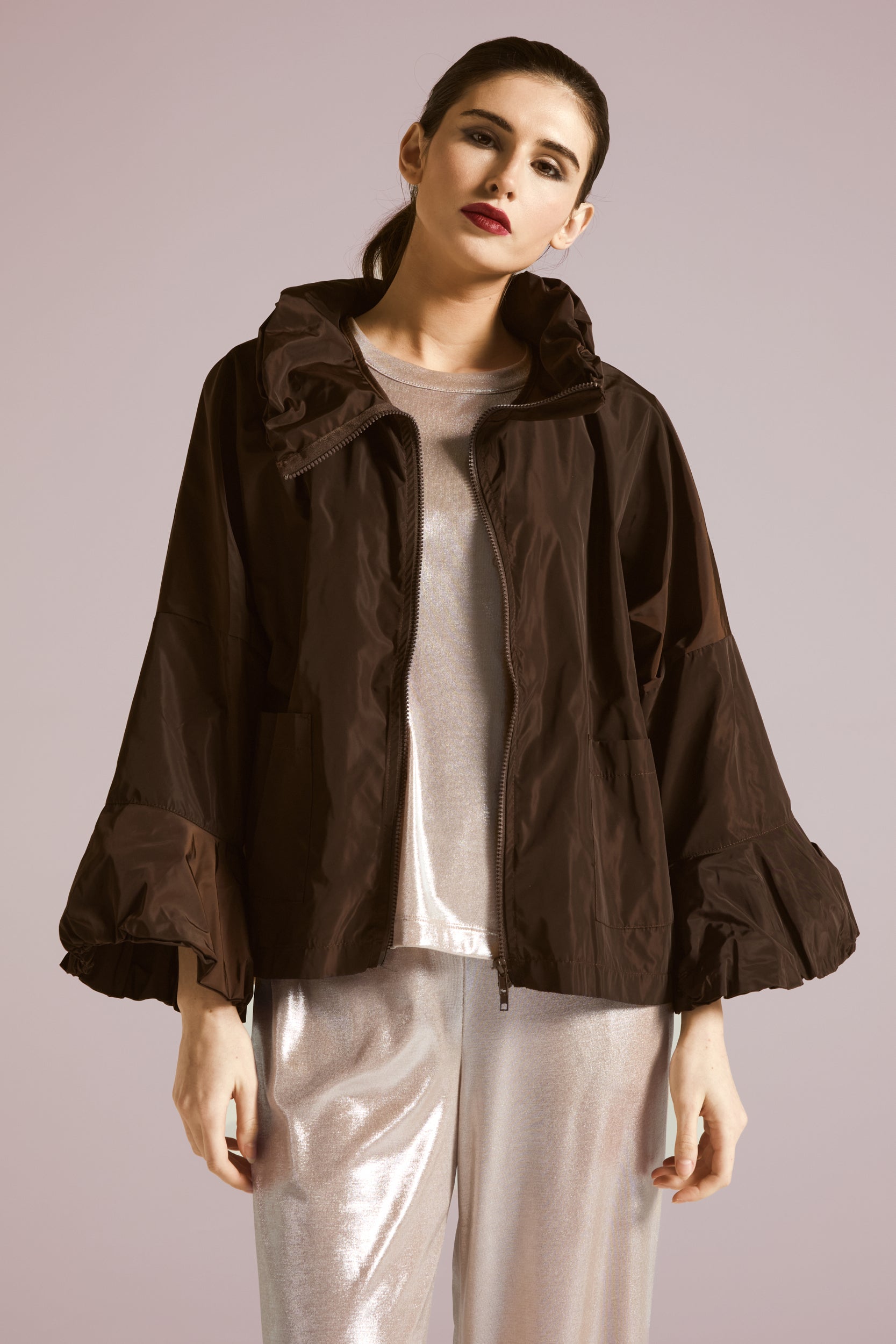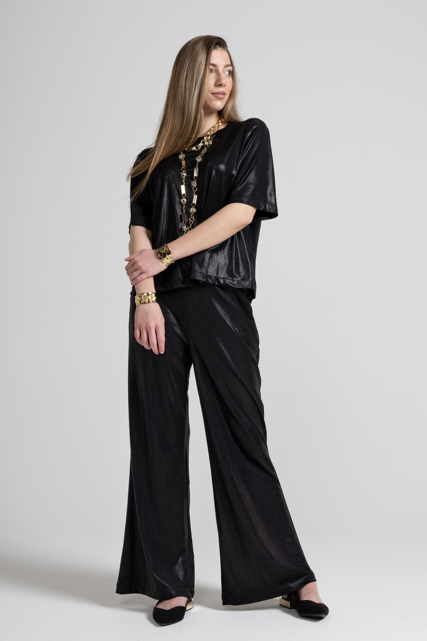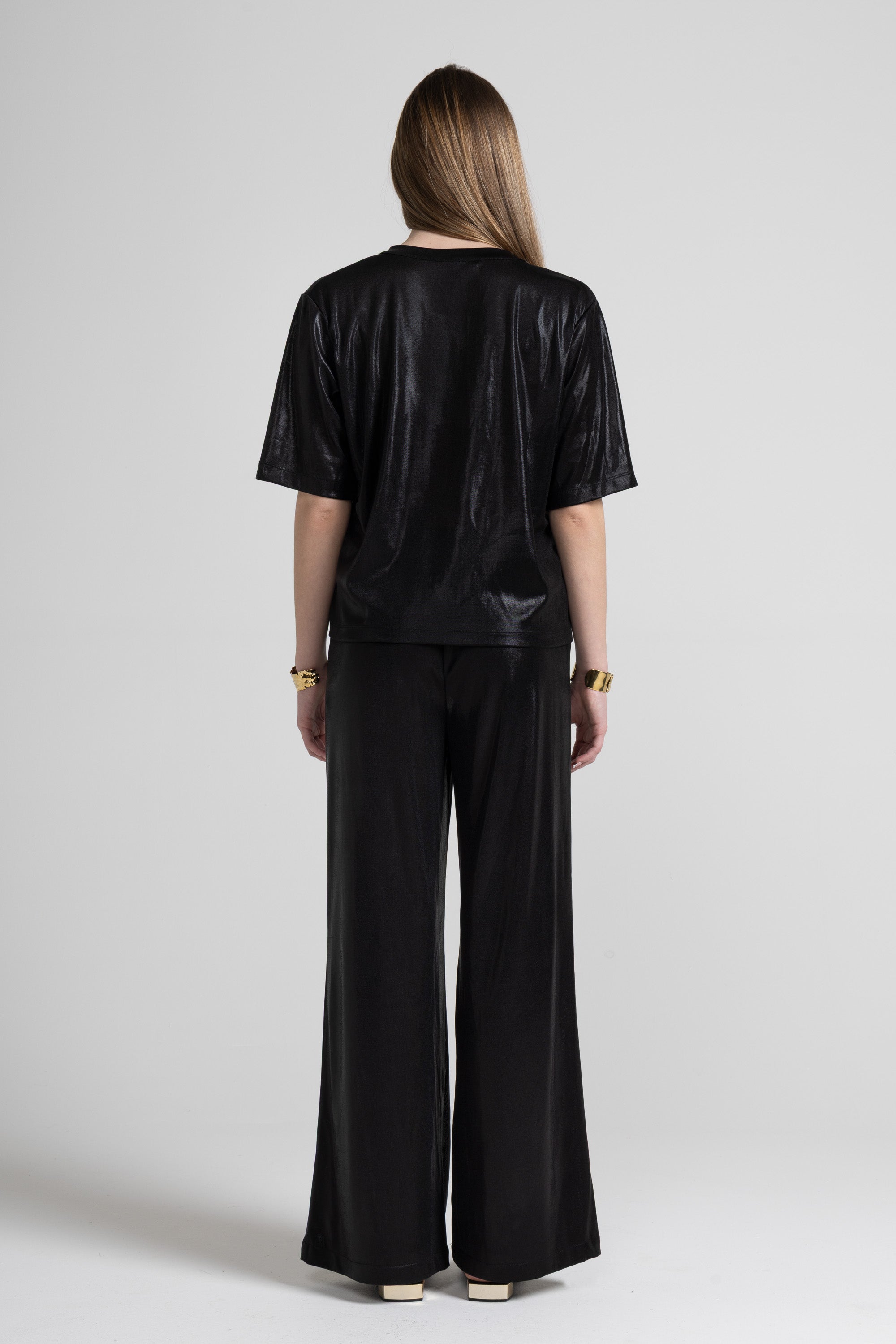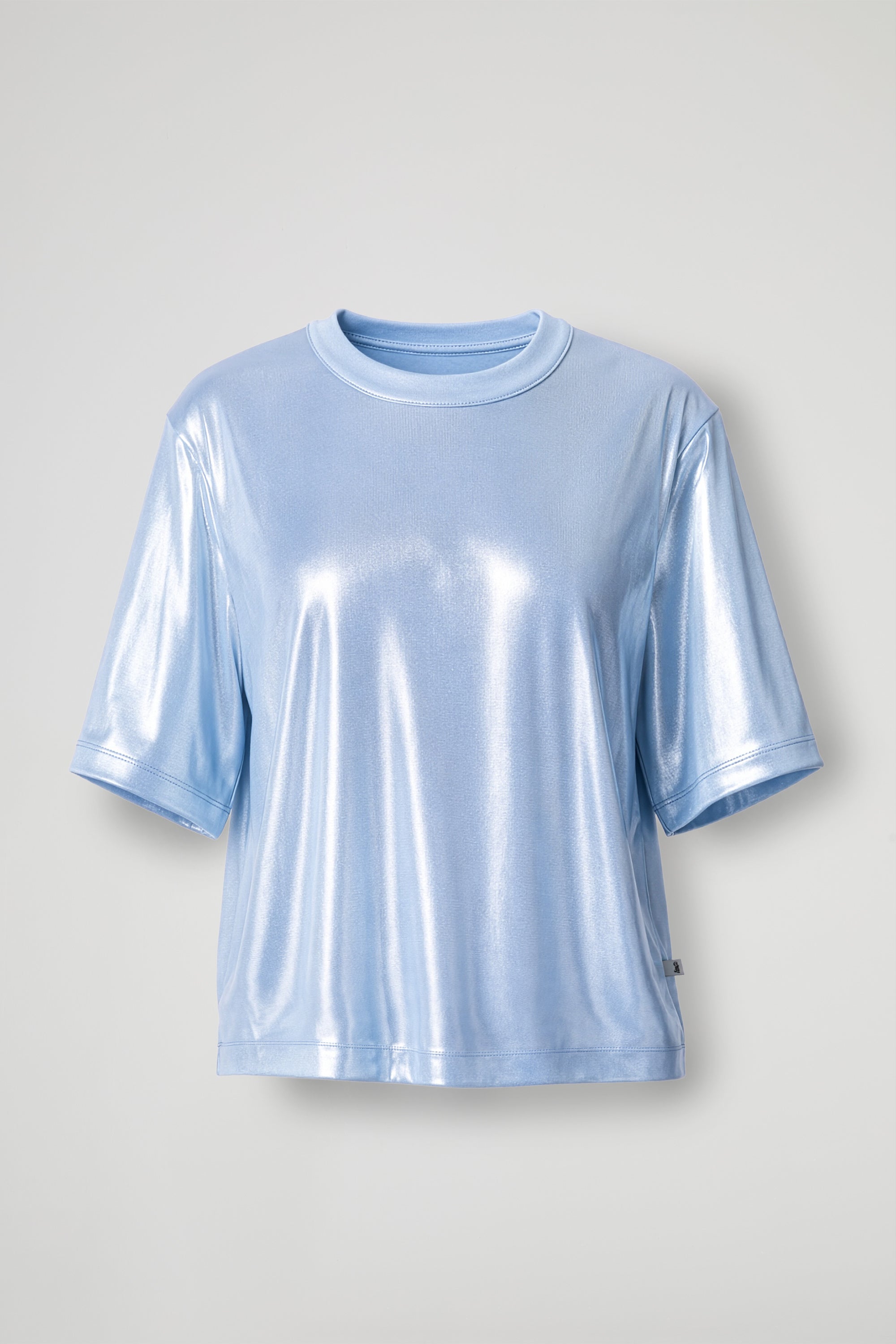 Laminated effect T -Shirt, a touch of glow that immediately lights up the look, soft, comfortable and spectacular: oversized line, wide sleeves and crew neck for an easy fit, while the shiny finish gives character to even the simplest outfit.