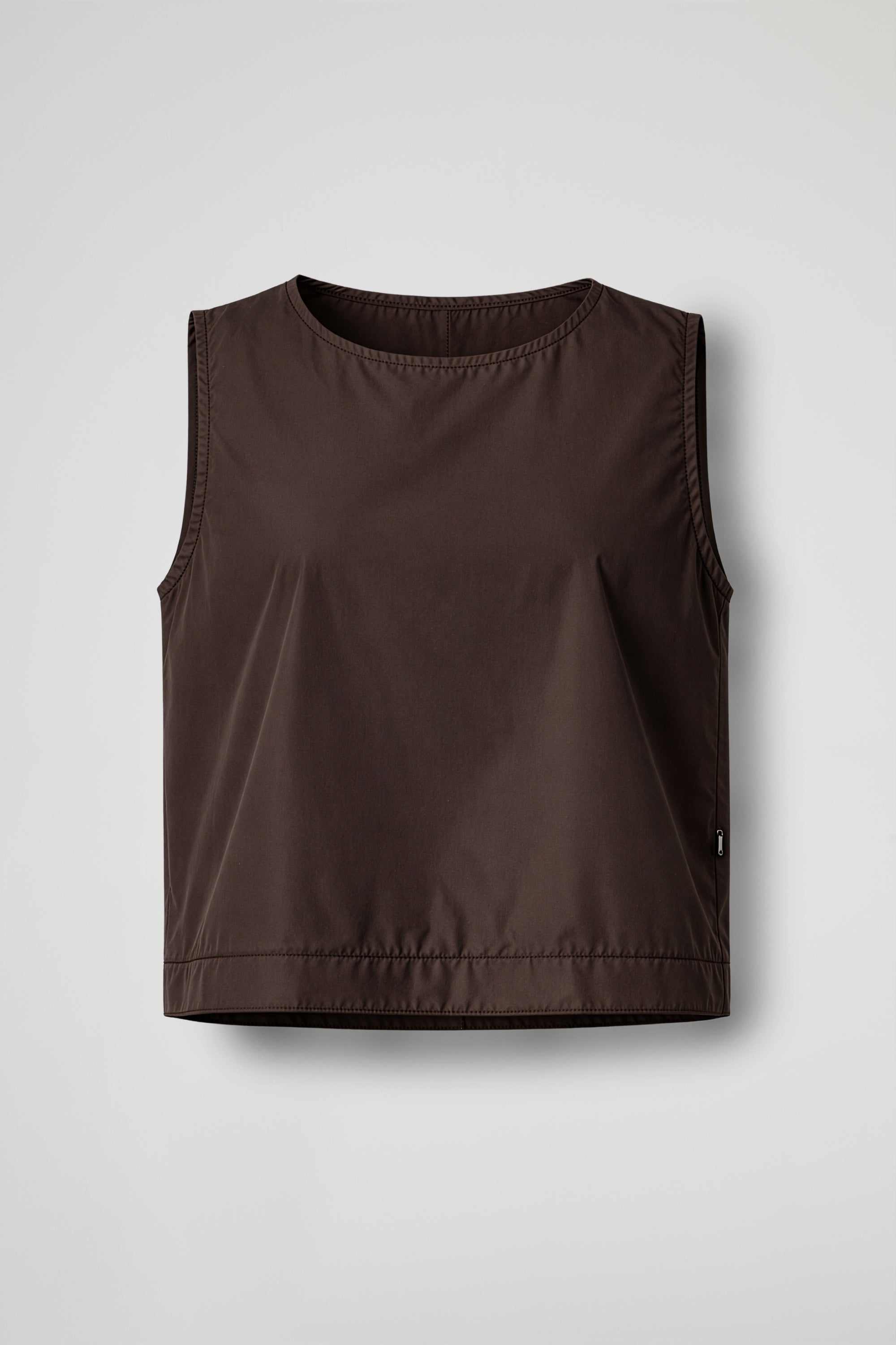 Sleeveless midi top, round neck, boxy fit, slit on the back.