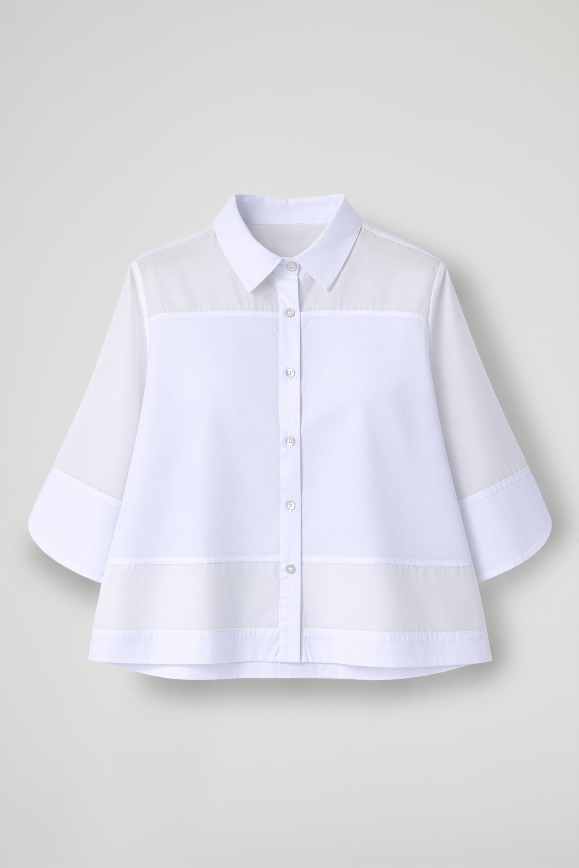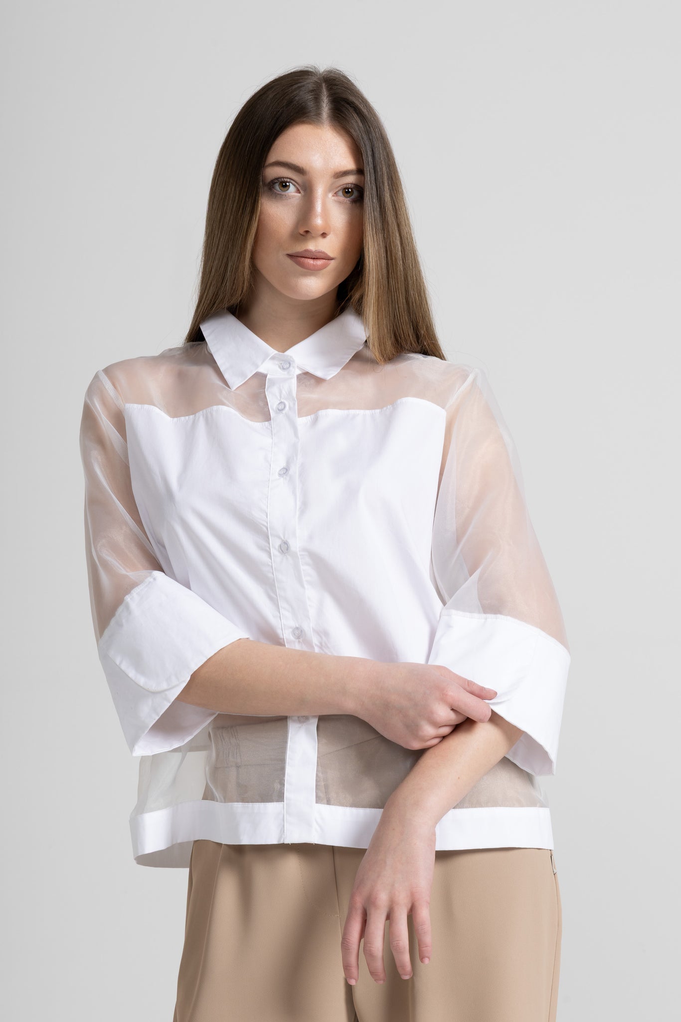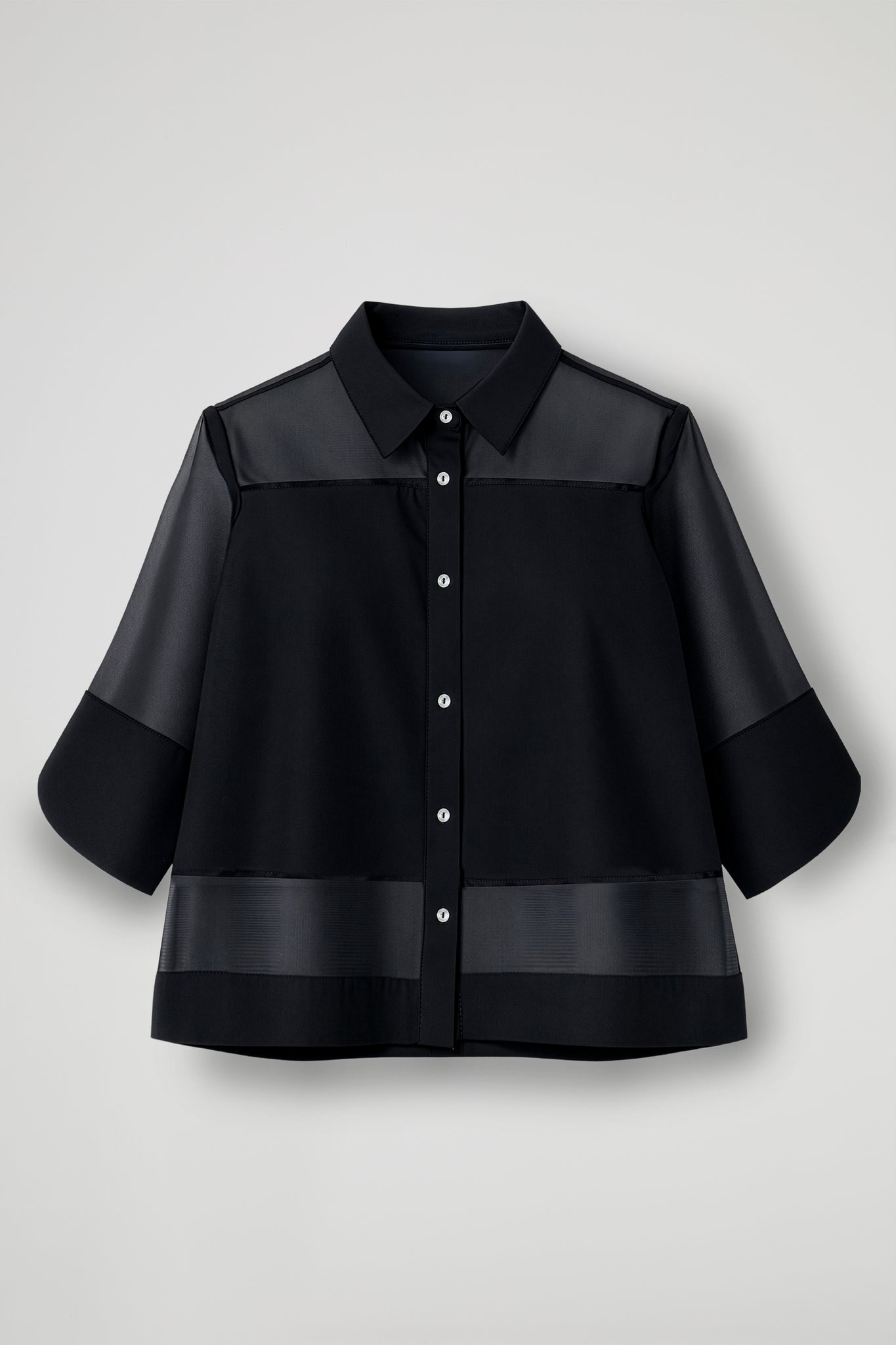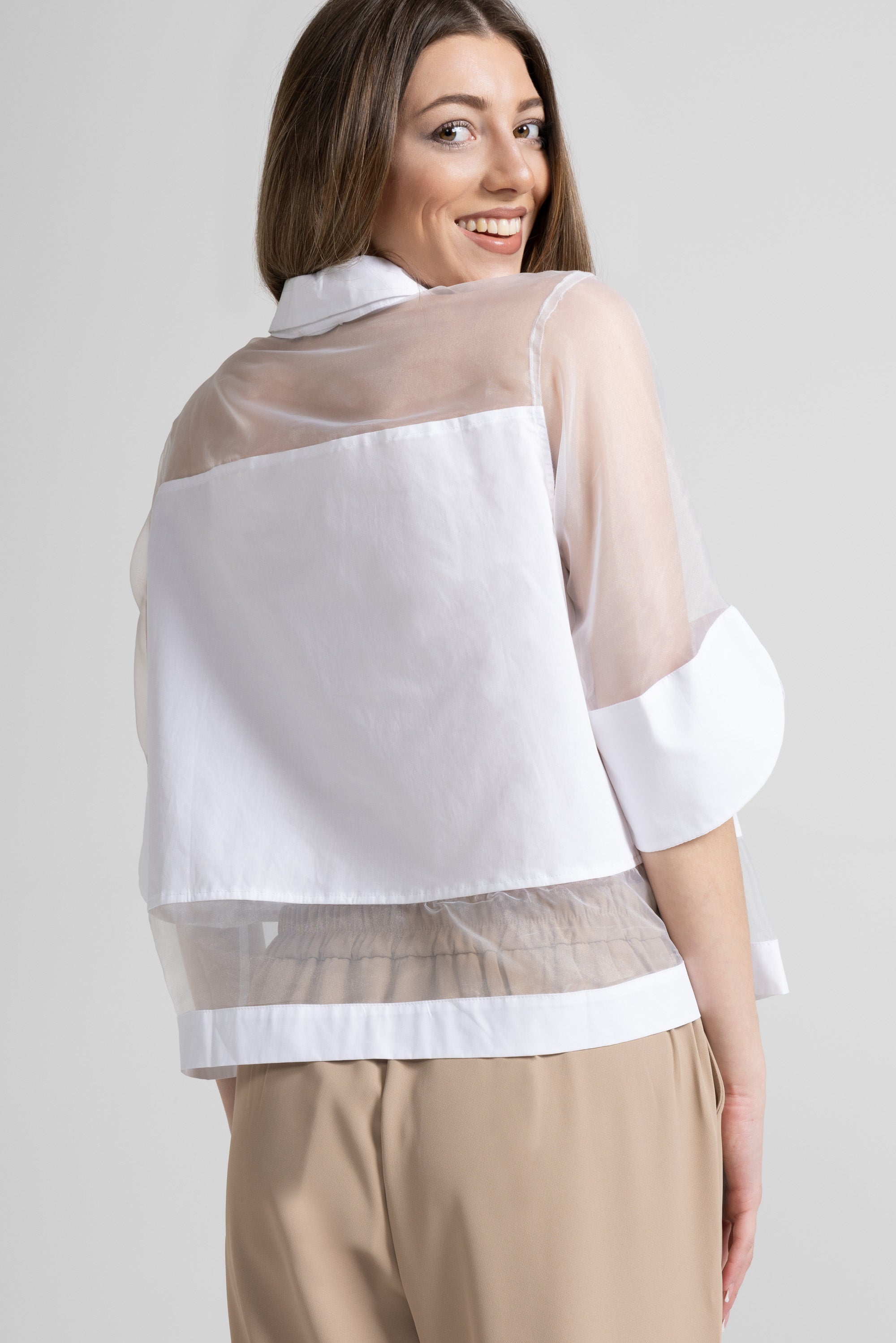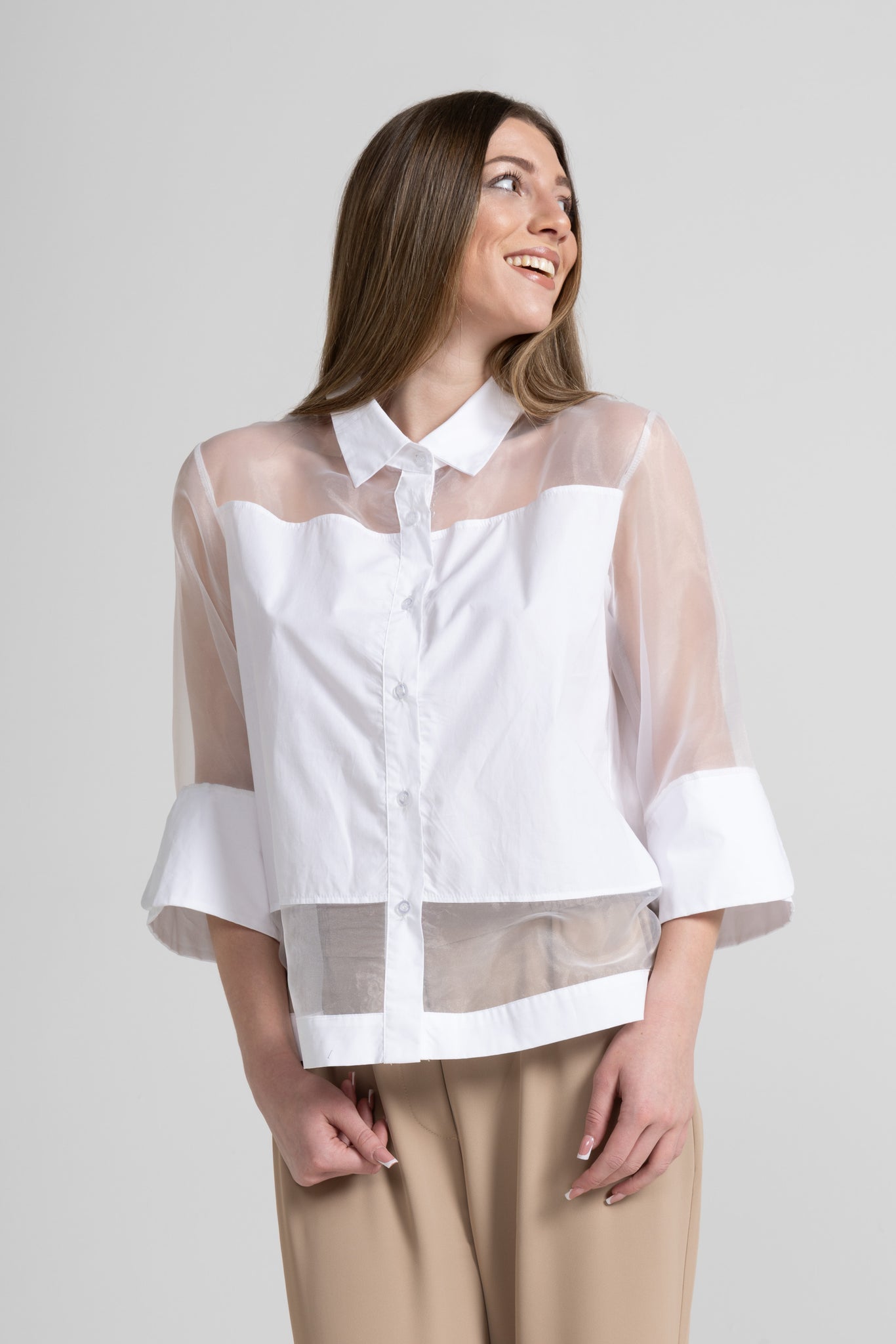 Shirt in organza and cotton poplin fabric, French collar, ¾ sleeves with maxi petal cuff, front fastening with buttons, transparent inserts on the shoulders, sleeves and hem, folded hem.