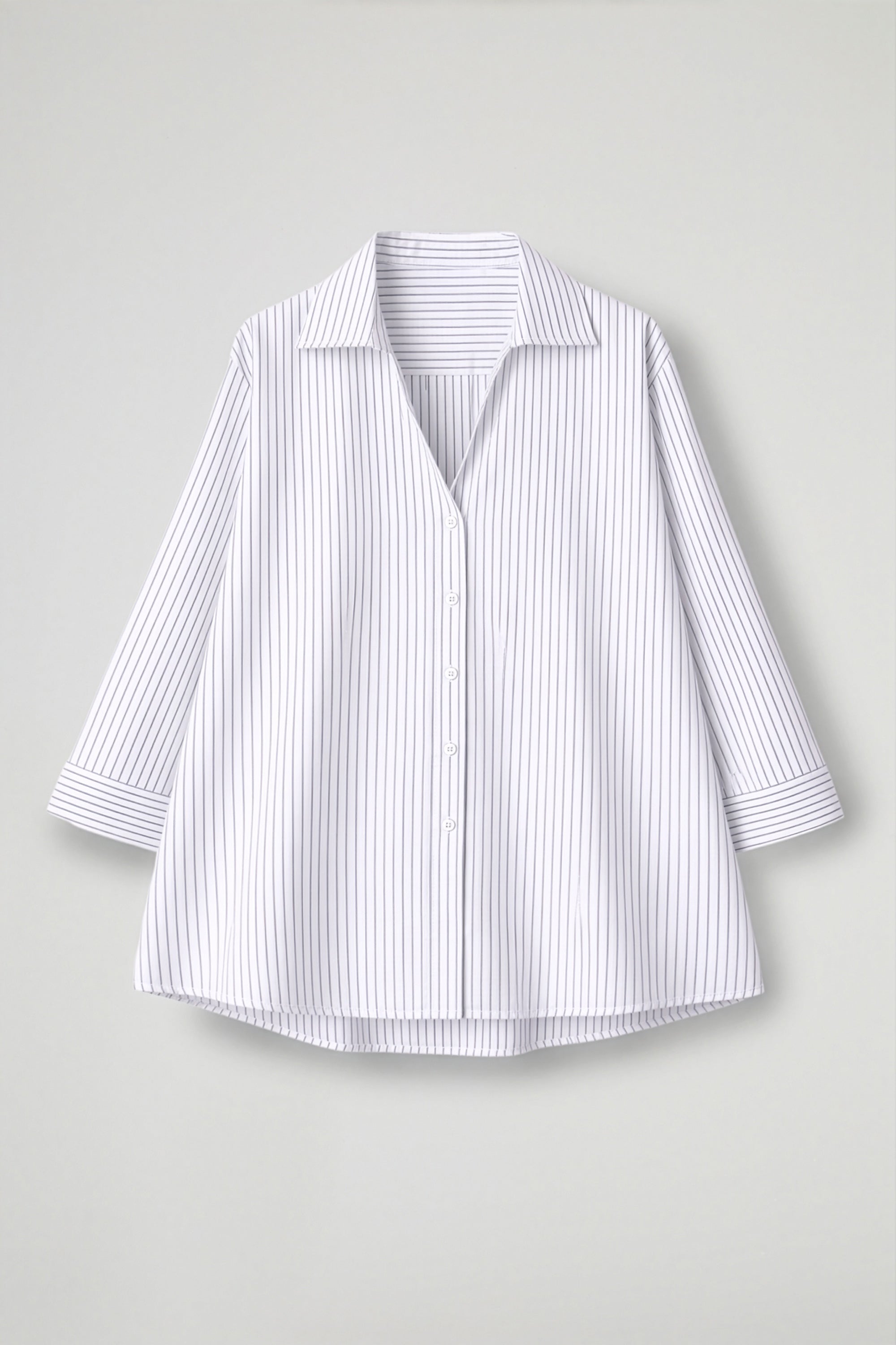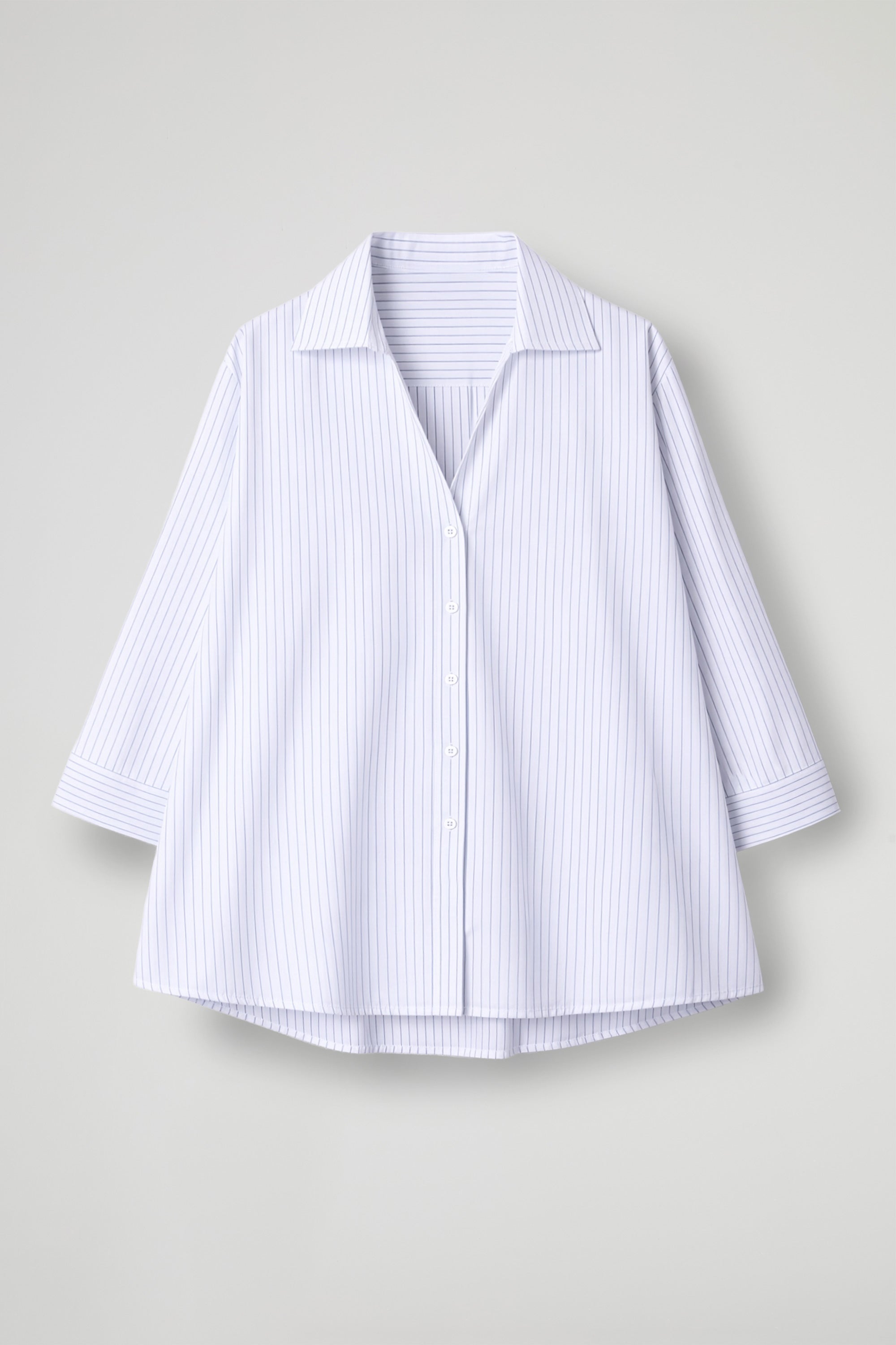 Camicia dal fit morbido, realizzata in tessuto di cotone a righe sottili. La linea è rilassata, con spalla leggermente scesa, la manica è lunga con maxi polsino che la rende contemporanea e insieme al volume pulito la rende perfetta sia infilata nei pantaloni che portata morbida. Sul retro spicca il maxi carré e piega centrale. Un capo versatile, ideale per look da giorno e layering di mezza stagione.