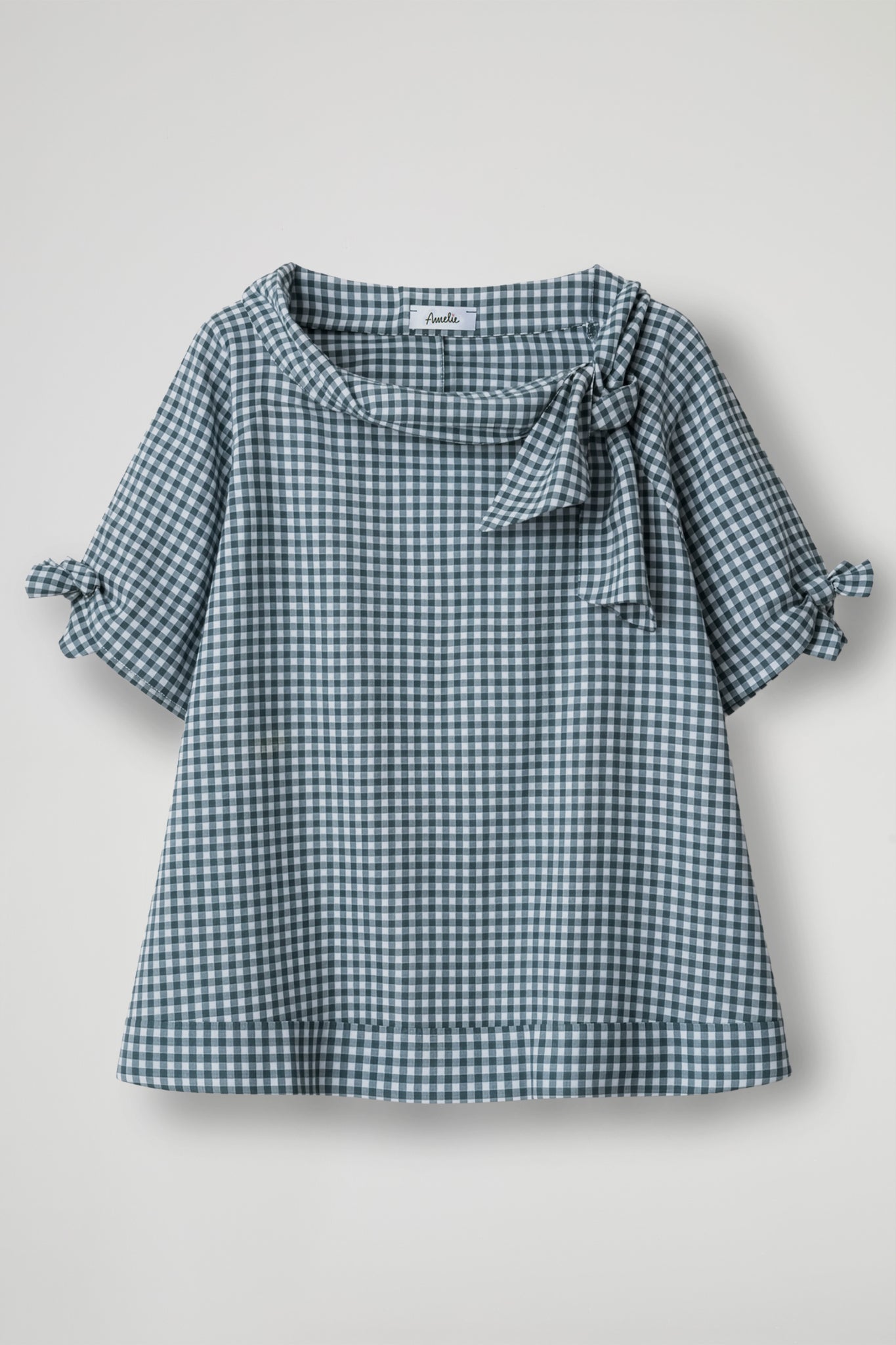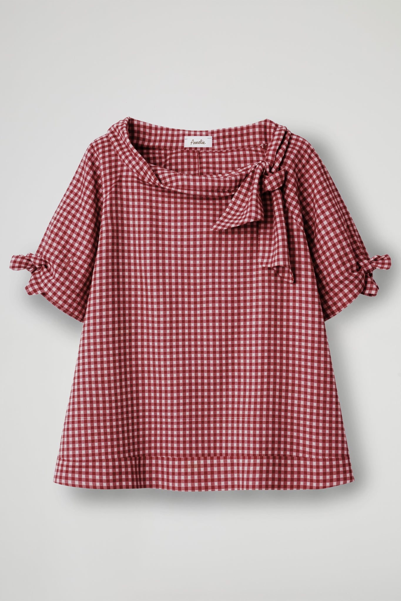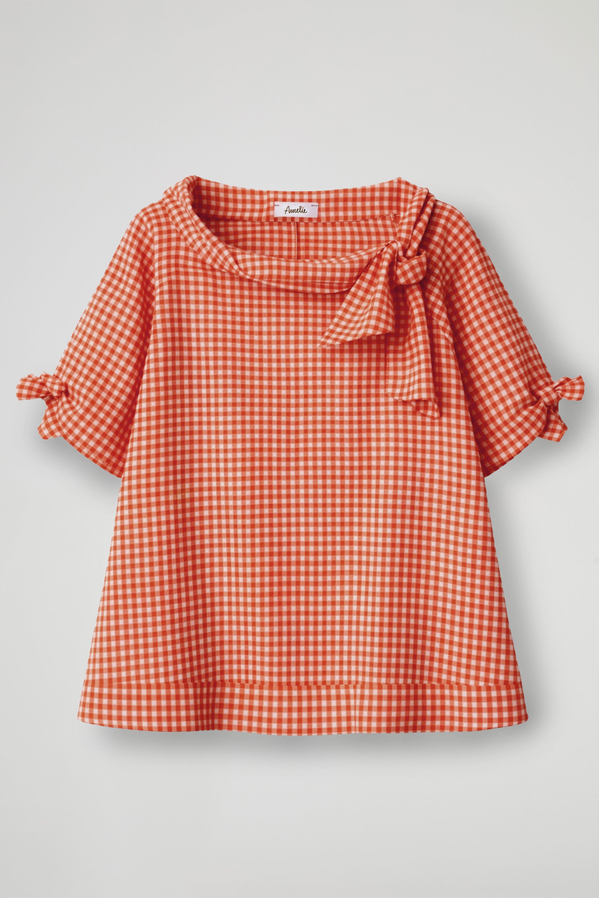 Top in fantasia vichy, collo ampio con fiocco, manica corta con laccetti regolabili, orlo ribattuto alto su fondo, spacchetti laterali. Linea morbida