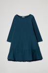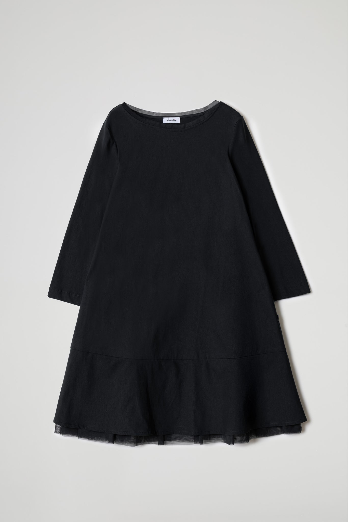 Abito midi in tessuto bengalina di viscosa elasticizzata, girocollo rifinito con inserto in tulle, maniche lunghe , tasche a filo, linea svasata con orlo leggermente asimmetrico, cuciture decorative nella parte bassa, dettaglio tulle sul fondo che aggiunge un tocco di leggerezza e raffinatezza al vestito, conferendogli un look femminile e moderno.