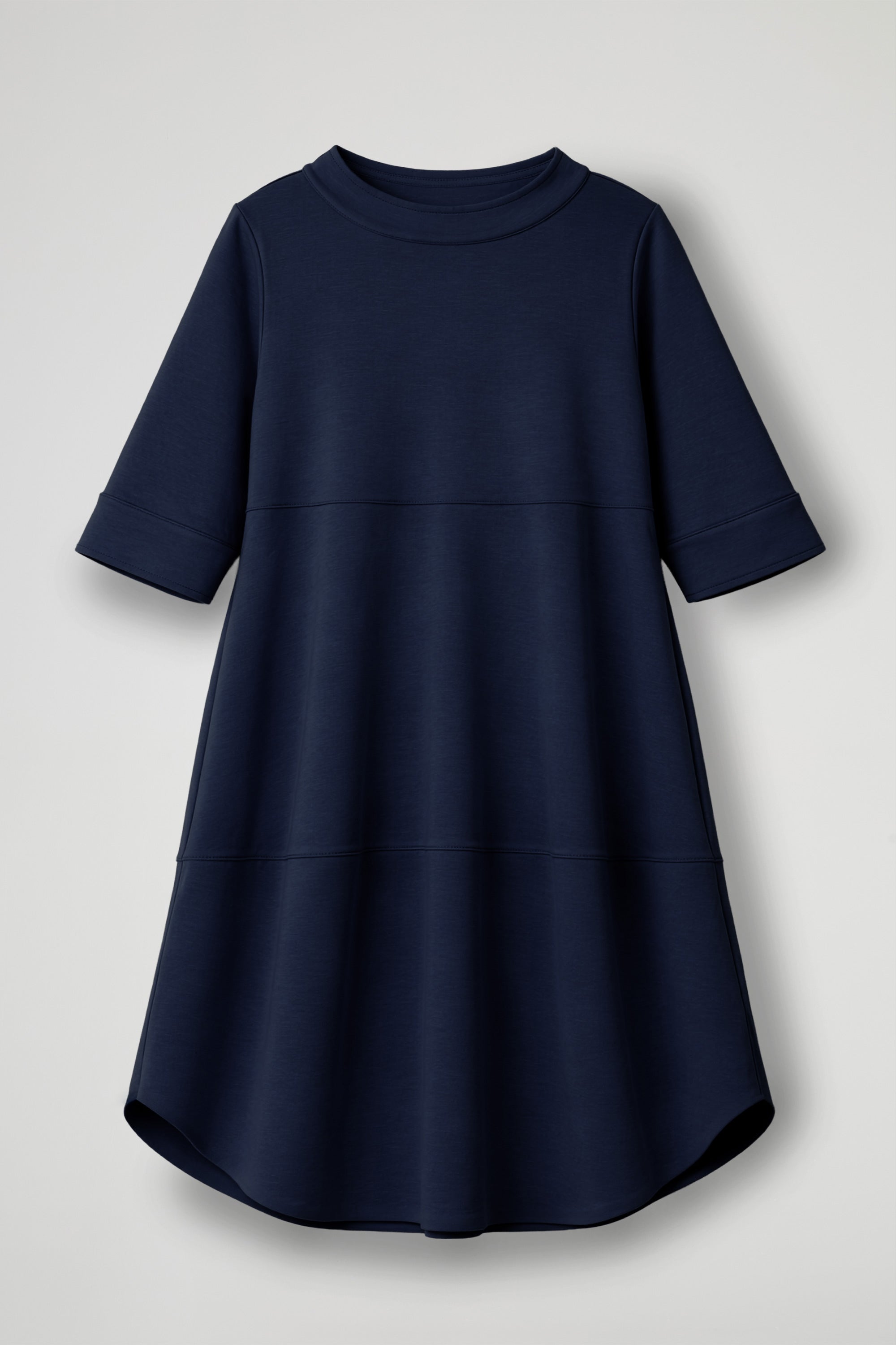 Abito in tessuto fluido, collo ampio e rotondo dall' orlo ribattuto alto, maniche a ¾ con orlo ribattuto alto, tasche a filo, cuciture orizzontali decorative, orlo a petalo sul fondo. Linea