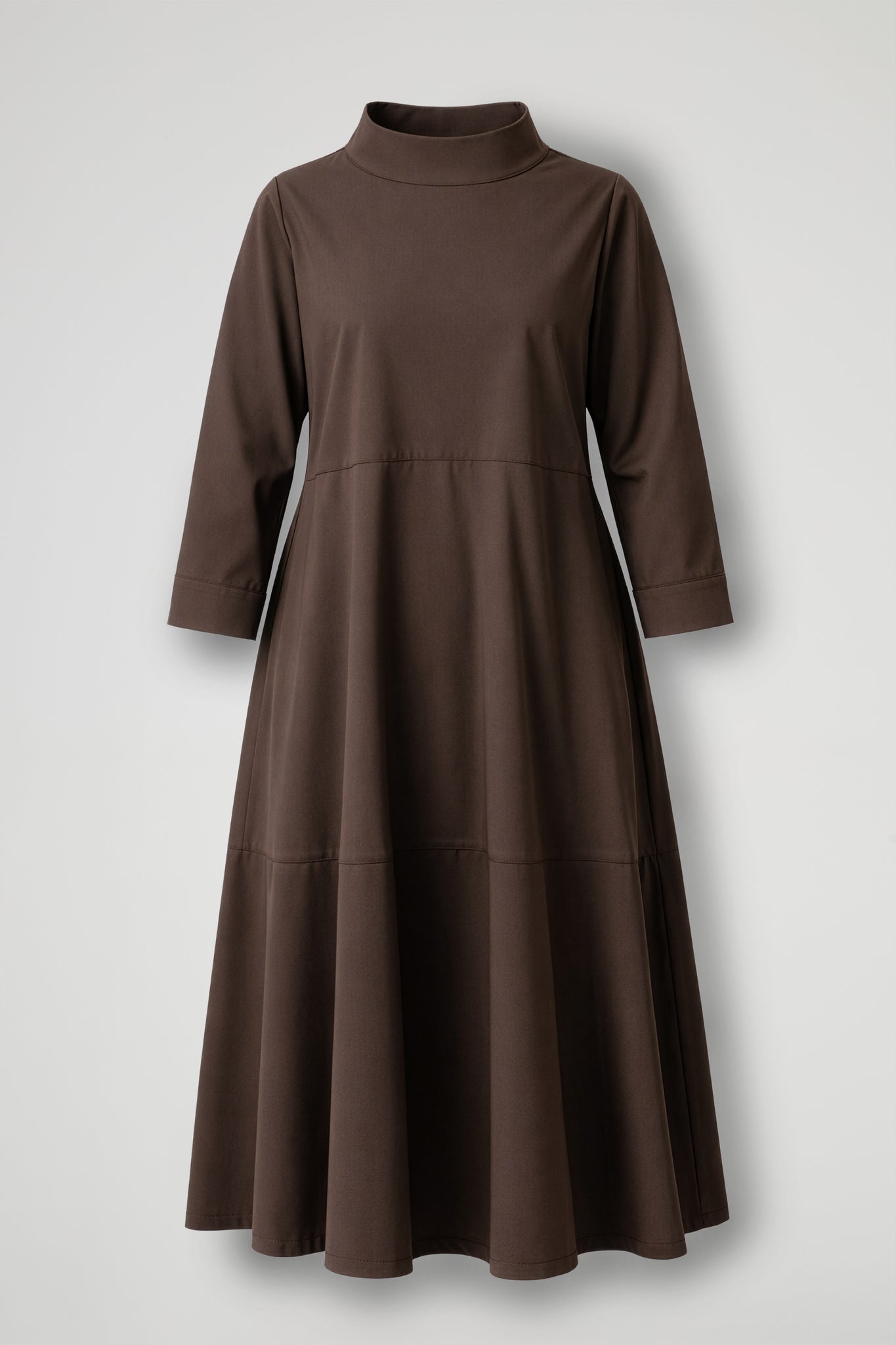 Essenziale e sofisticato, questo abito è il passe-partout perfetto per la mezza stagione; Il collo alto dona un’eleganza pulita, mentre la linea svasata con tagli orizzontali crea movimento e valorizza la figura con una vestibilità morbida e femminile. Le maniche 3/4 lo rendono pratico e versatile.