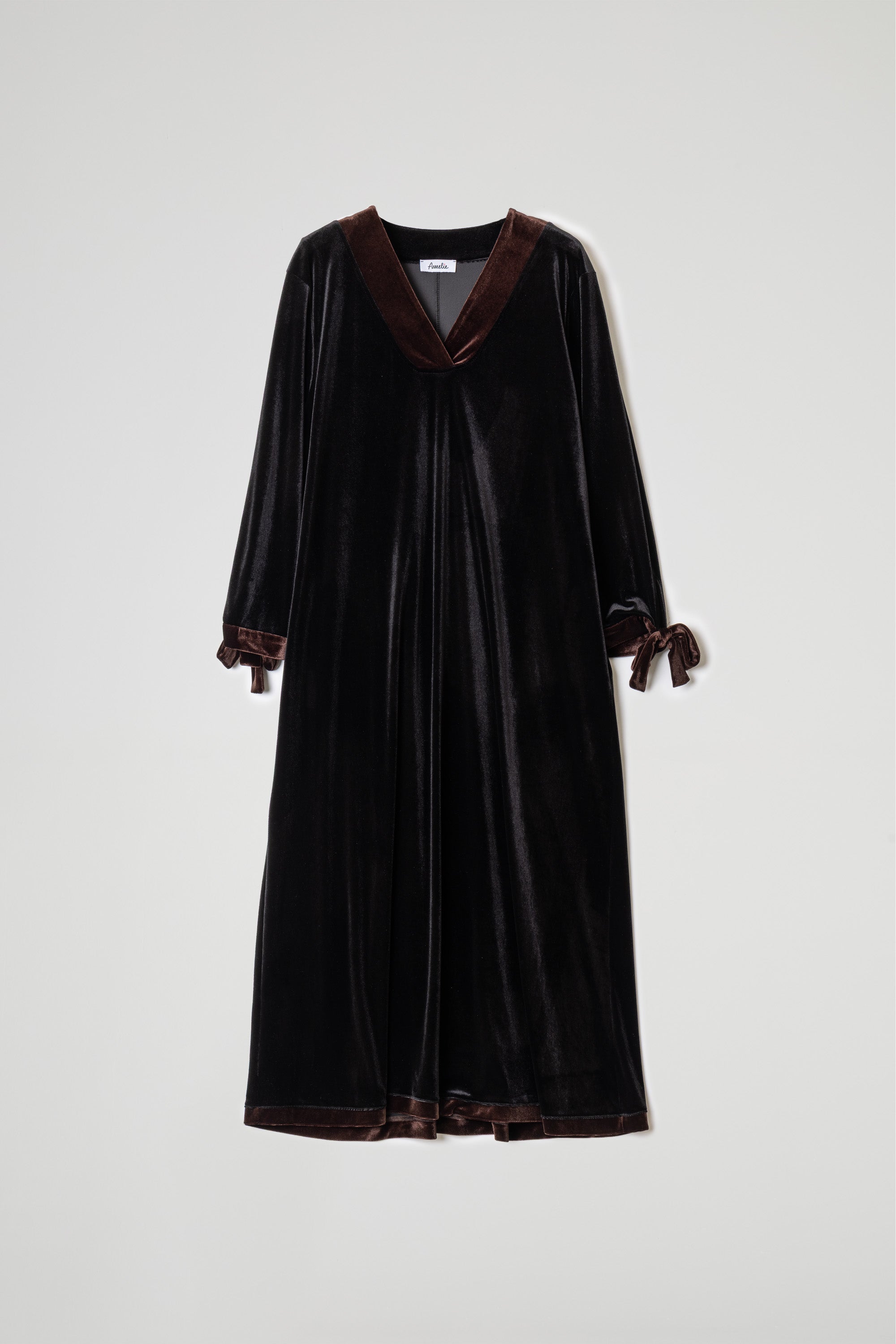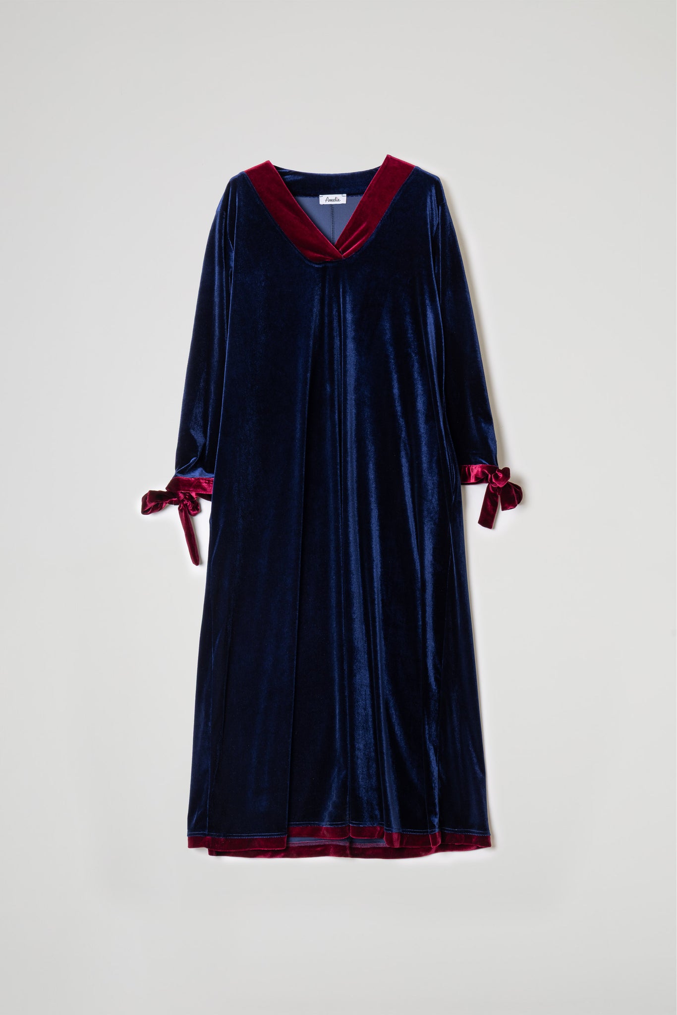 ABITO LUNGO BICOLORE LINEA AD A IN TESSUTO DI VELLUTO ELASTICIZZATO, MANICA LUNGA CON POLSO CON FIOCCO REGOLABILE, SCOLLO A V, DETTAGLIO MINI BALZA COLORE A CONTRASTO SU FONDO, TASCHE A FILO.