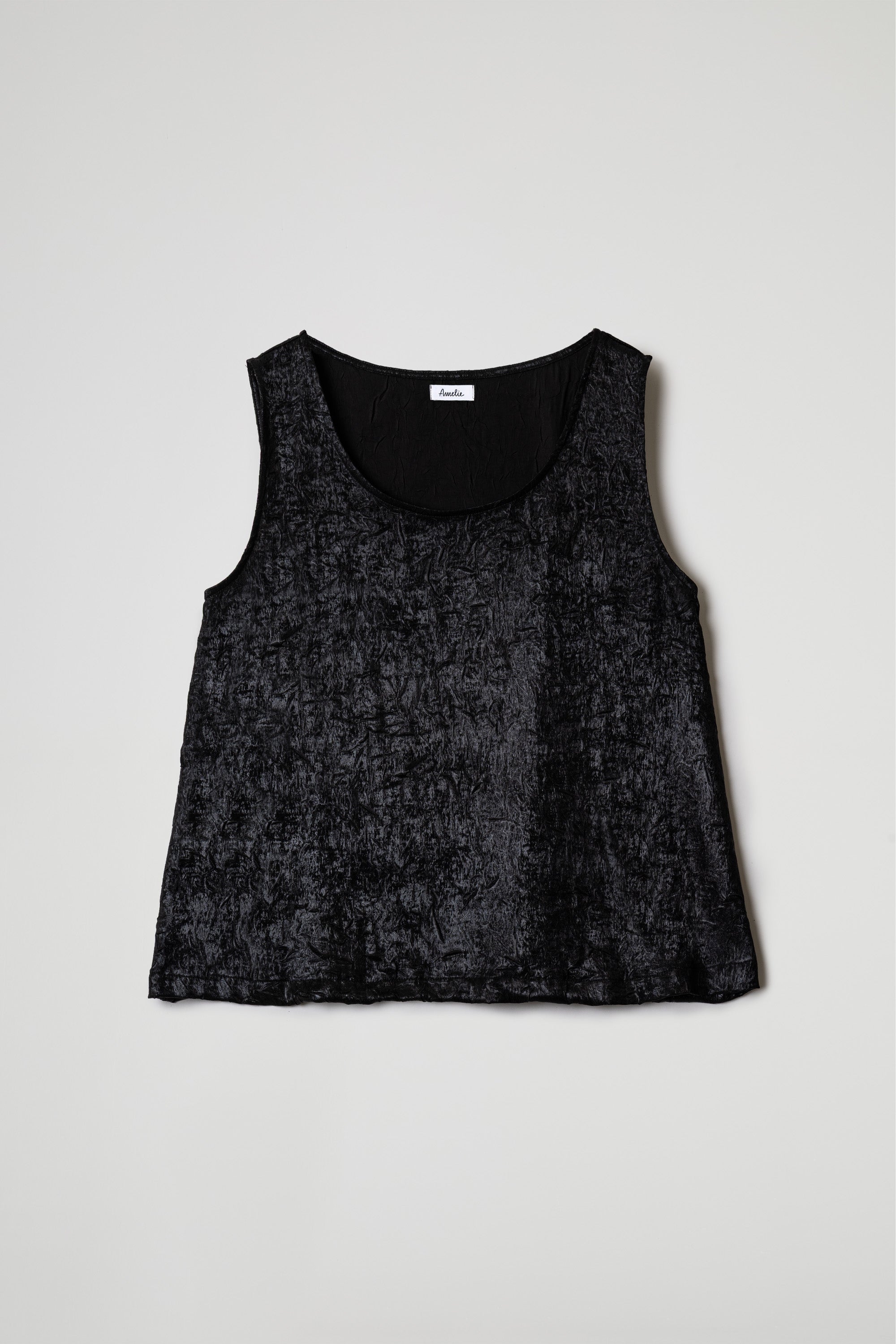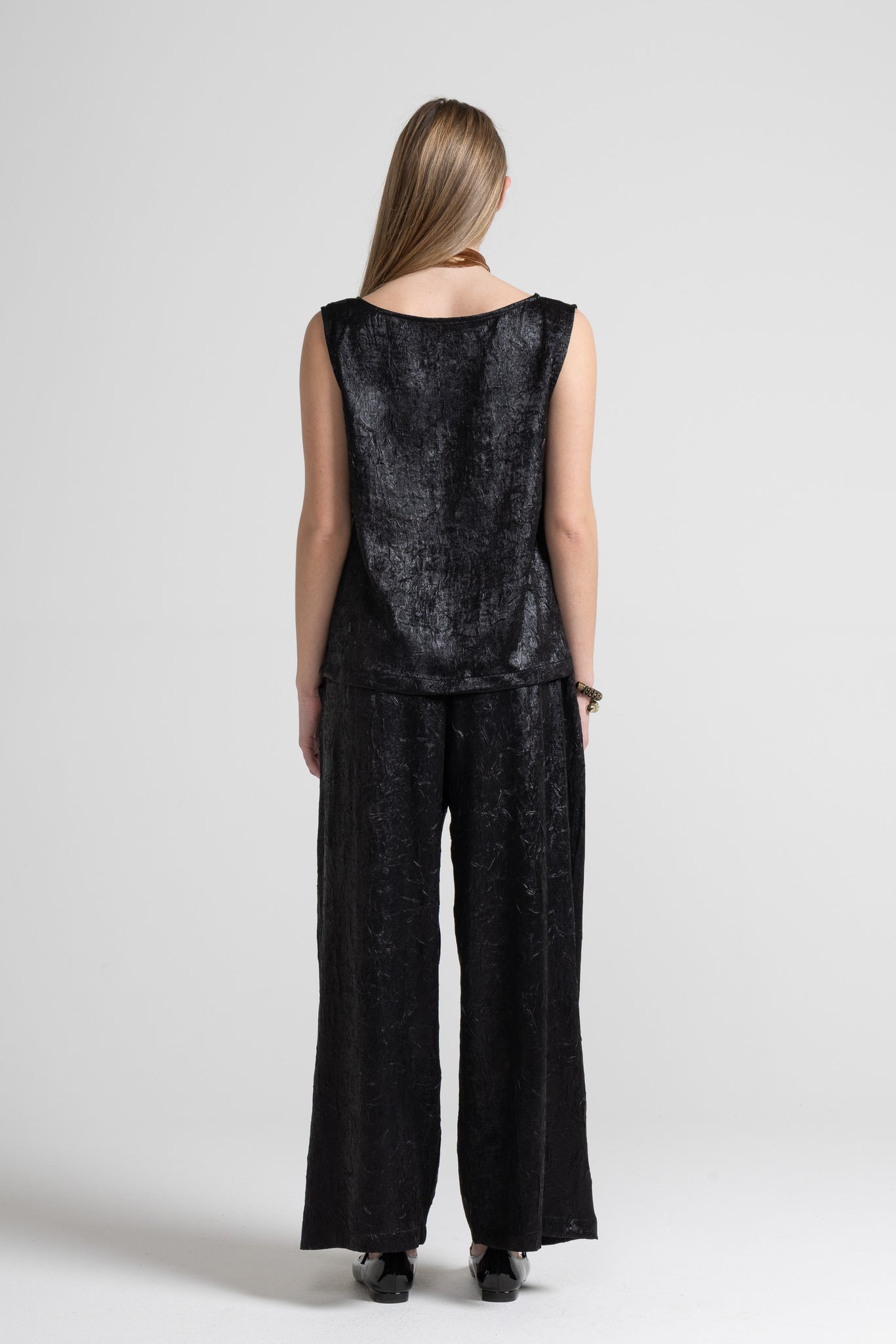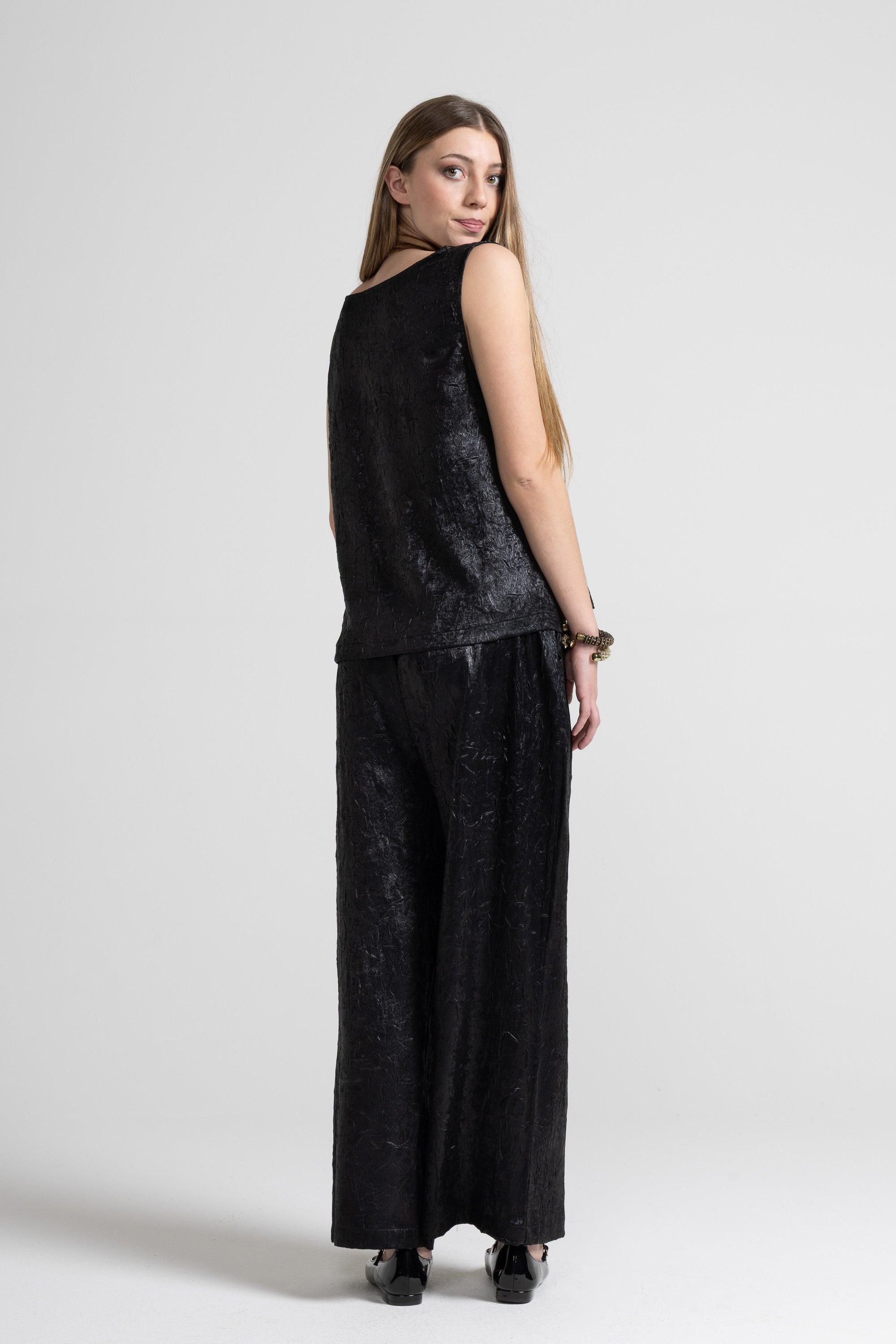 Canotta realizzata in un tessuto spalmato leggero con finitura leggermente lucida. La superficie presenta un elegante effetto stropicciato che aggiunge movimento e carattere al capo, la vestibilità è comoda e svasata, ideale da sovrapporre oppure indossare da sola per un effetto minimal e sofisticato.