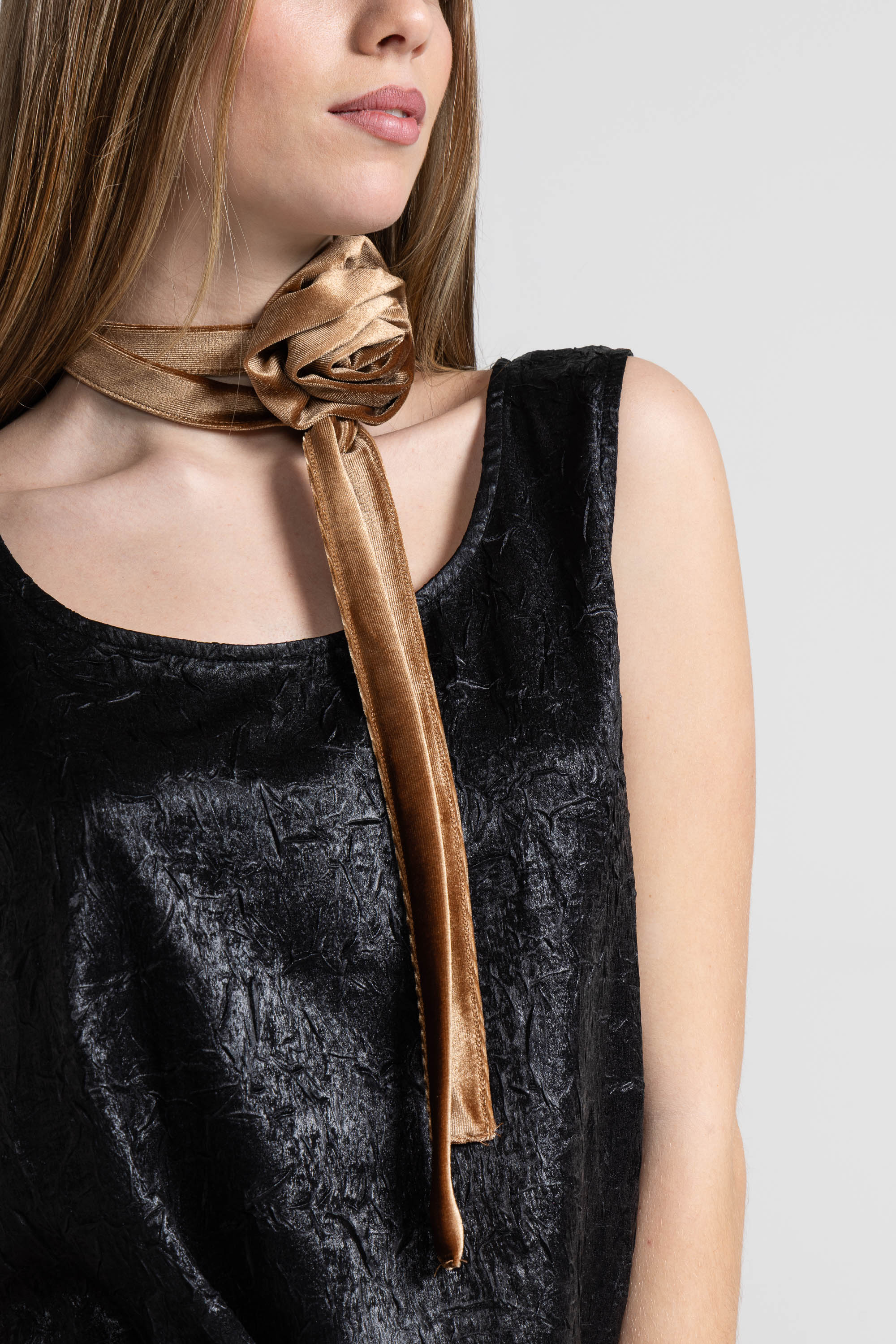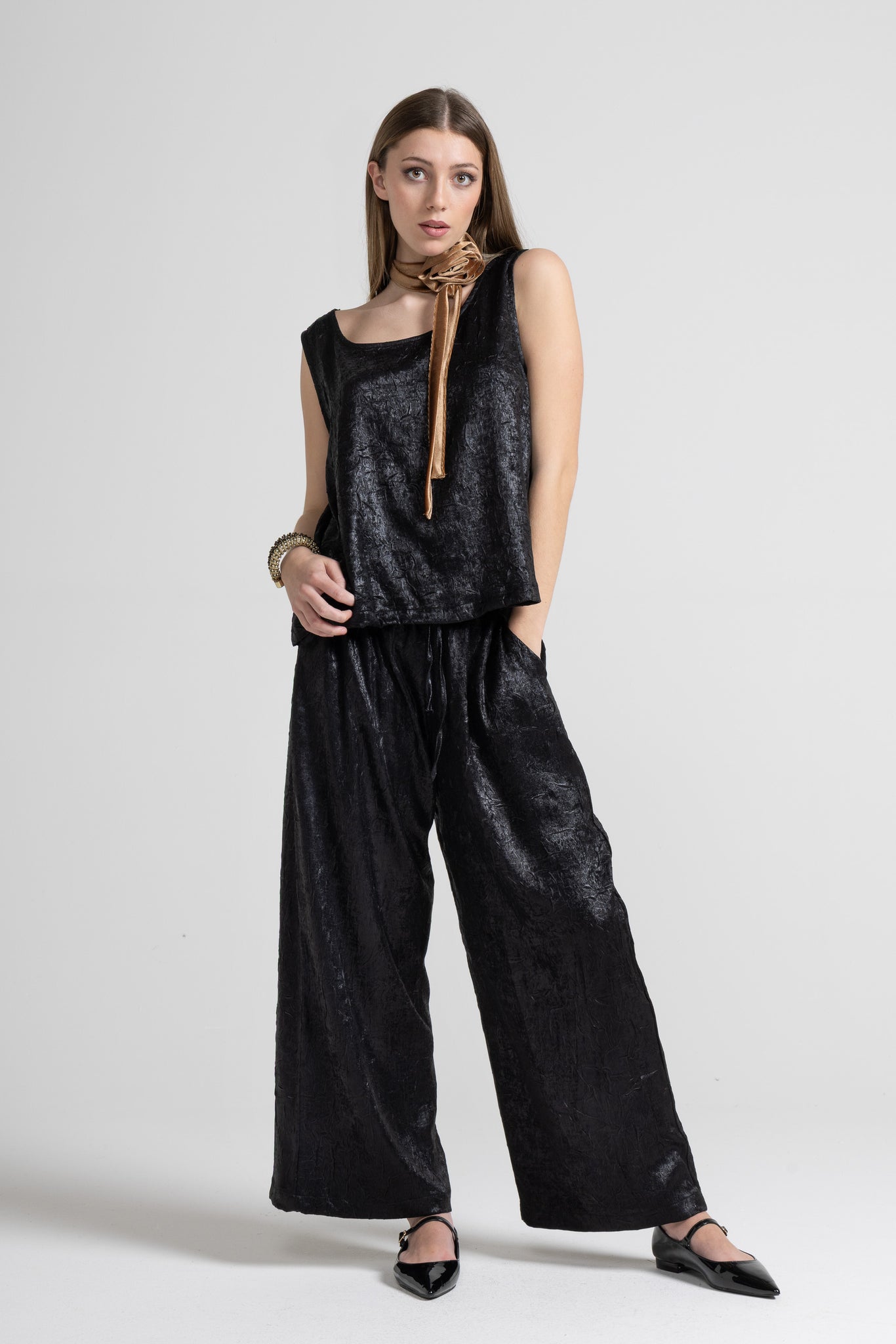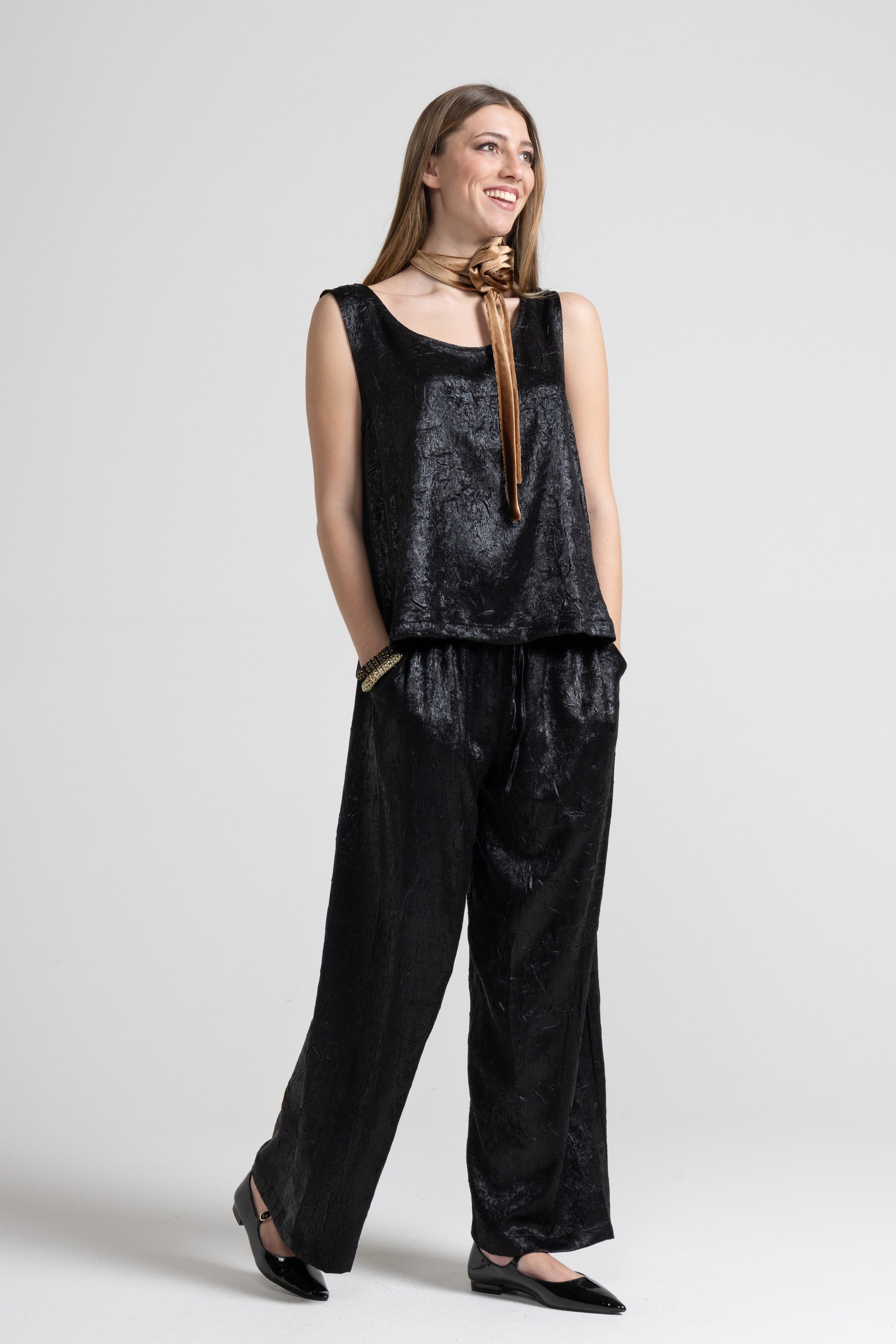 Canotta realizzata in un tessuto spalmato leggero con finitura leggermente lucida. La superficie presenta un elegante effetto stropicciato che aggiunge movimento e carattere al capo, la vestibilità è comoda e svasata, ideale da sovrapporre oppure indossare da sola per un effetto minimal e sofisticato.