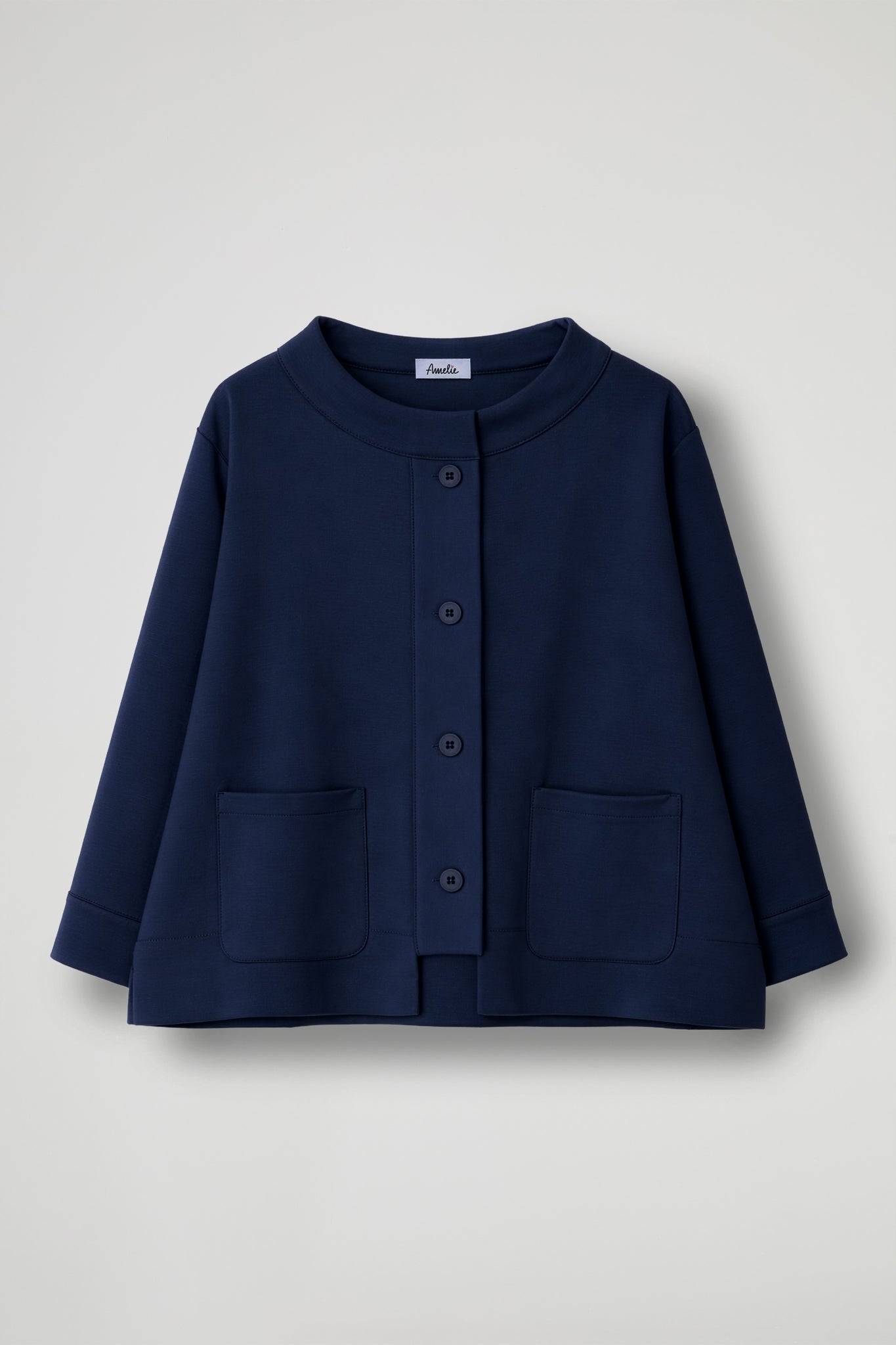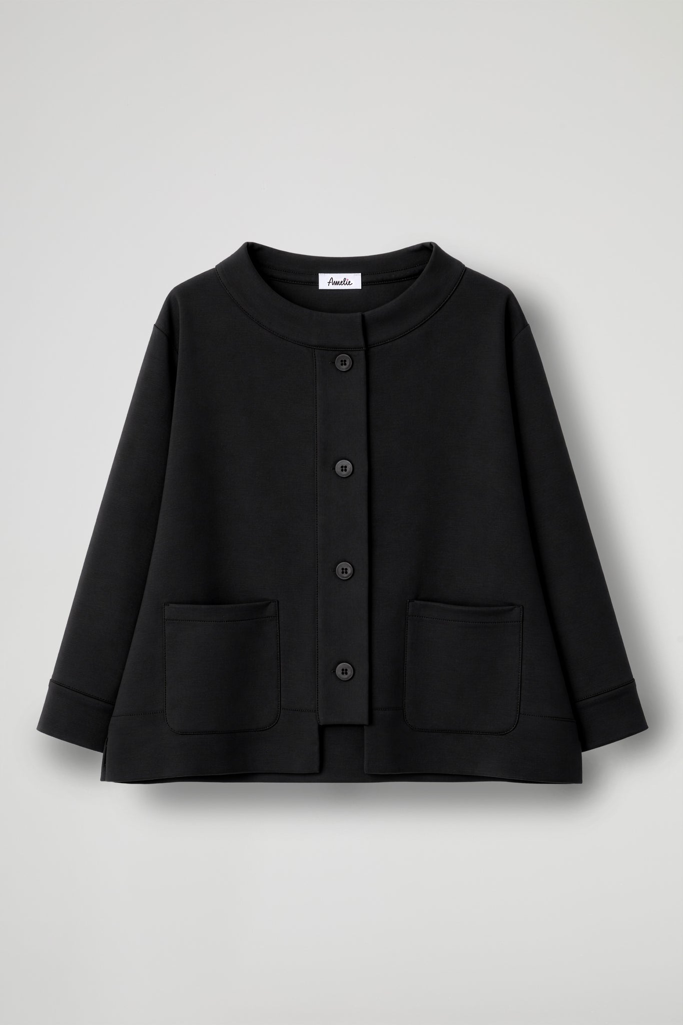 Giacca corta dal carattere raffinato e contemporaneo, perfetta per completare con stile ogni outfit. Realizzata in tessuto strutturato ma confortevole, presenta una linea leggermente svasata che dona movimento e valorizza la silhouette, lo scollo ampio dal taglio pulito aggiunge un tocco sofisticato, mentre la chiusura frontale con bottoni a vista crea un elegante gioco grafico. Le ampie tasche applicate sul davanti uniscono estetica e funzionalità, rendendo il capo pratico oltre che ricercato.