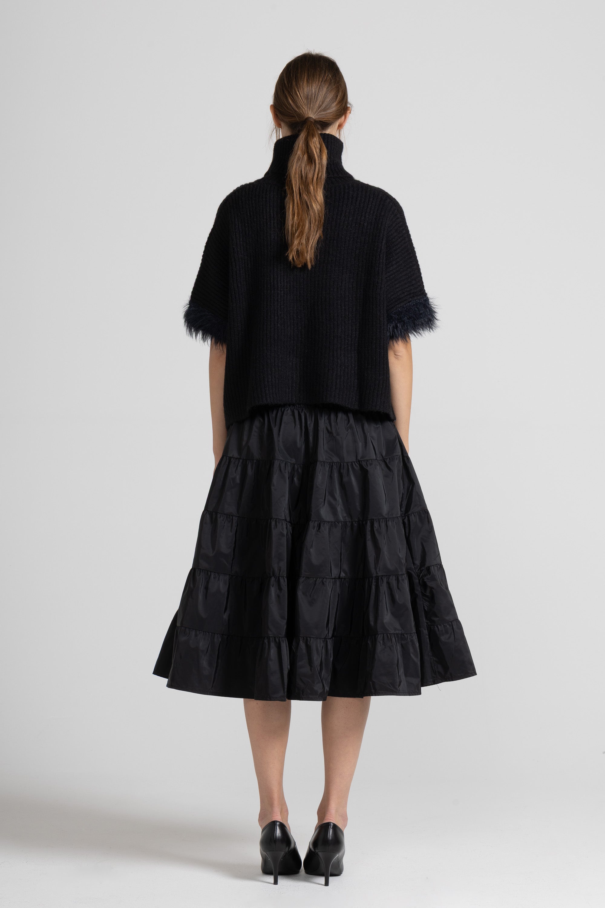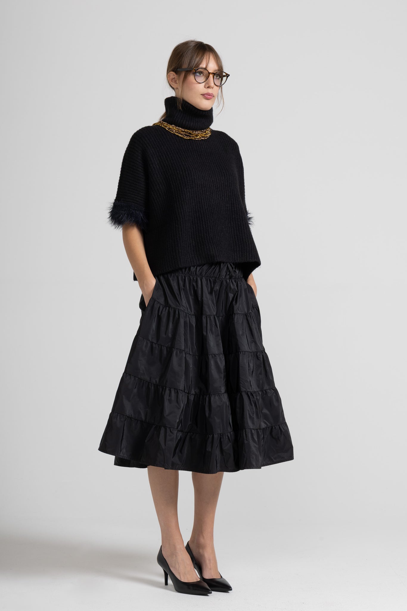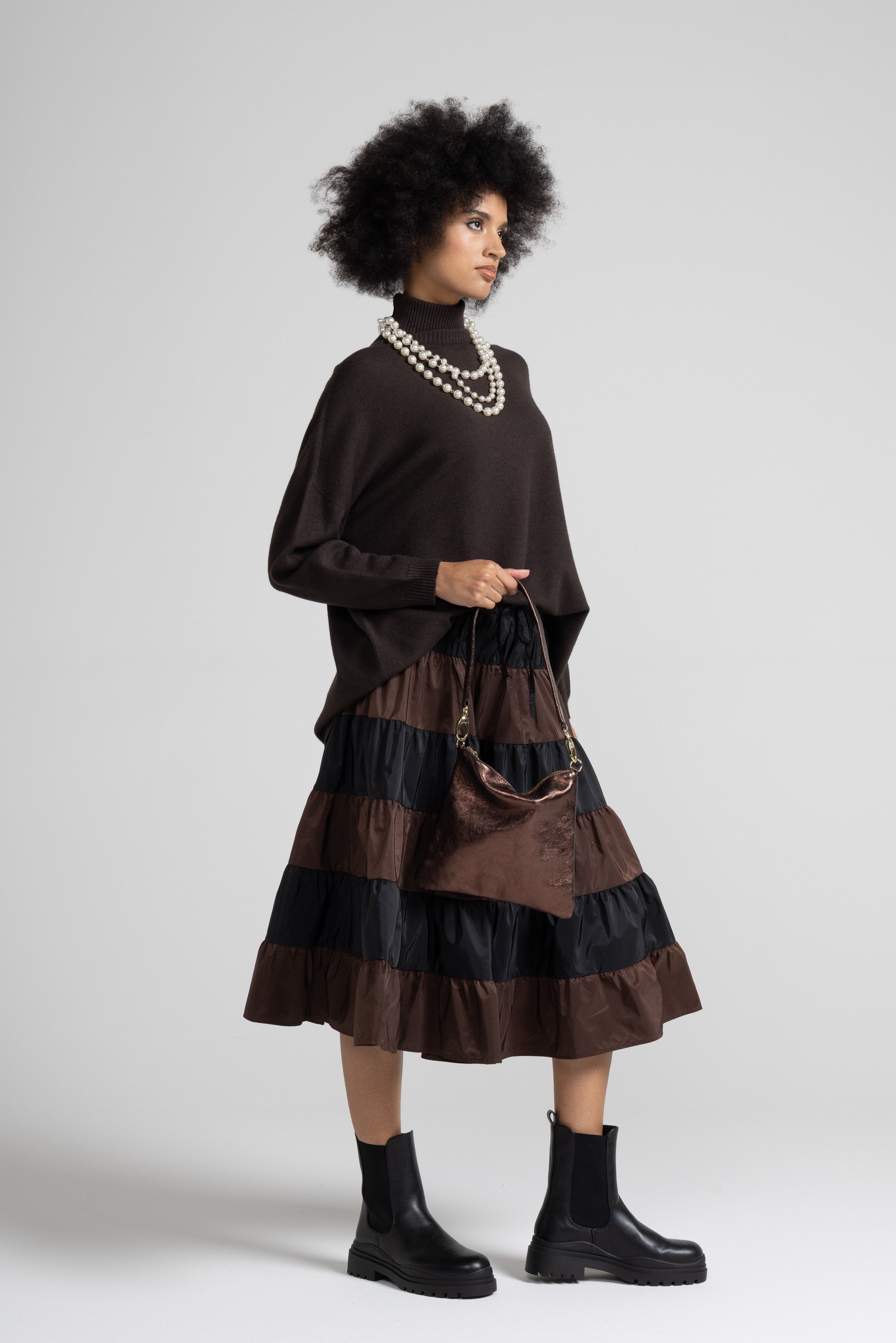 Gonna midi in tessuto taffetà effetto nacrè, vita elastica con piccolo fiocchetto sul davanti, tasche a filo, balze orizzontali arricciate a contrasto colore che regalano volume e dinamismo. Linea ampia e confortevole.