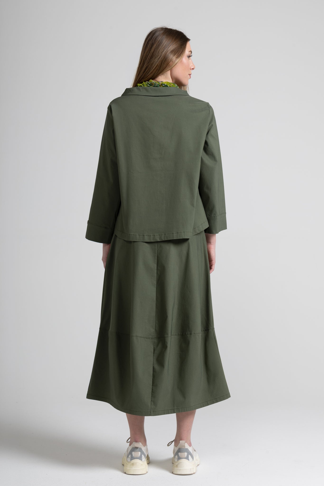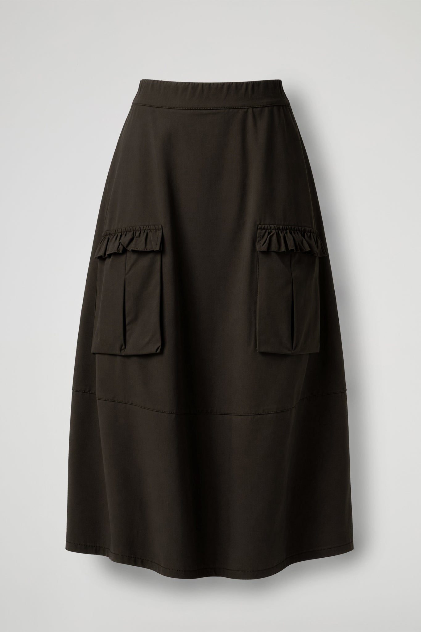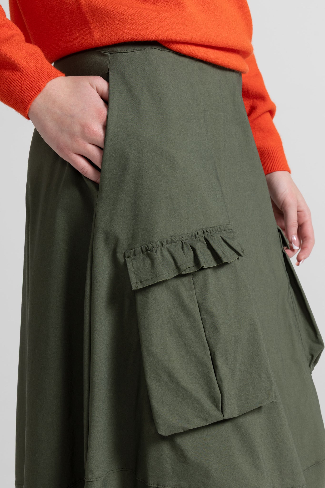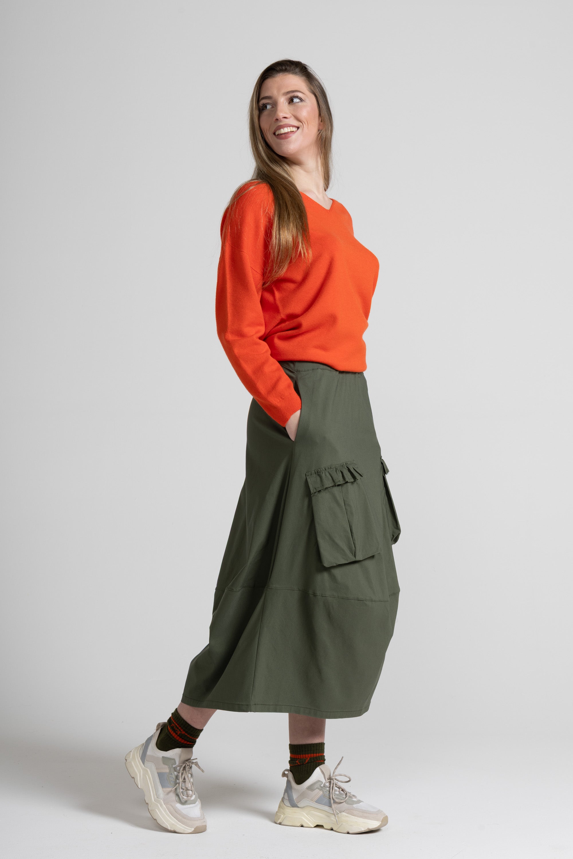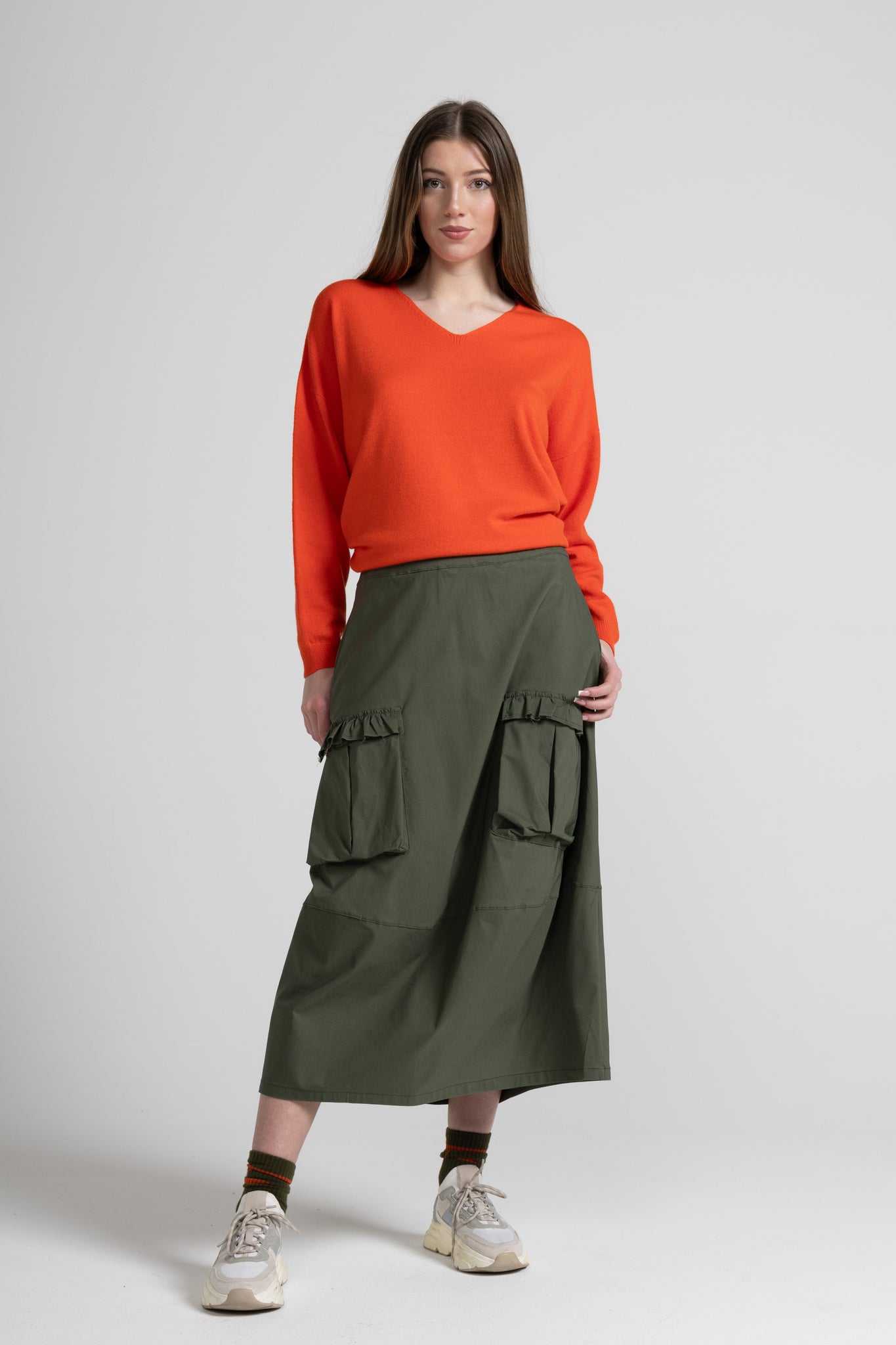 Gonna lunga dalla linea morbida e contemporanea, caratterizzata da un design utility rivisitato in chiave femminile. La silhouette è svasata e scivolata, con vita alta pulita e fascia confortevole. Sul davanti spiccano due maxi tasche applicate in stile cargo, rifinite da una balza arricciata sul bordo superiore che aggiunge un dettaglio delicato. Il modello è completato da un taglio orizzontale nella parte bassa che crea movimento e valorizza la caduta del capo.