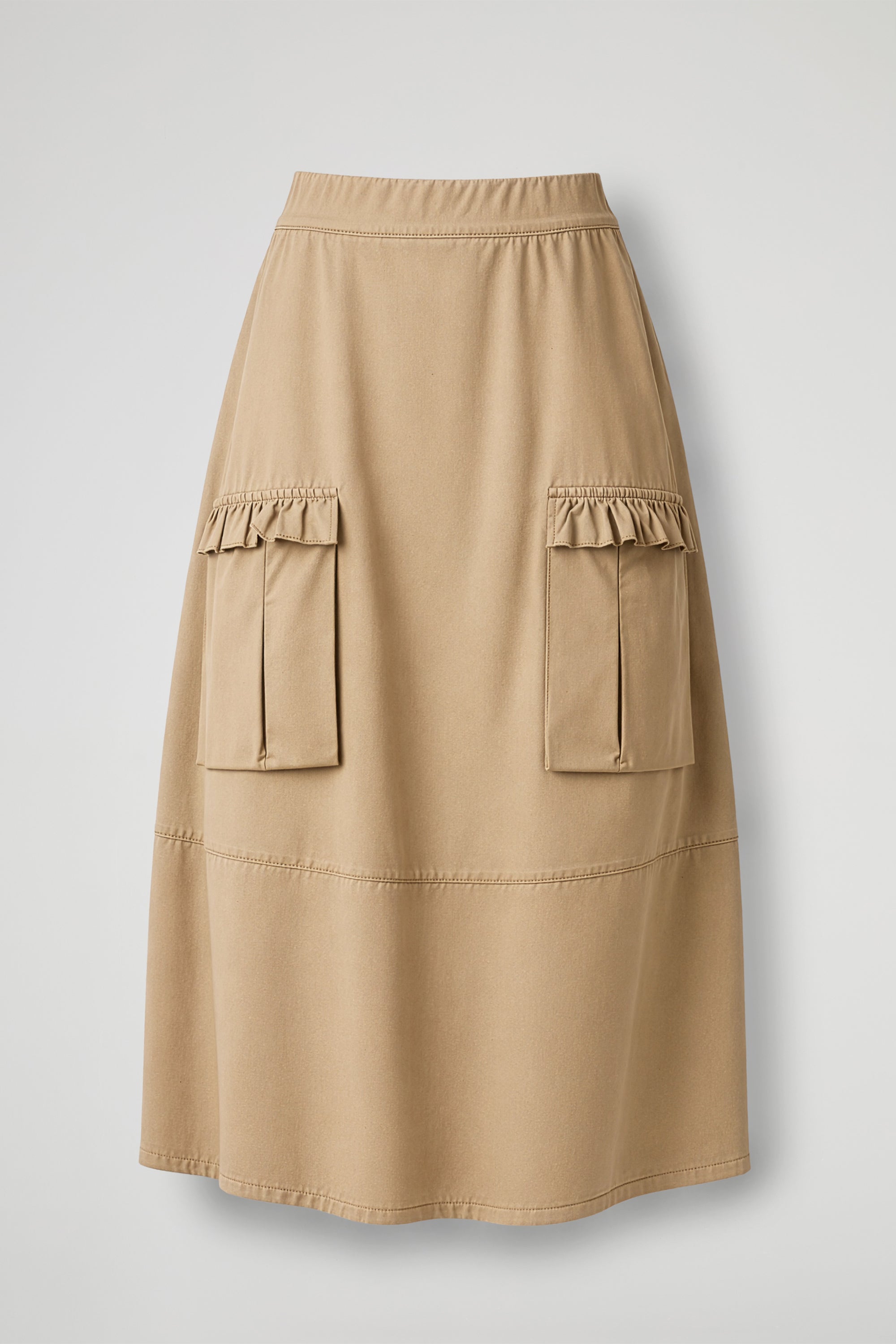 Gonna lunga, fascia alta e elastica in vira, 2 tasche applicate sul davanti con dettaglio balza arricciata, taglio orizzontale sul fondo. Linea ampia