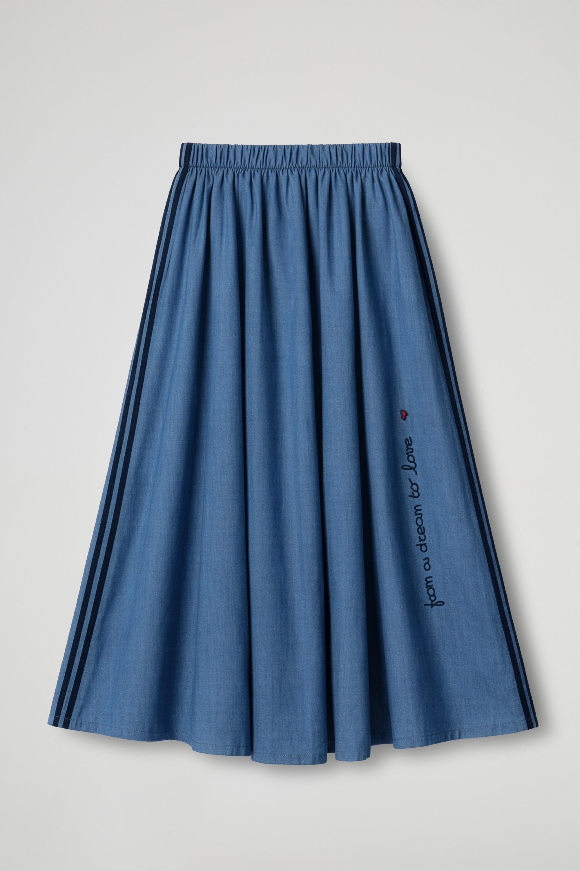Gonna in tessuto denim, elastico in vita, tasche a filo, dettaglio banda laterale a contrasto, ricamo "from a dream to love" su lato, taglio a trapezio. Linea ampia.